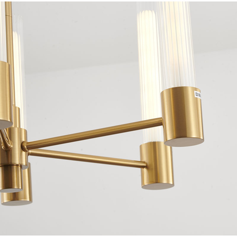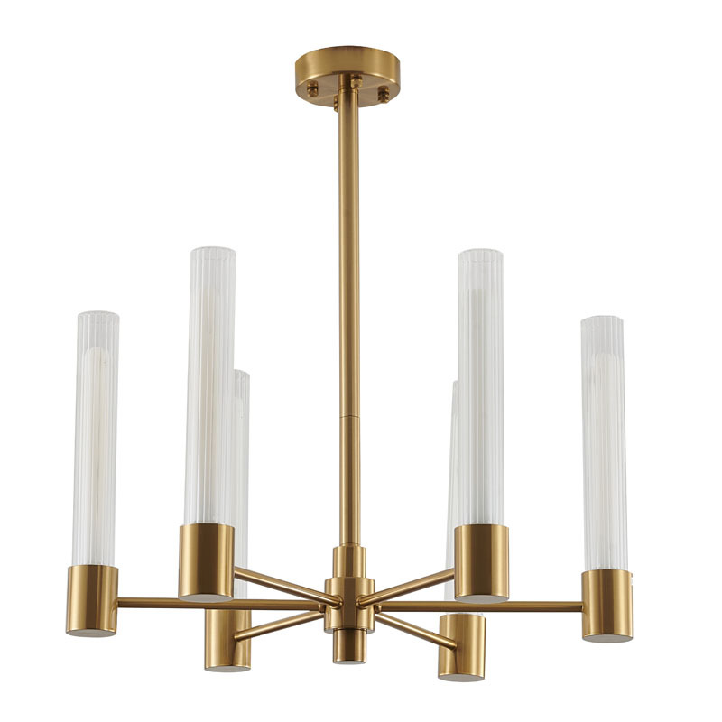 A BRASS FRAME CHANDELIER WITH RIBBED CLEAR GLASS SHADES