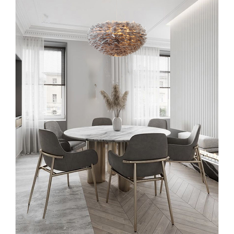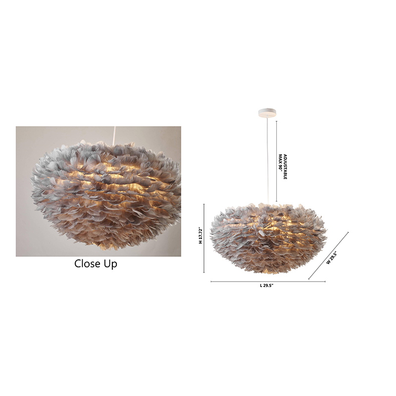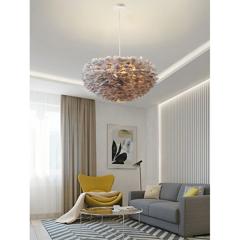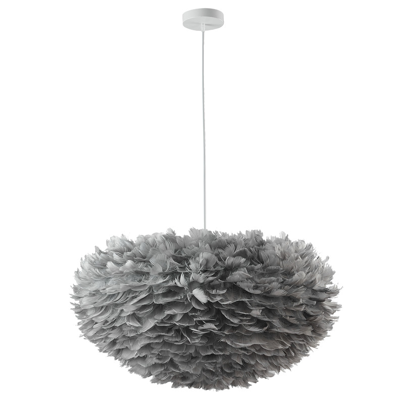 A LIGHT GREY GOOSE FEATHER BALL CEILING FIXTURE WITH A WHITE IRON FRAME