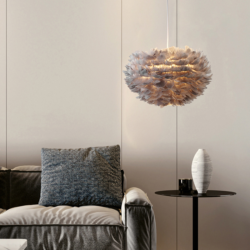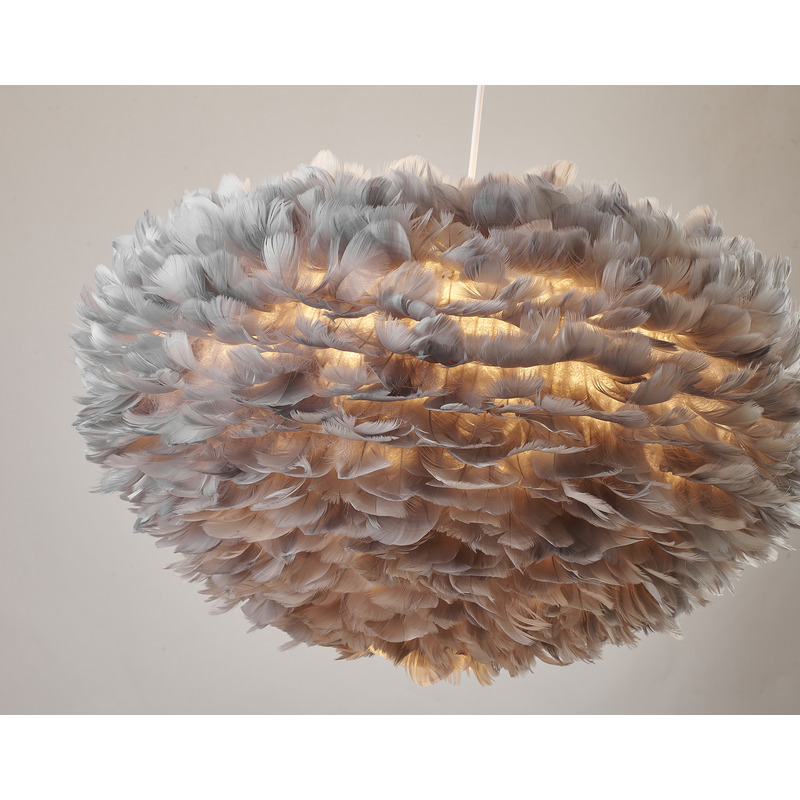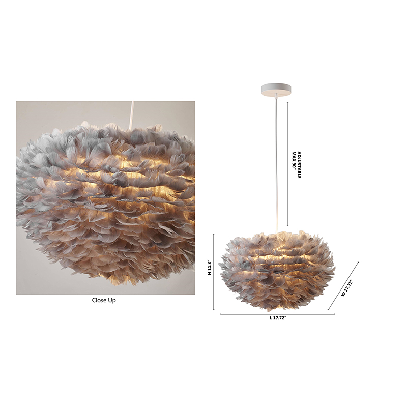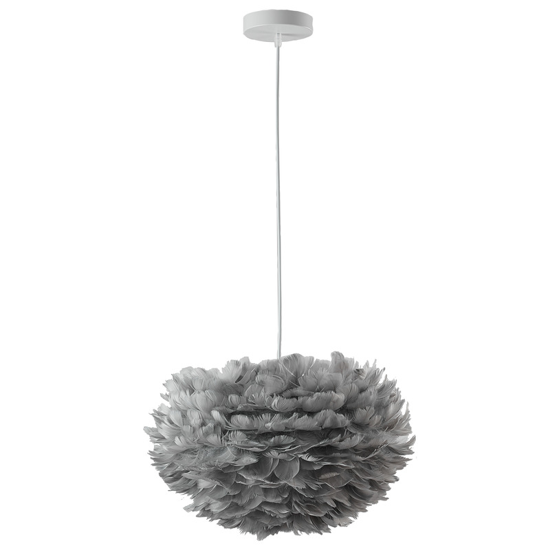 A LIGHT GREY GOOSE FEATHER BALL CEILING FIXTURE WITH A WHITE IRON FRAME