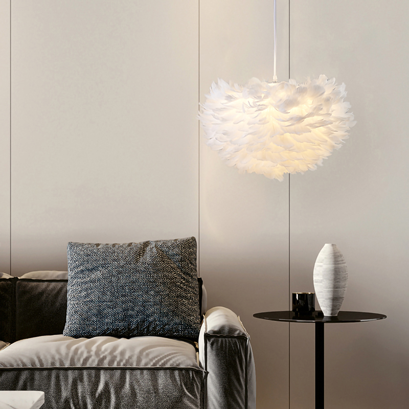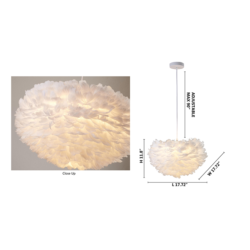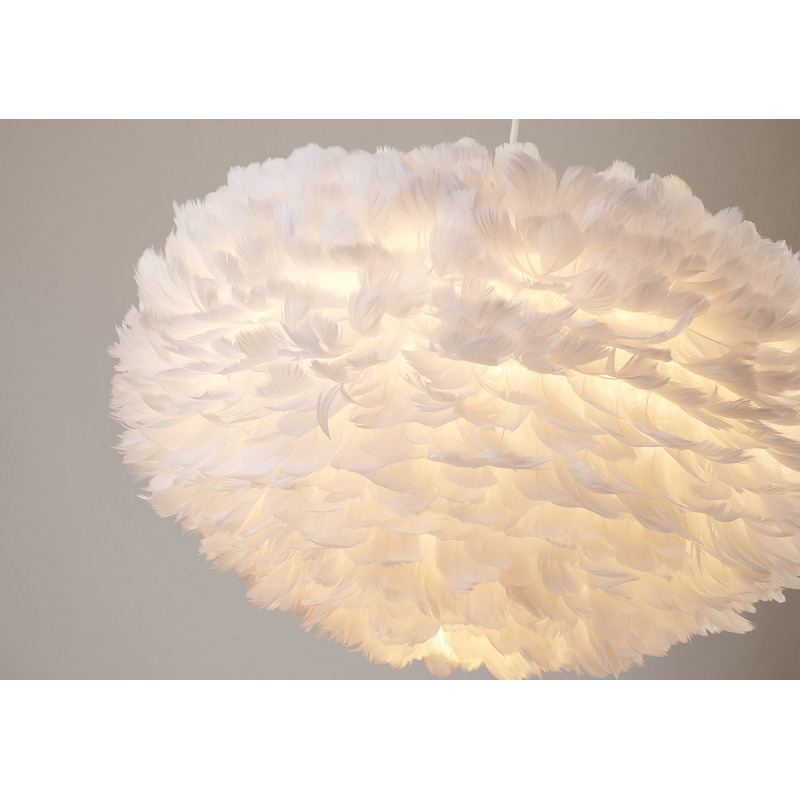 A WHITE GOOSE FEATHER BALL CEILING FIXTURE WITH A WHITE IRON FRAME