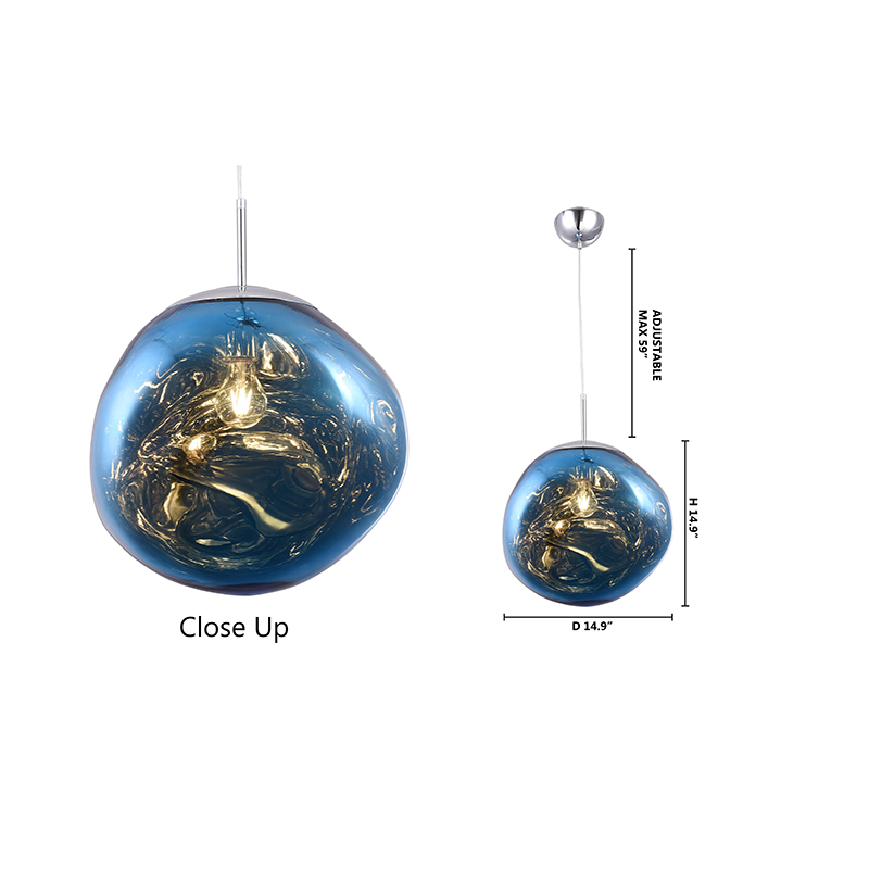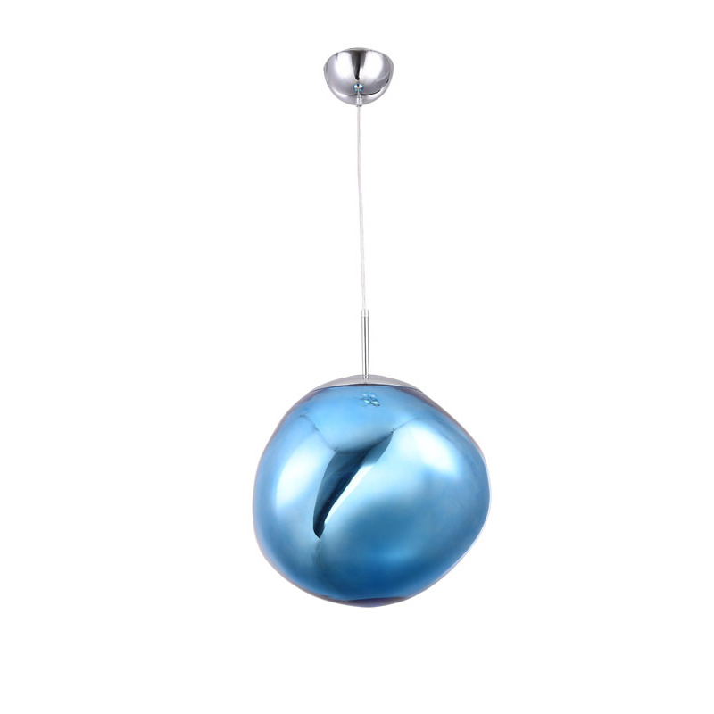 A SINGLE PENDANT BLUE ACRYLIC ORB LIGHT WITH CHROME HARDWARE