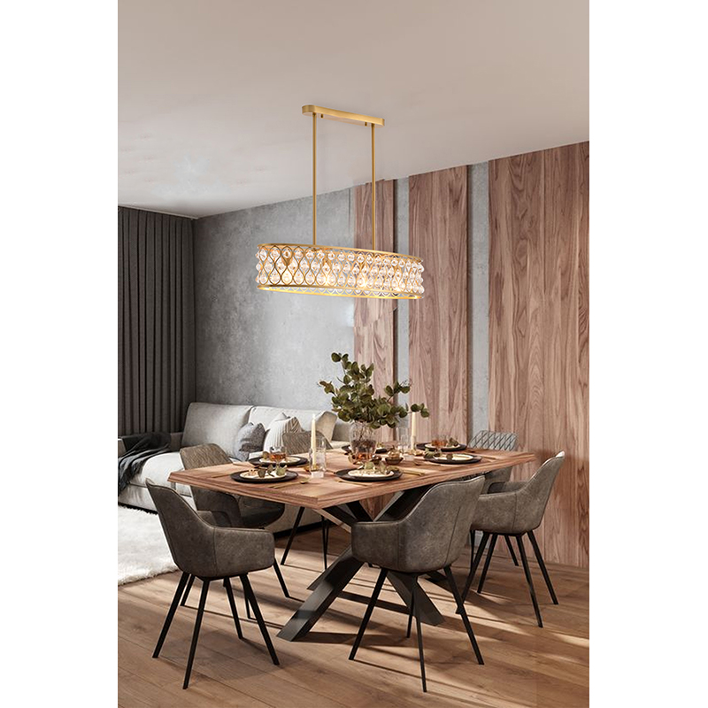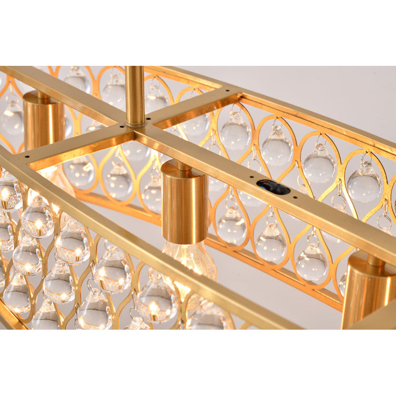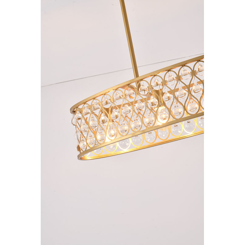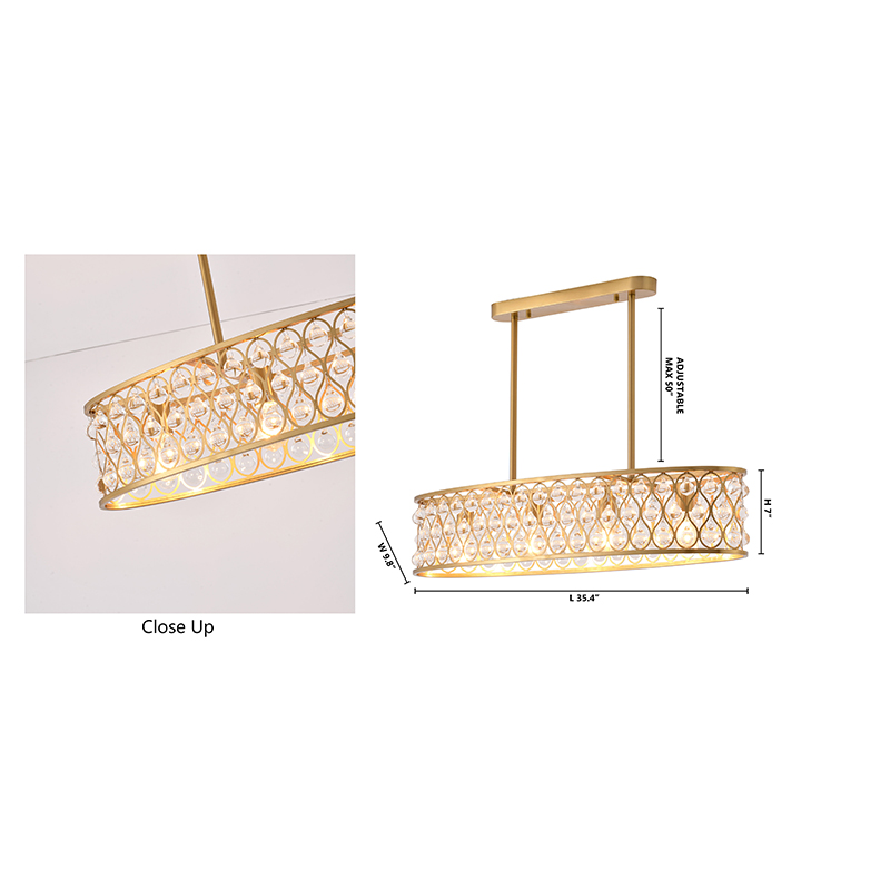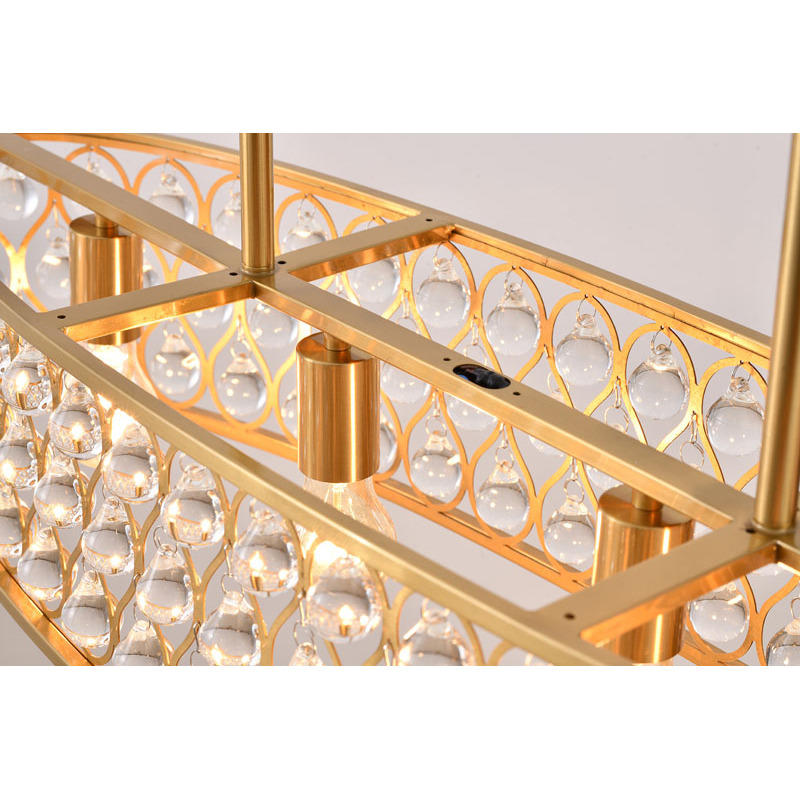 A GOLD OVAL FRAMED CHANDELIER WITH CLEAR CRYSTAL HANGING DROPS