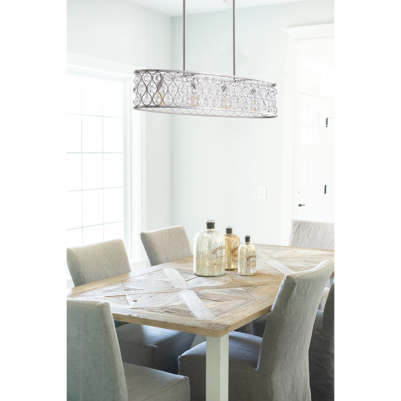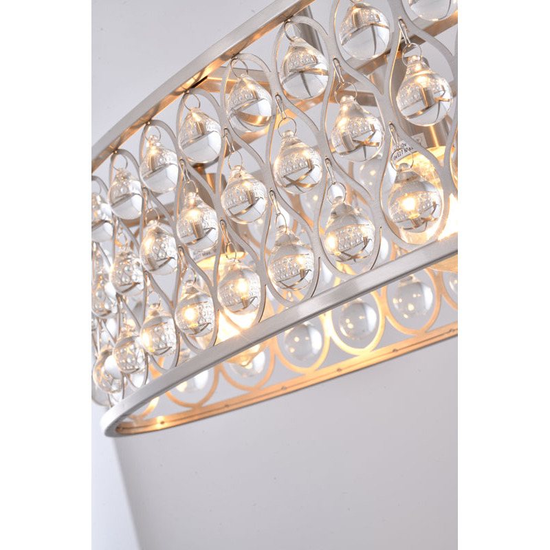 A SATIN NICKEL OVAL FRAMED CHANDELIER WITH CLEAR CRYSTAL HANGING DROPS