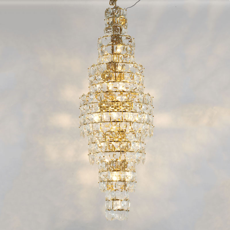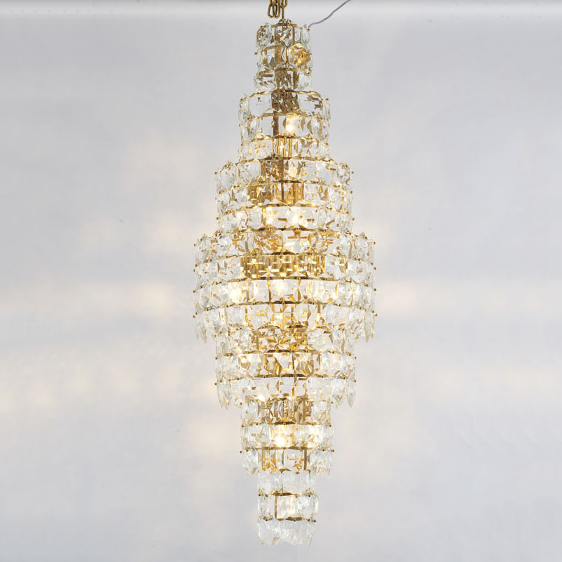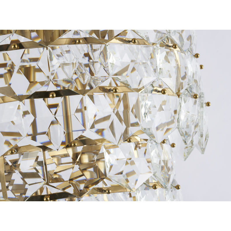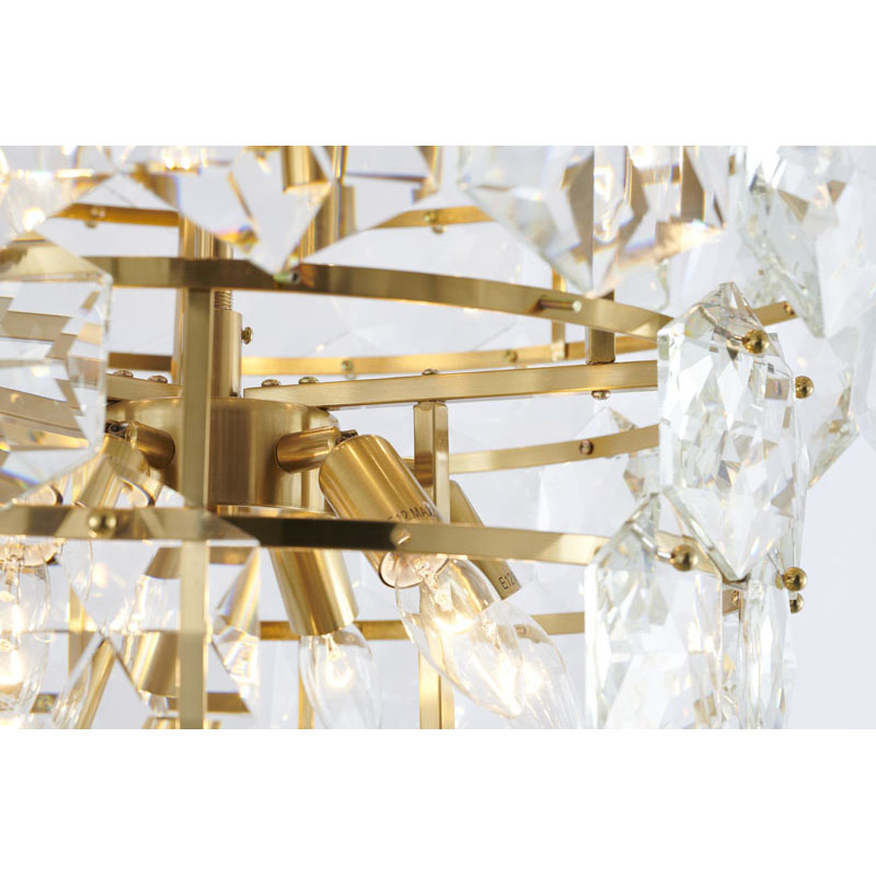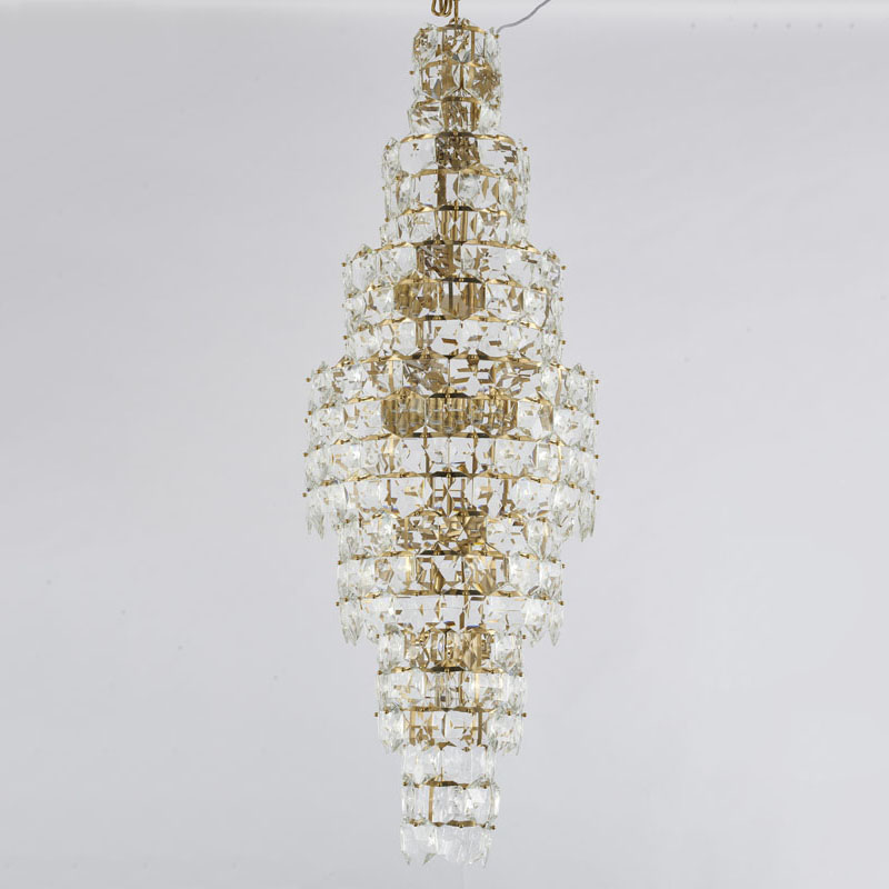 A SEVEN TIER BRASS FRAME CHANDELIER WITH CLEAR HANGING CRYSTALS