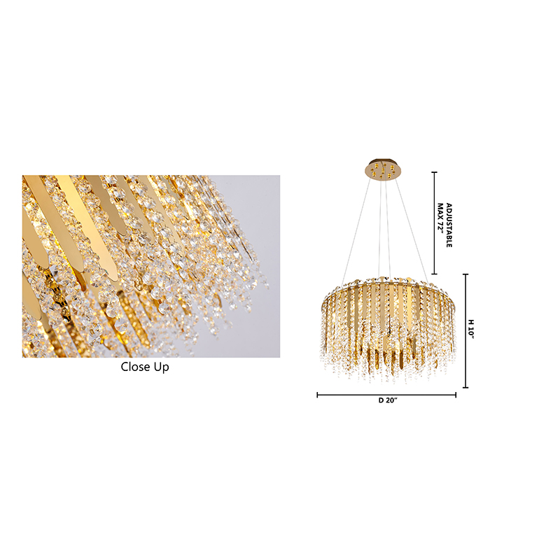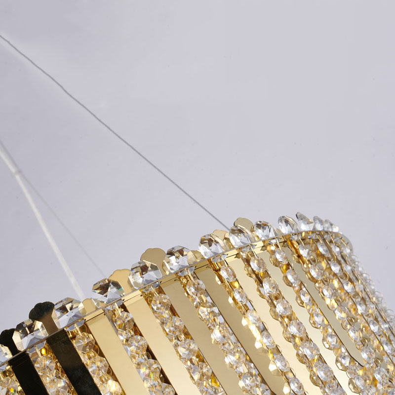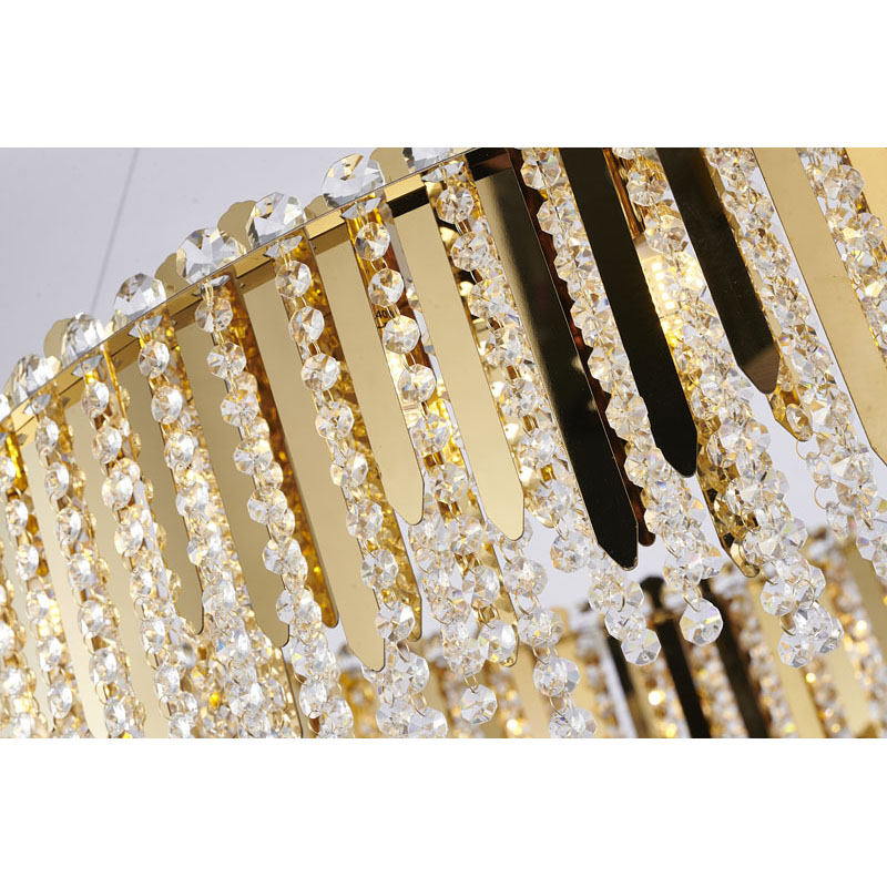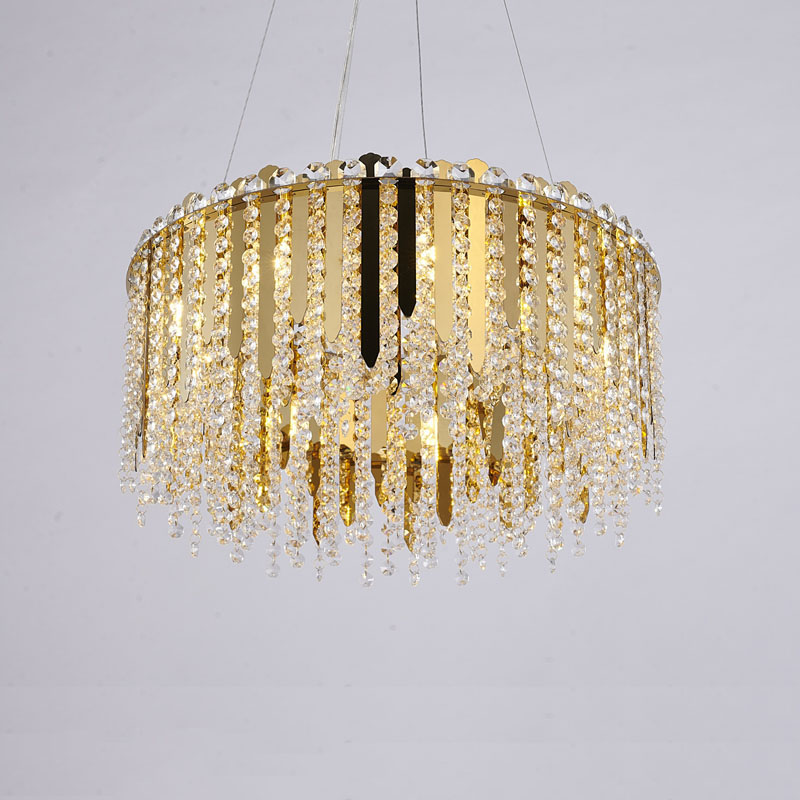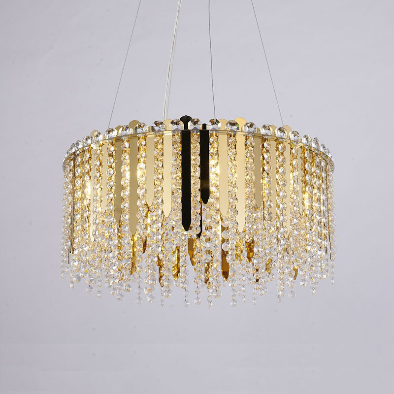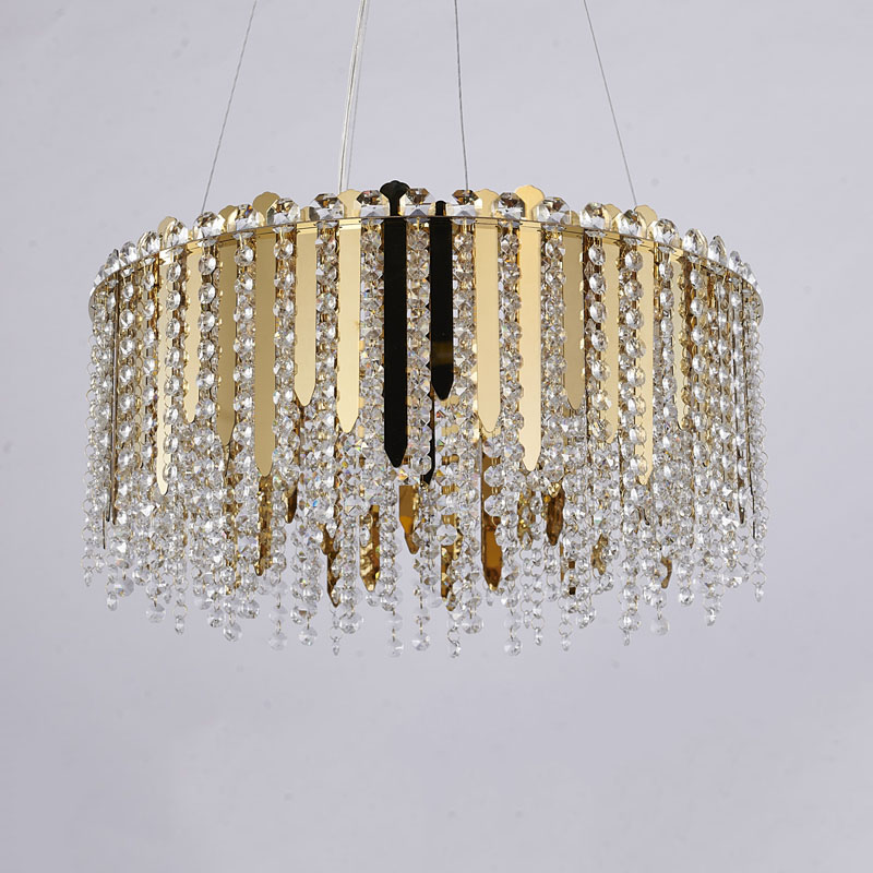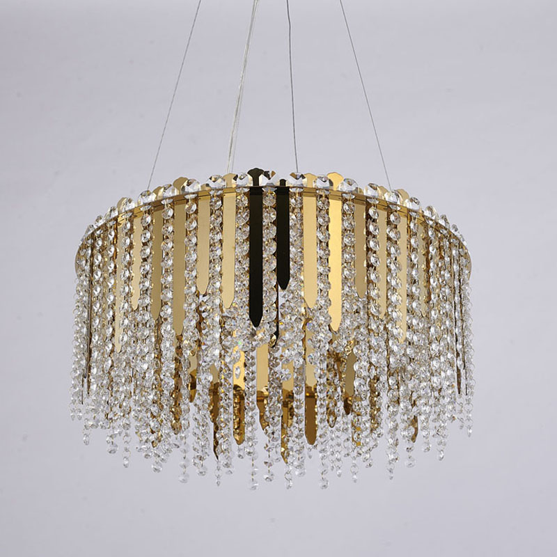A GOLD STAINLESS STEEL CHANDELIER WITH CLEAR HANGING CRYSTAL BEADS
