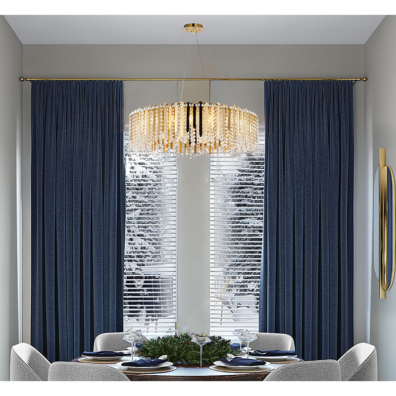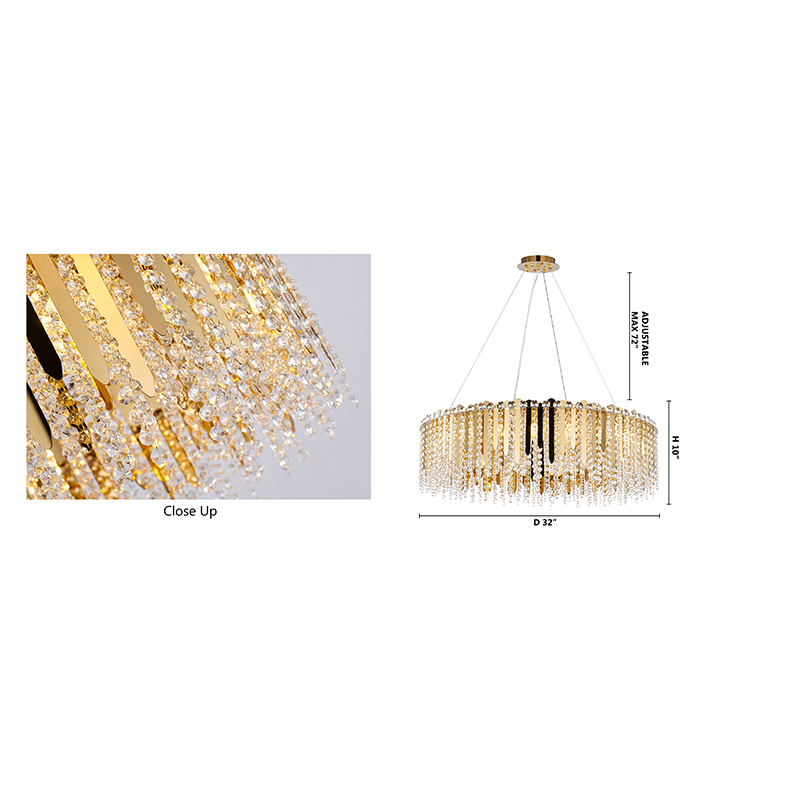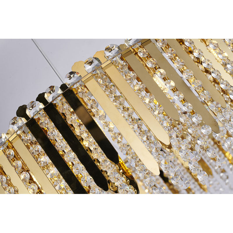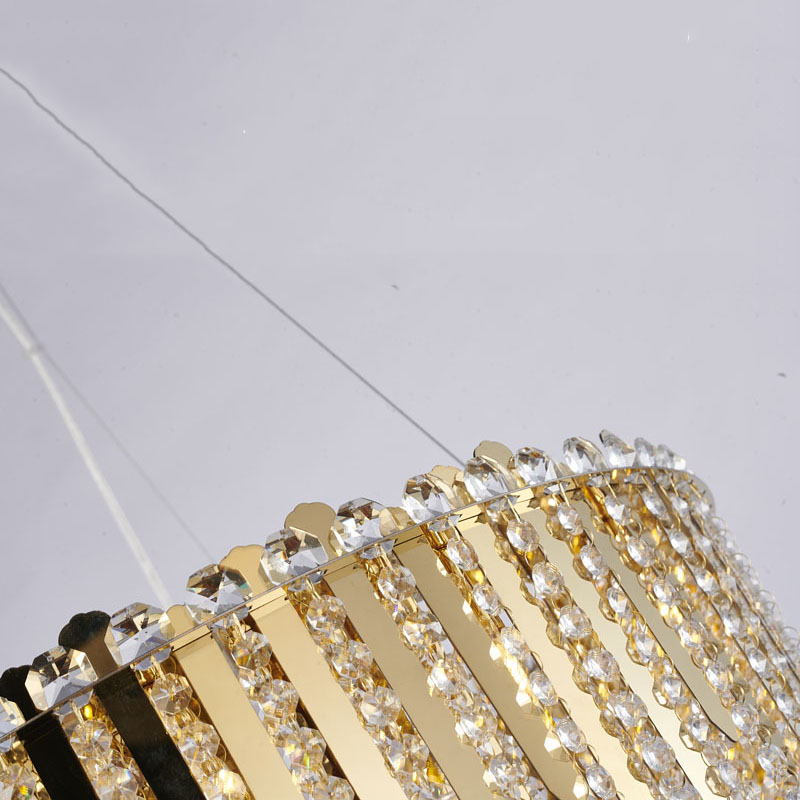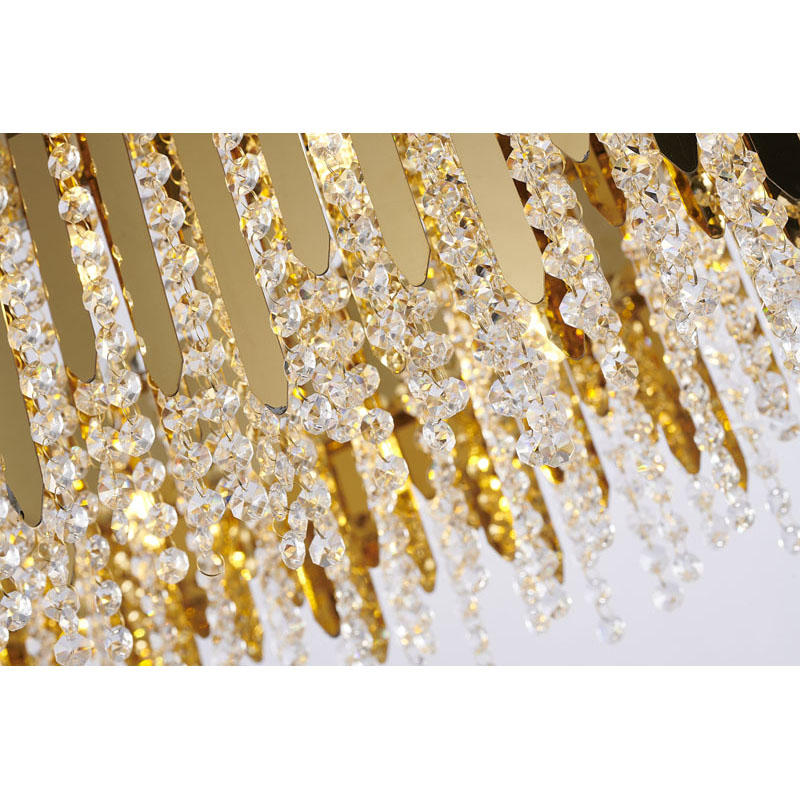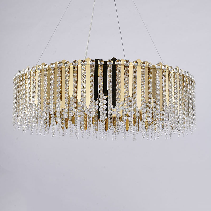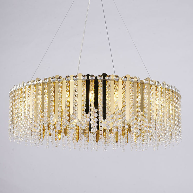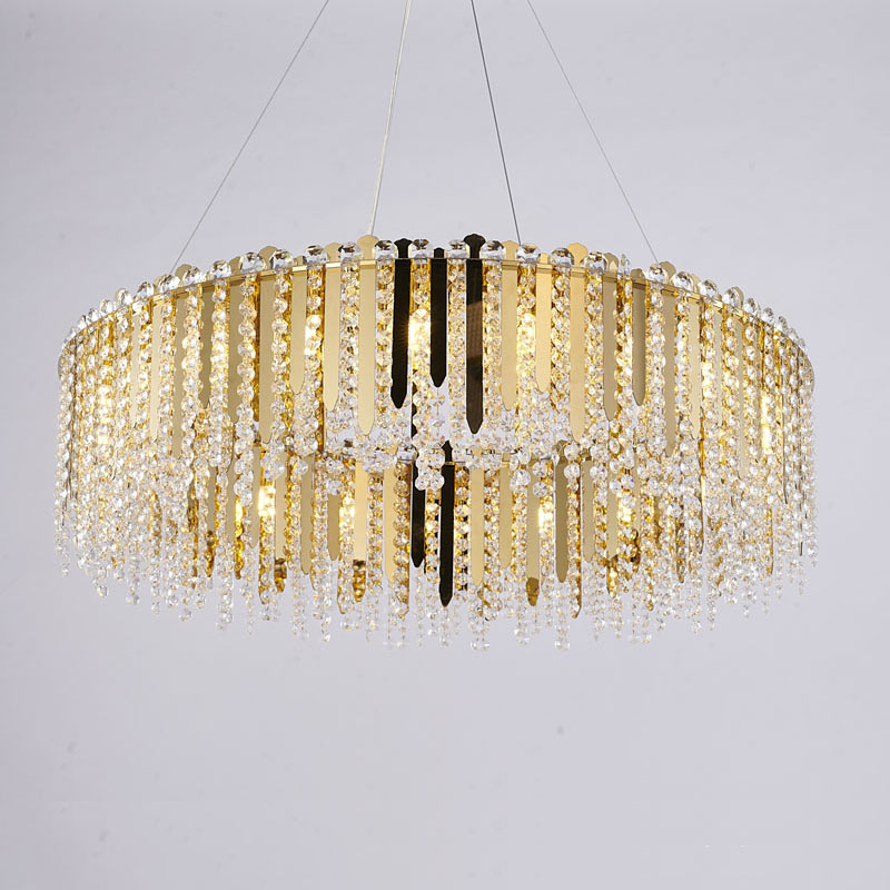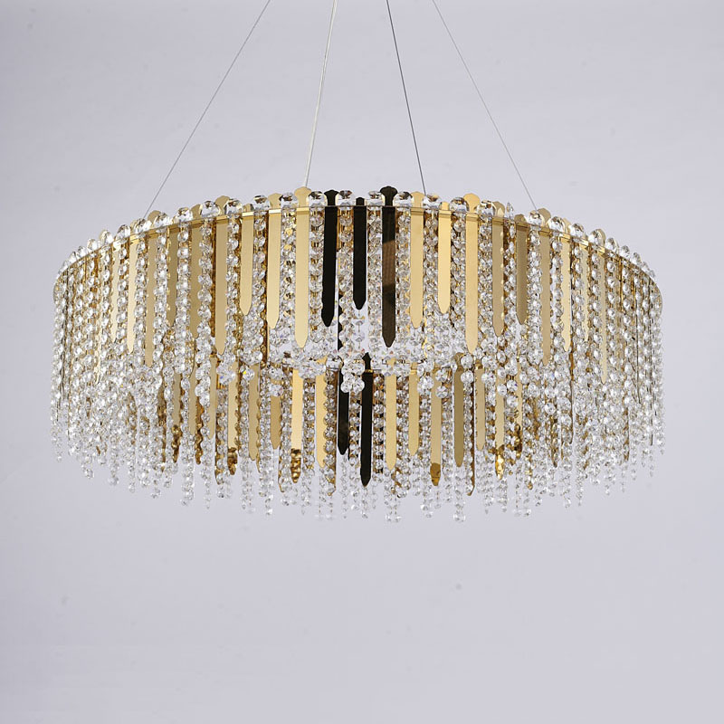 A GOLD STAINLESS STEEL CHANDELIER WITH CLEAR HANGING CRYSTAL BEADS