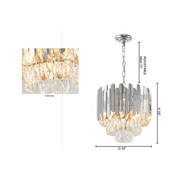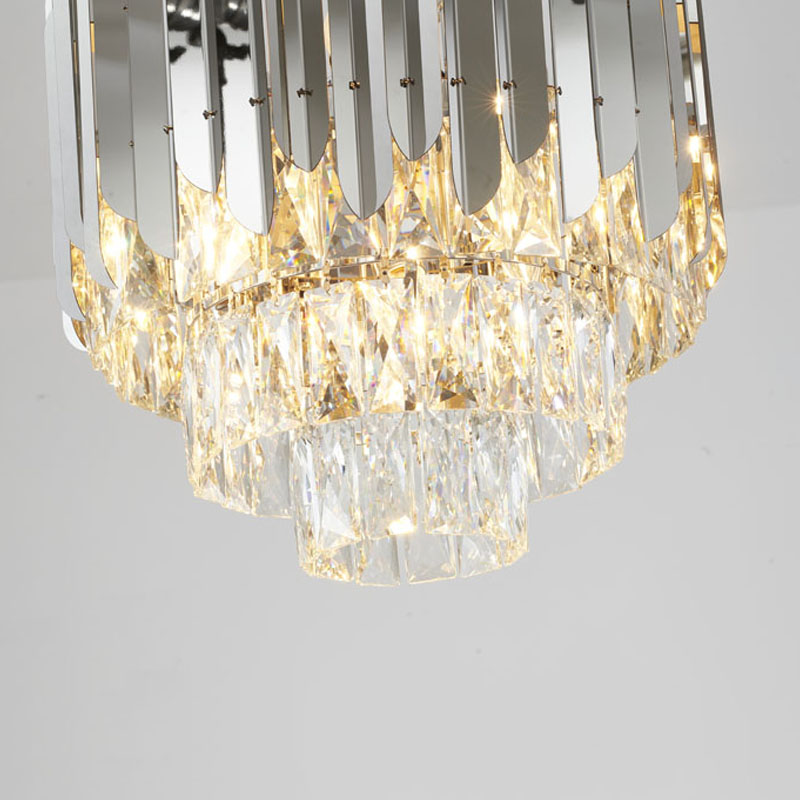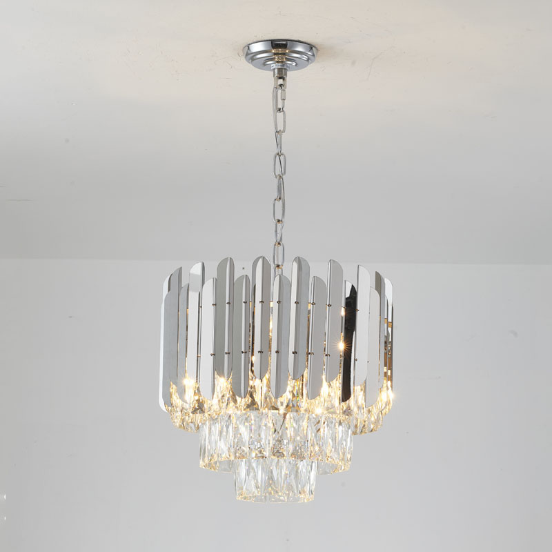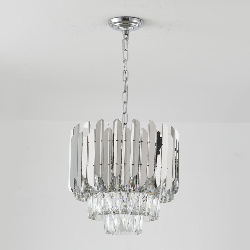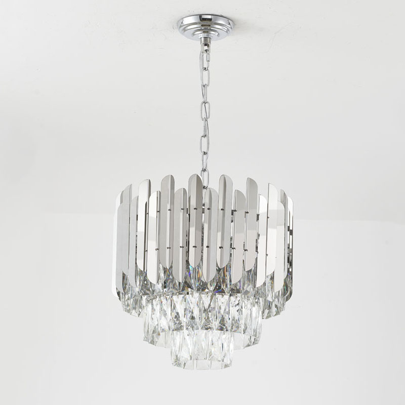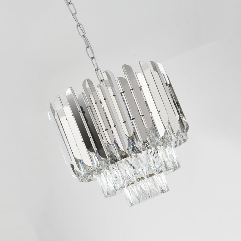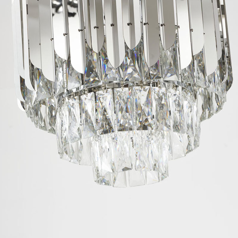 A CHROME STAINLESS STEEL FRAME CHANDELIER WITH CLEAR HANGING CRYSTALS