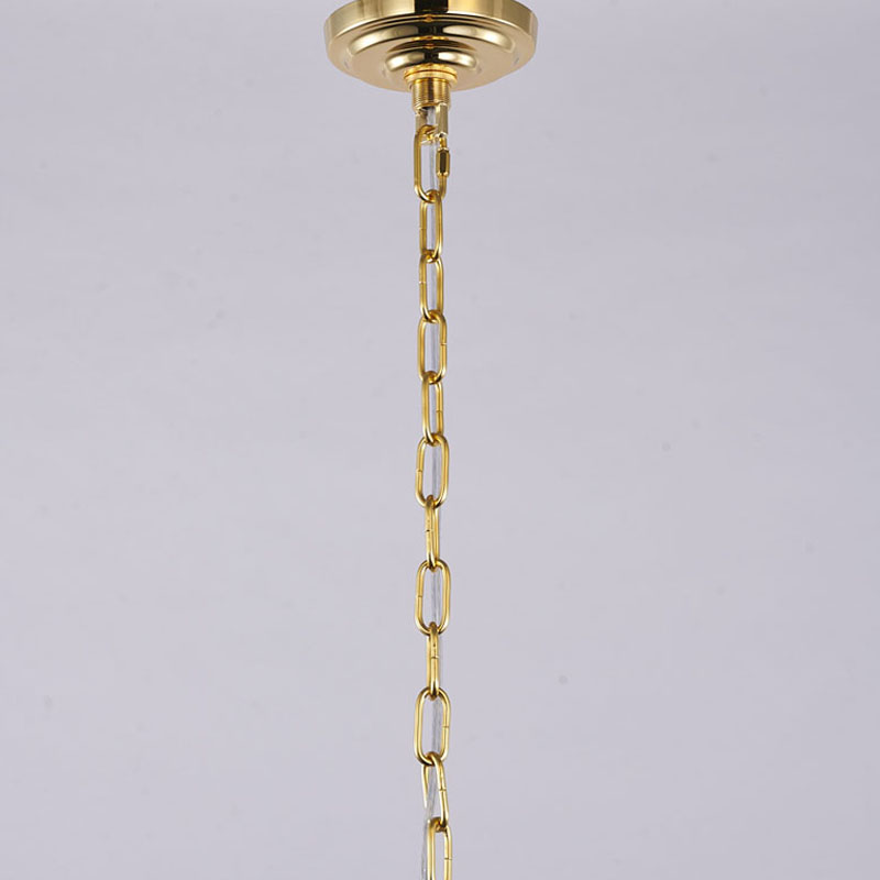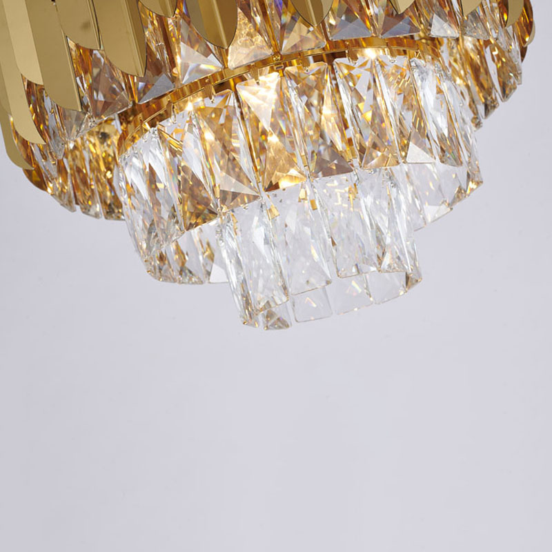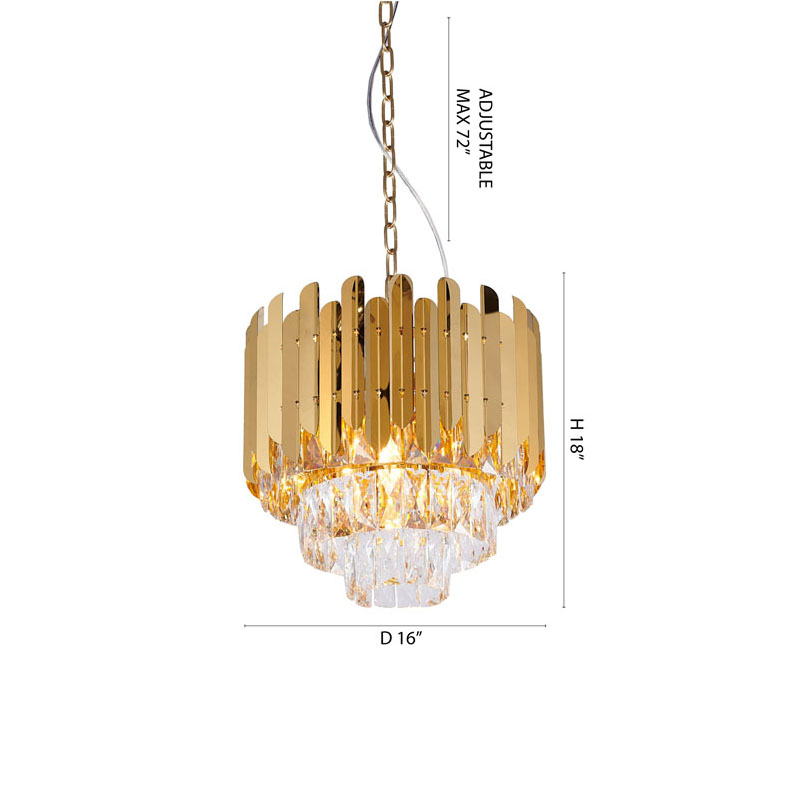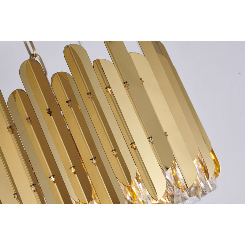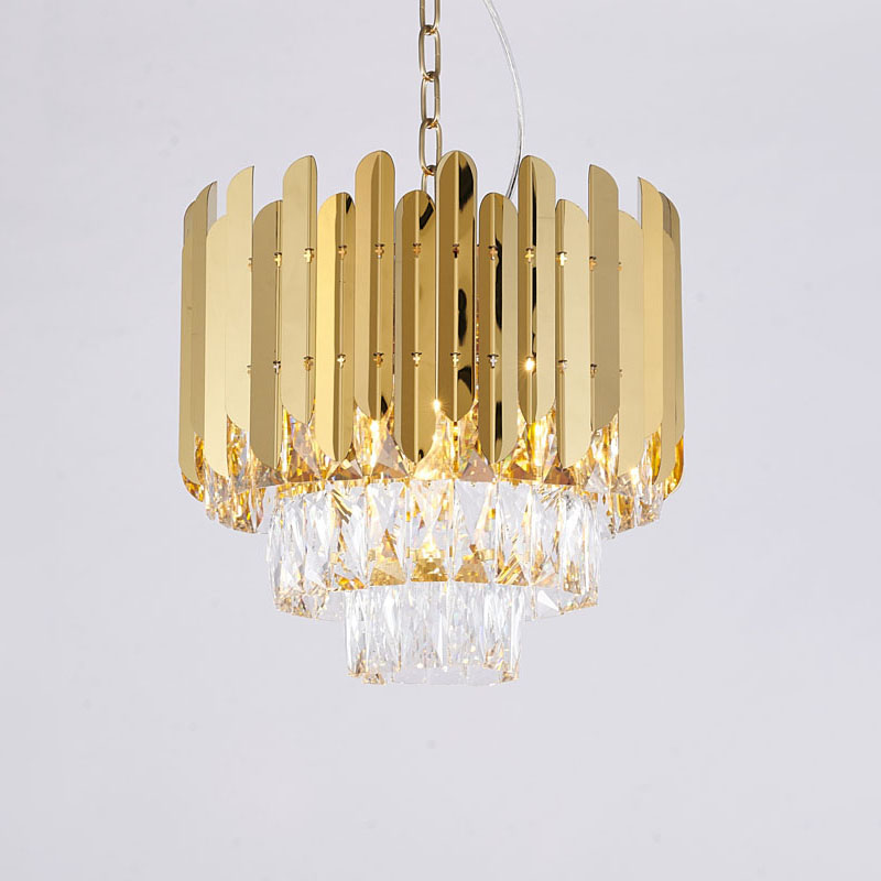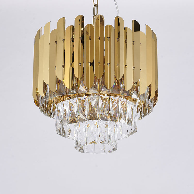 A GOLD STAINLESS STEEL CHANDELIER WITH CLEAR HANGING CRYSTALS