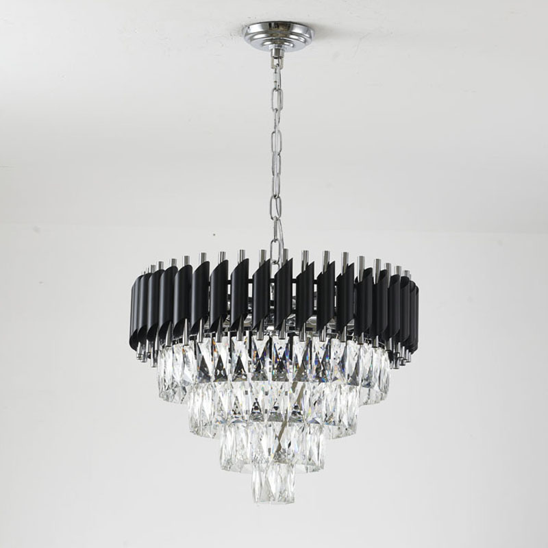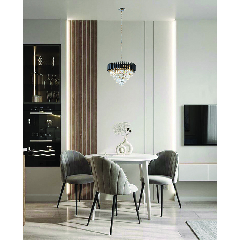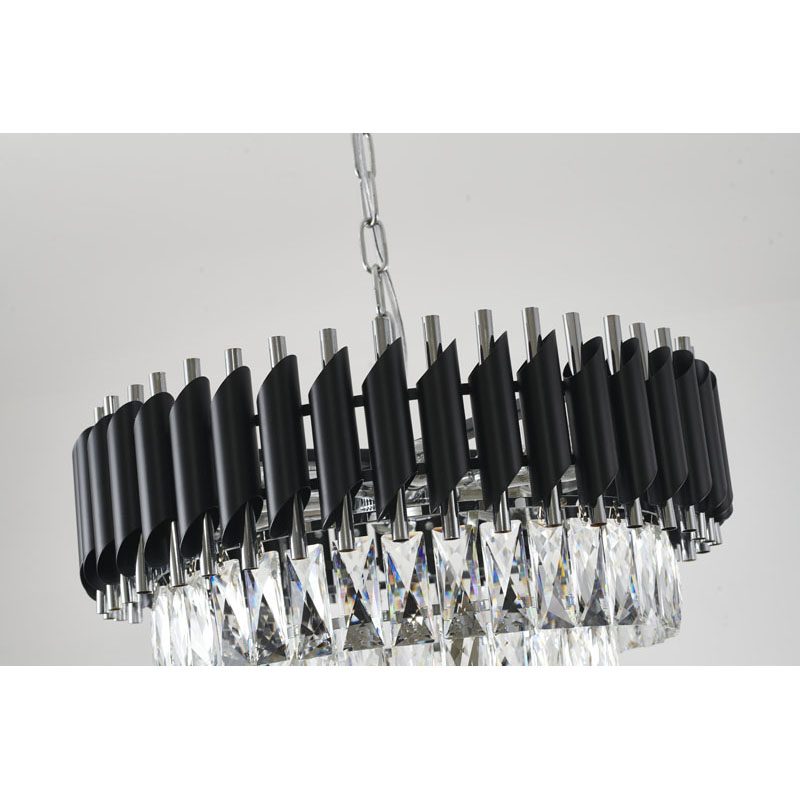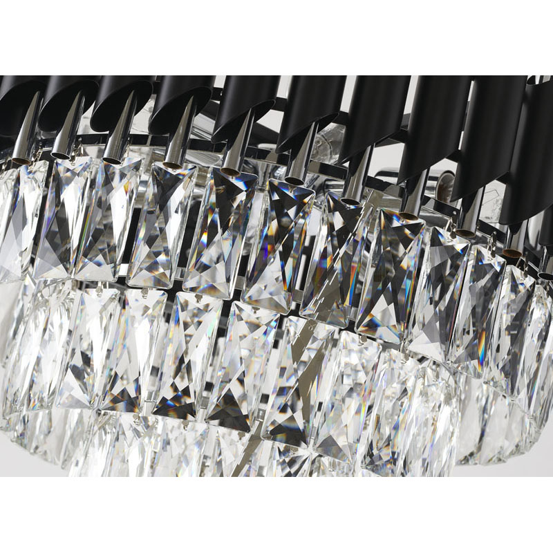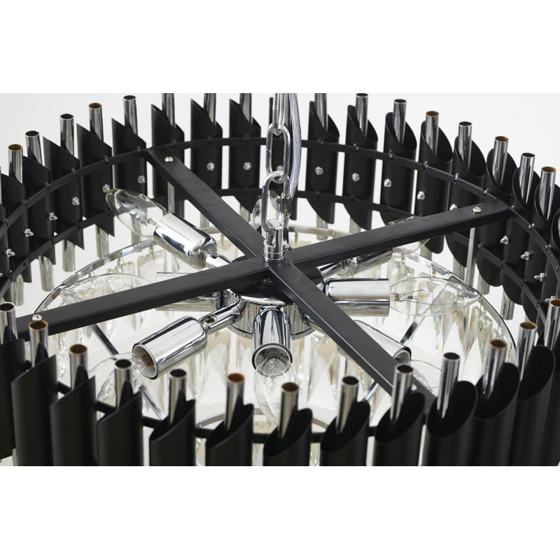 A ROUND BLACK & CHROME FRAME CHANDELIER WITH CLEAR HANGING CRYSTALS
