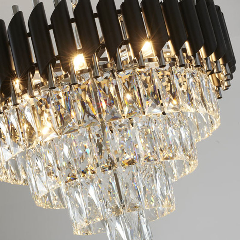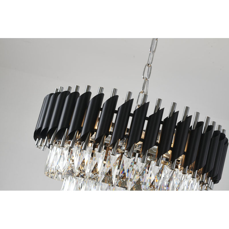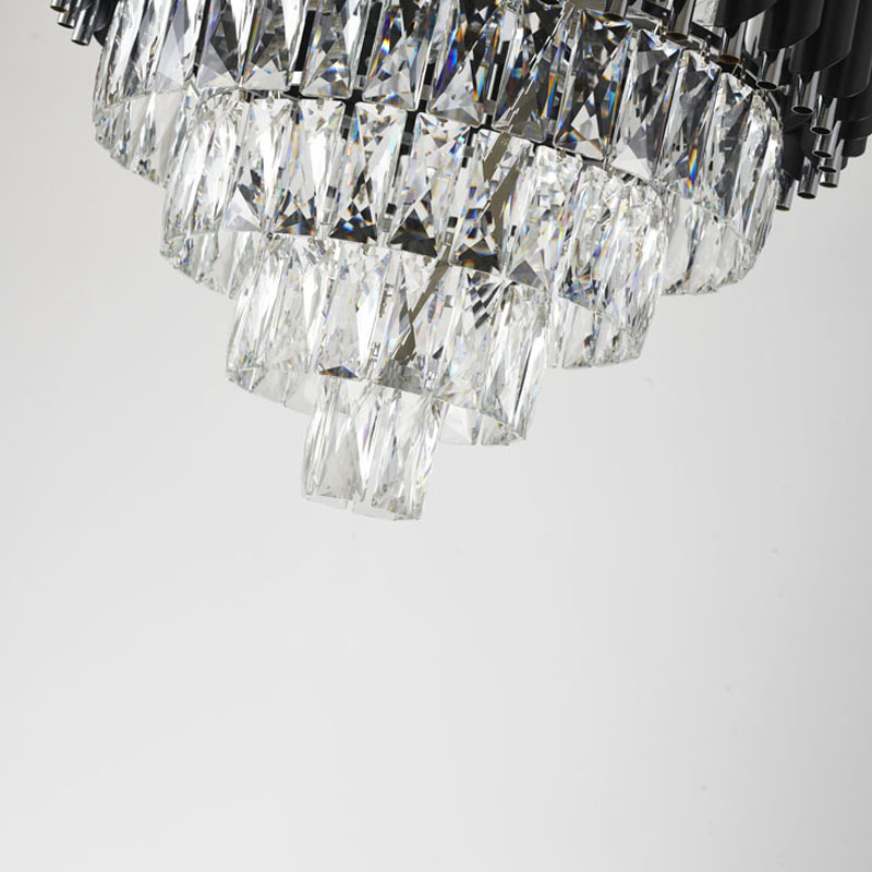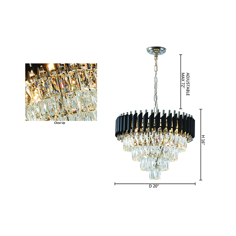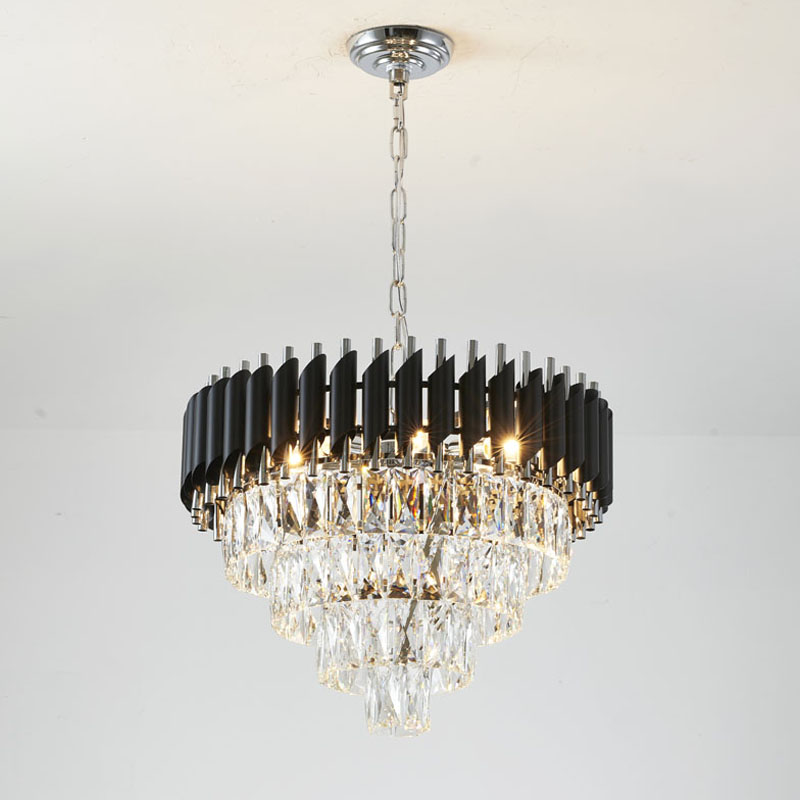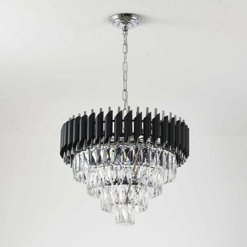 A ROUND BLACK & CHROME FRAME CHANDELIER WITH CLEAR HANGING CRYSTALS