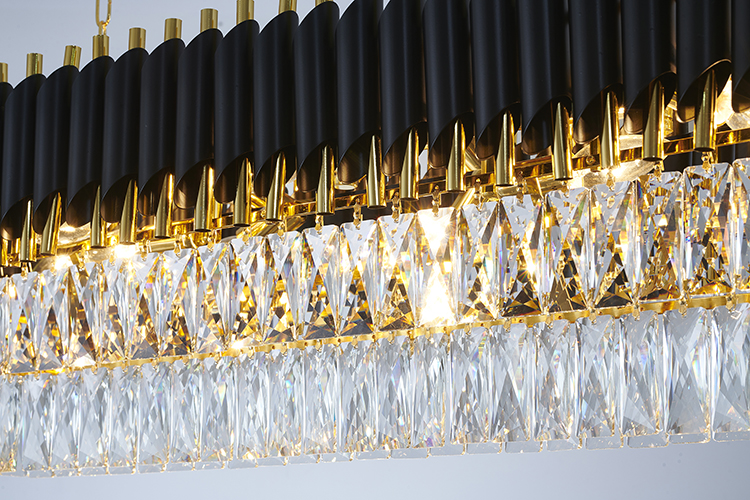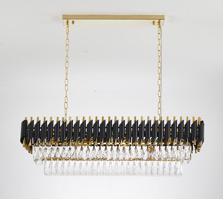 A BLACK & GOLD RECTANGULAR FRAME CHANDELIER WITH CLEAR HANGING CRYSTALS