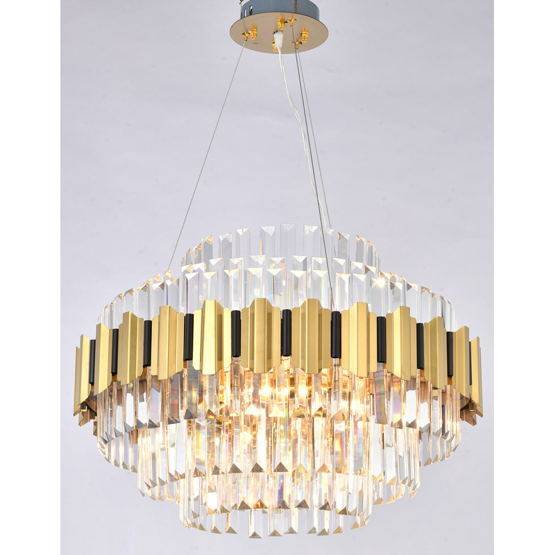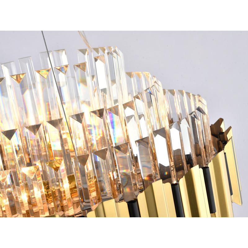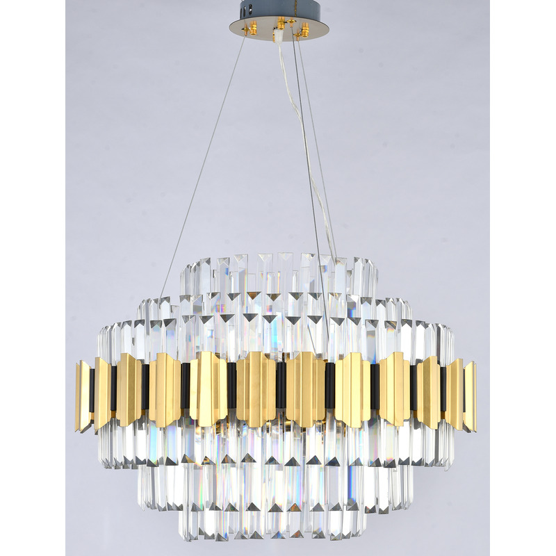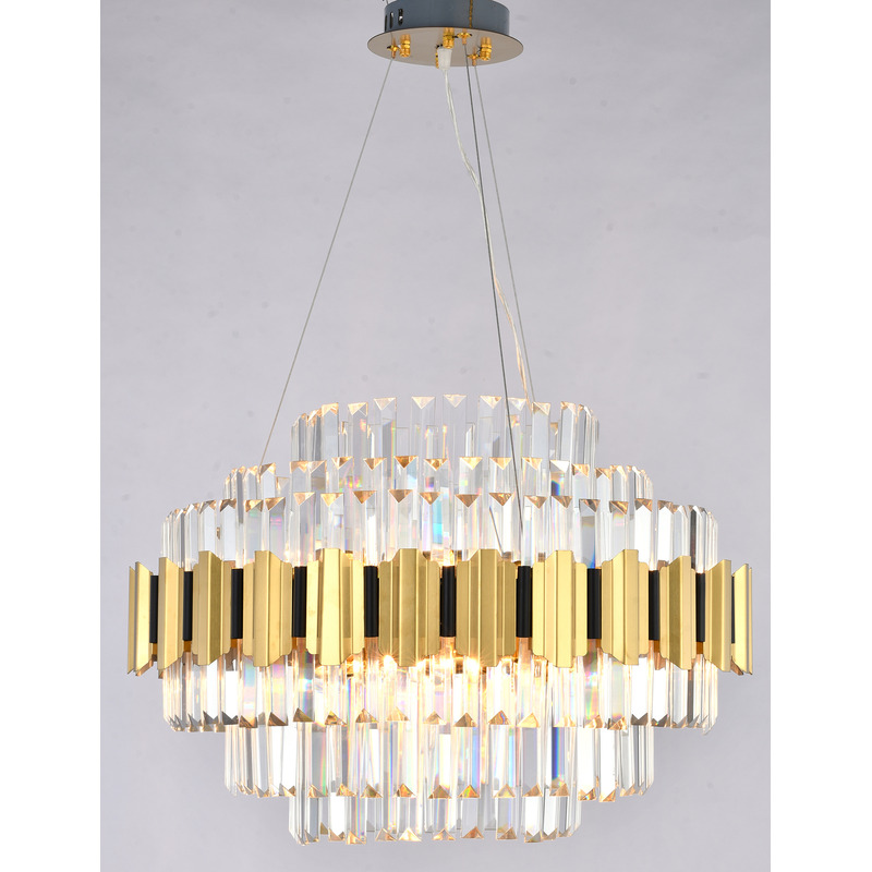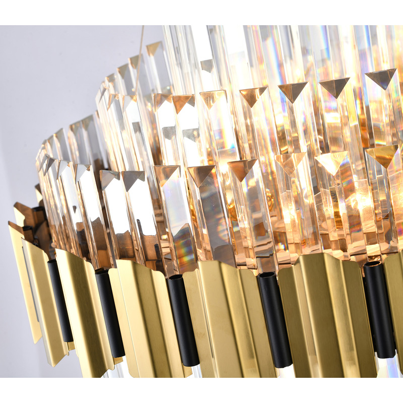 A GOLD STAINLESS STEEL CHANDELIER WITH CLEAR HANGING CRYSTALS