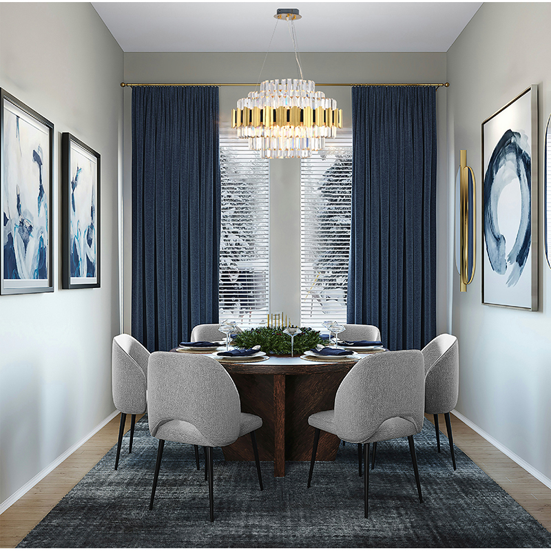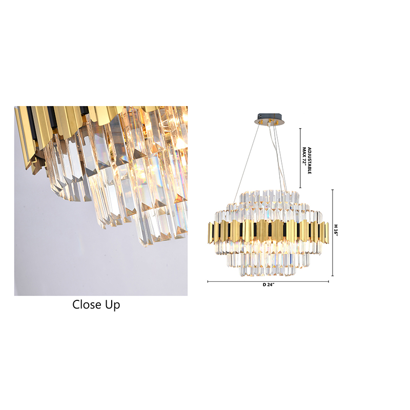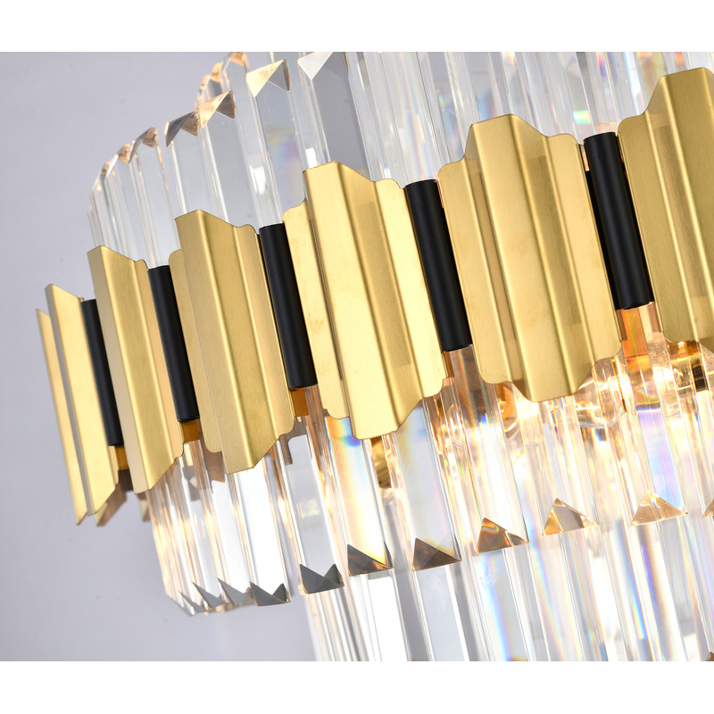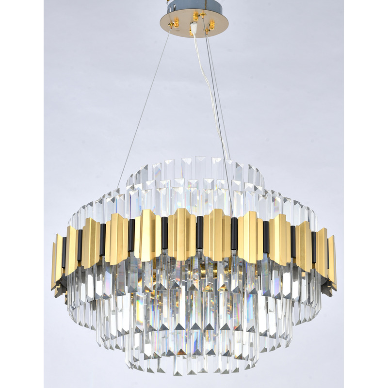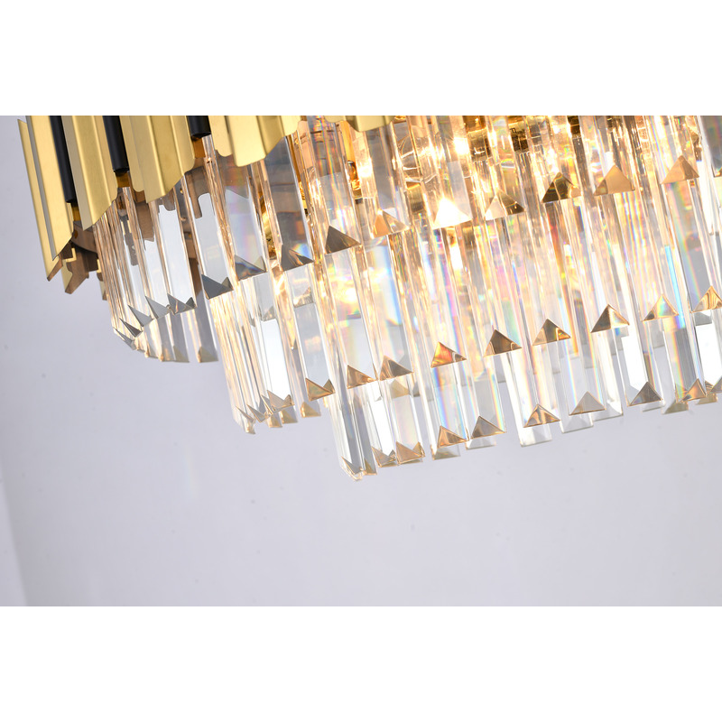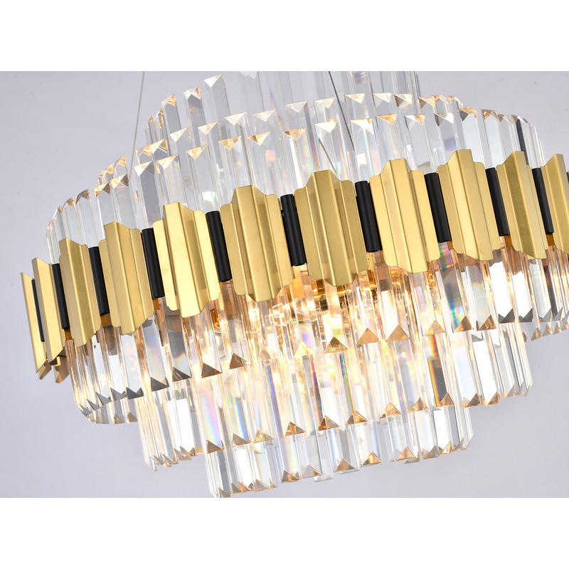 A GOLD STAINLESS STEEL CHANDELIER WITH CLEAR HANGING CRYSTALS