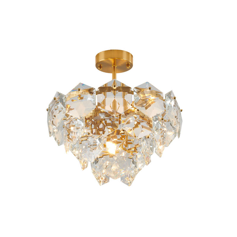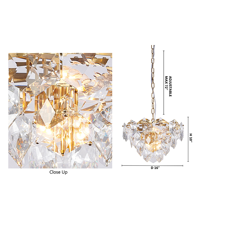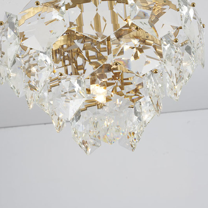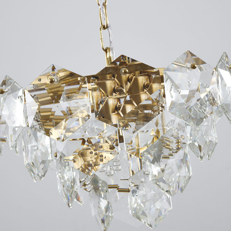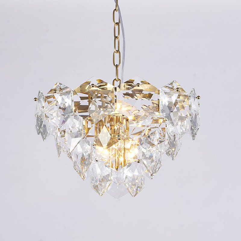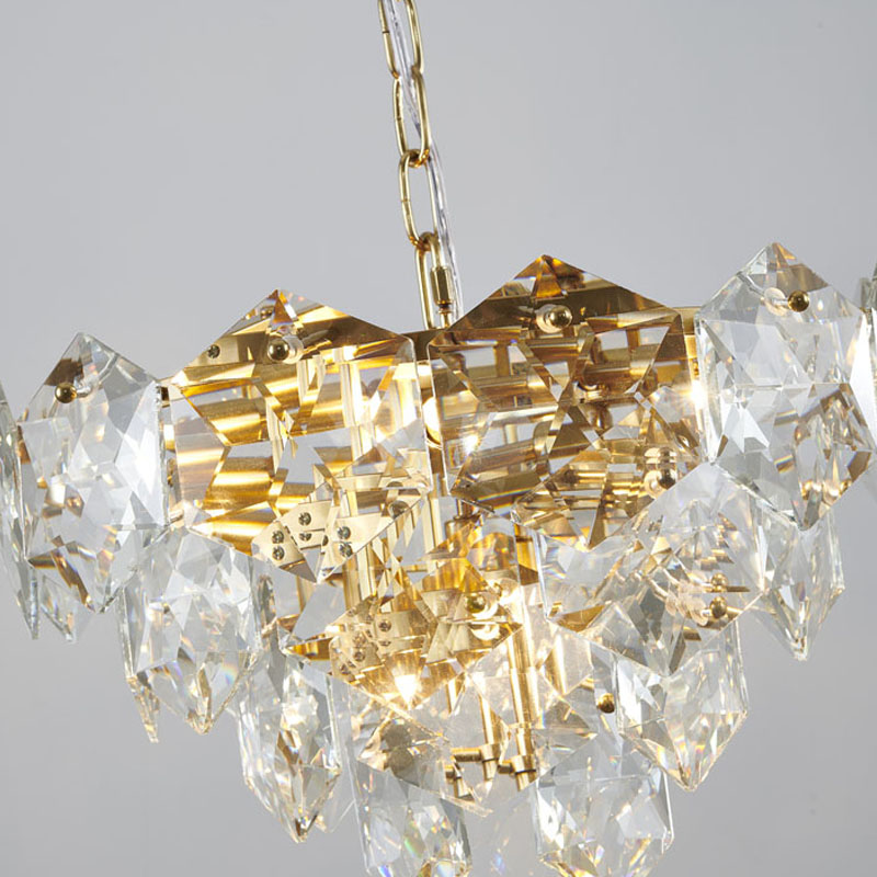 A GOLD FRAME CHANDELIER WITH CLEAR HANGING CRYSTALS