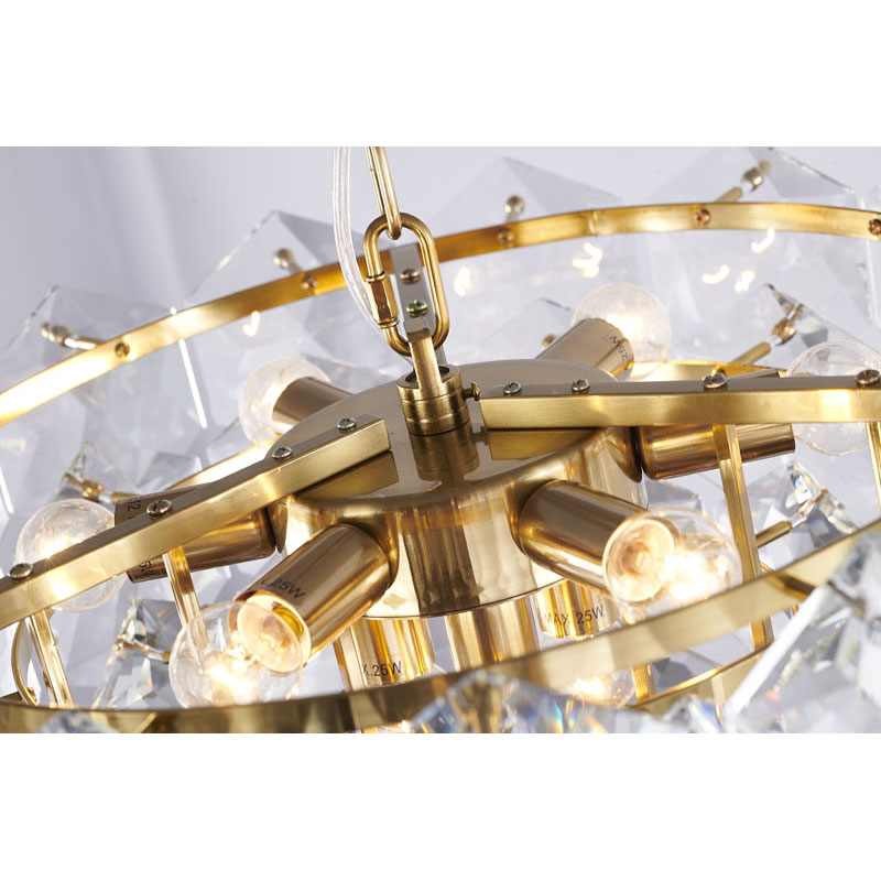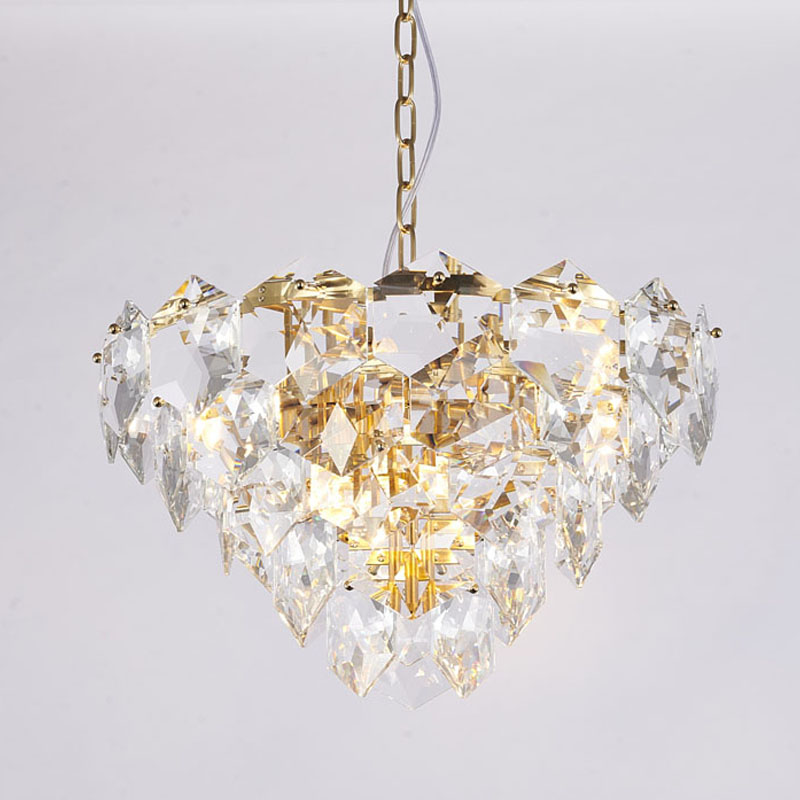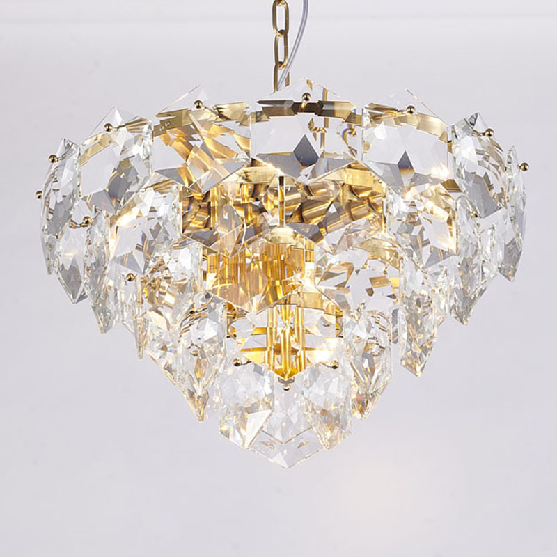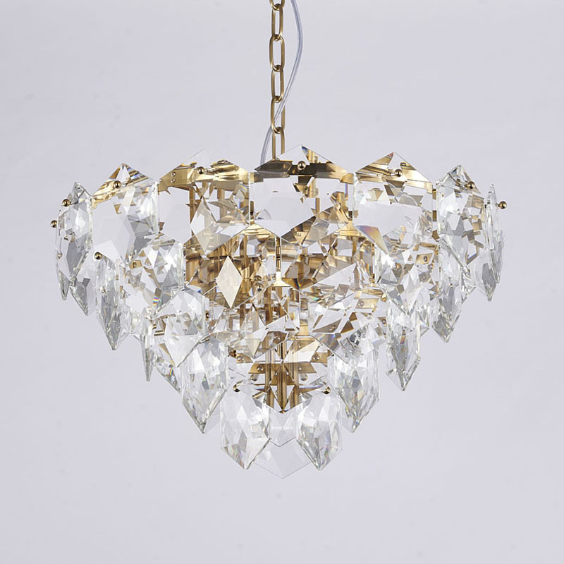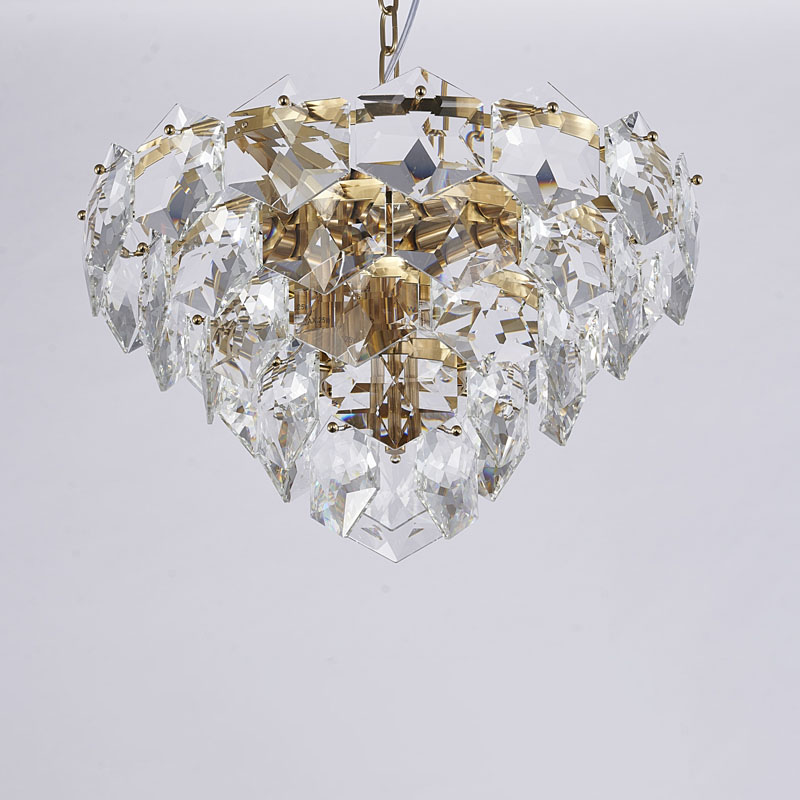 A GOLD FRAME CHANDELIER WITH CLEAR HANGING CRYSTALS