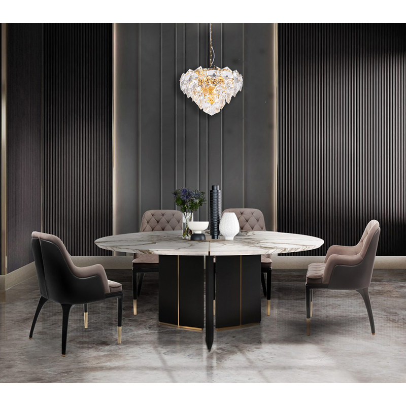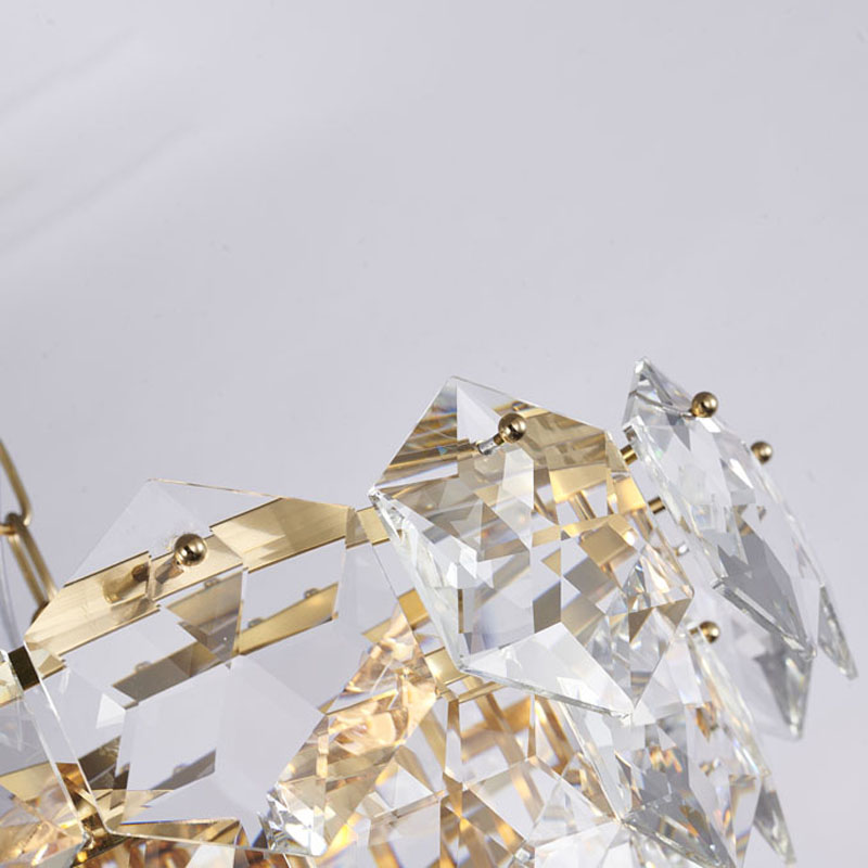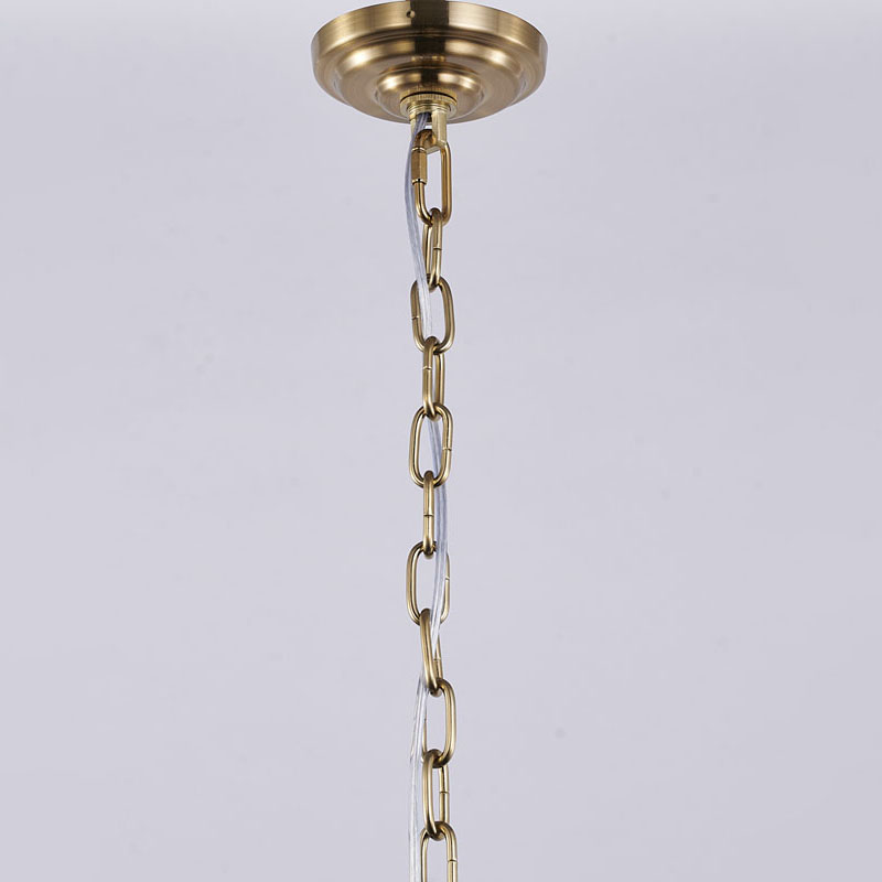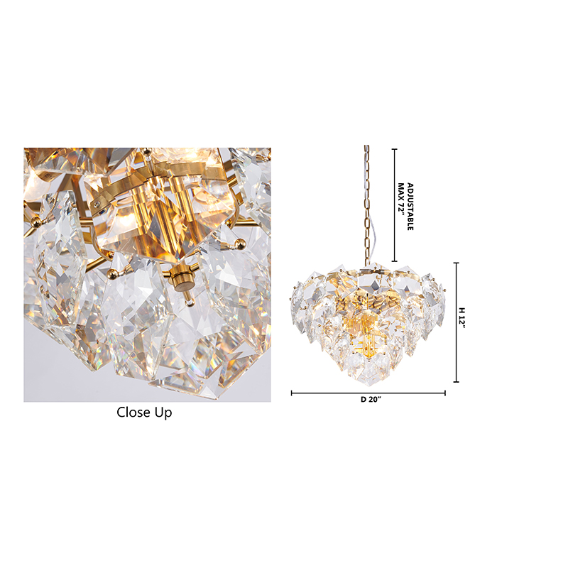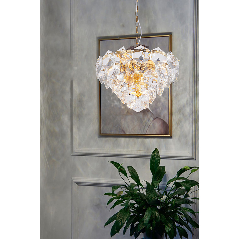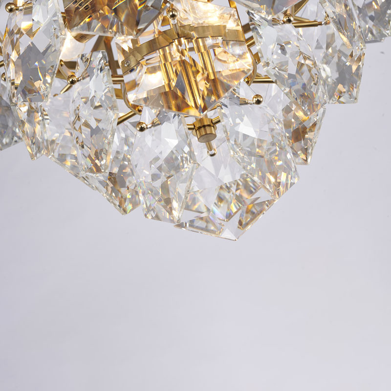 A GOLD FRAME CHANDELIER WITH CLEAR HANGING CRYSTALS