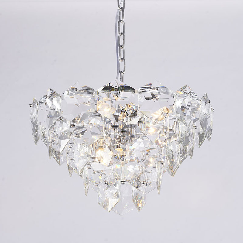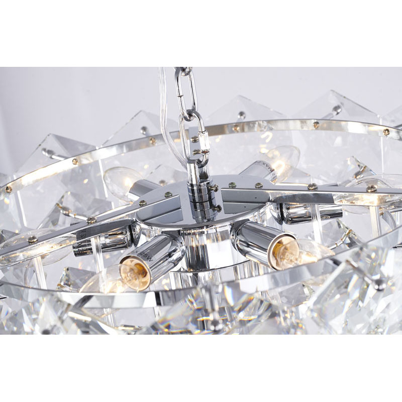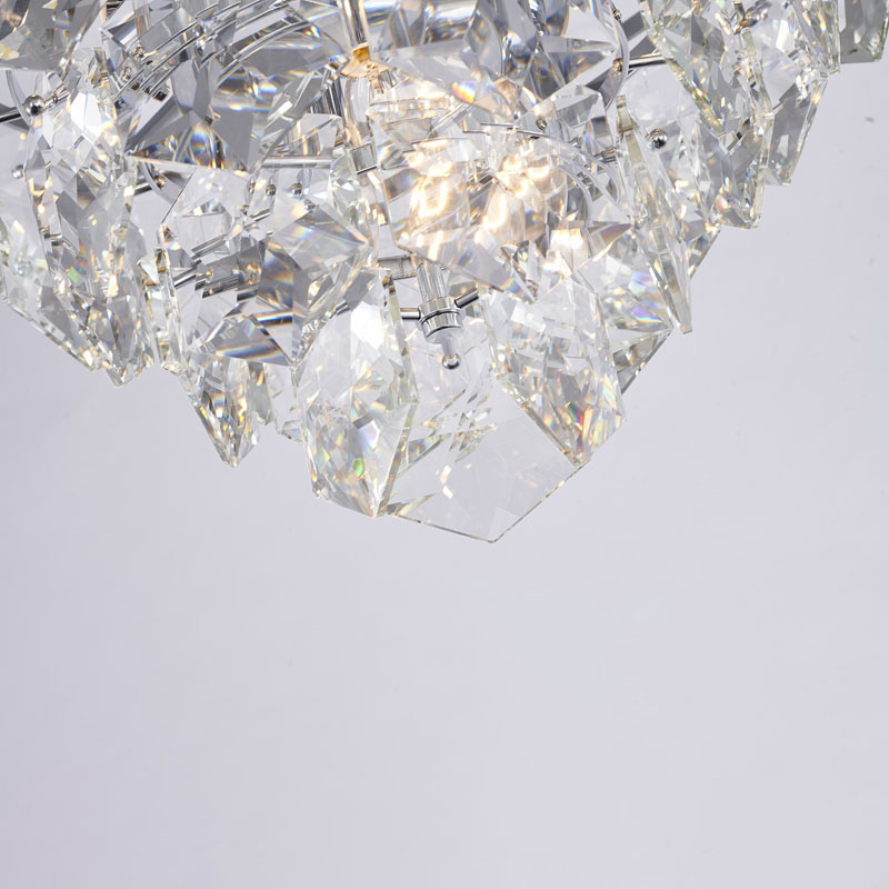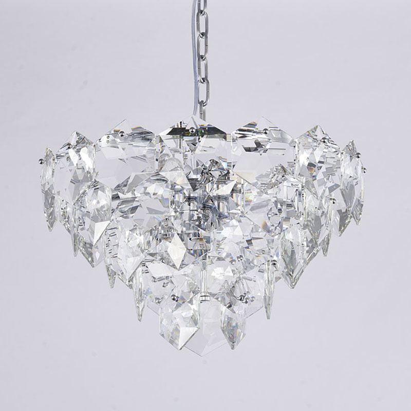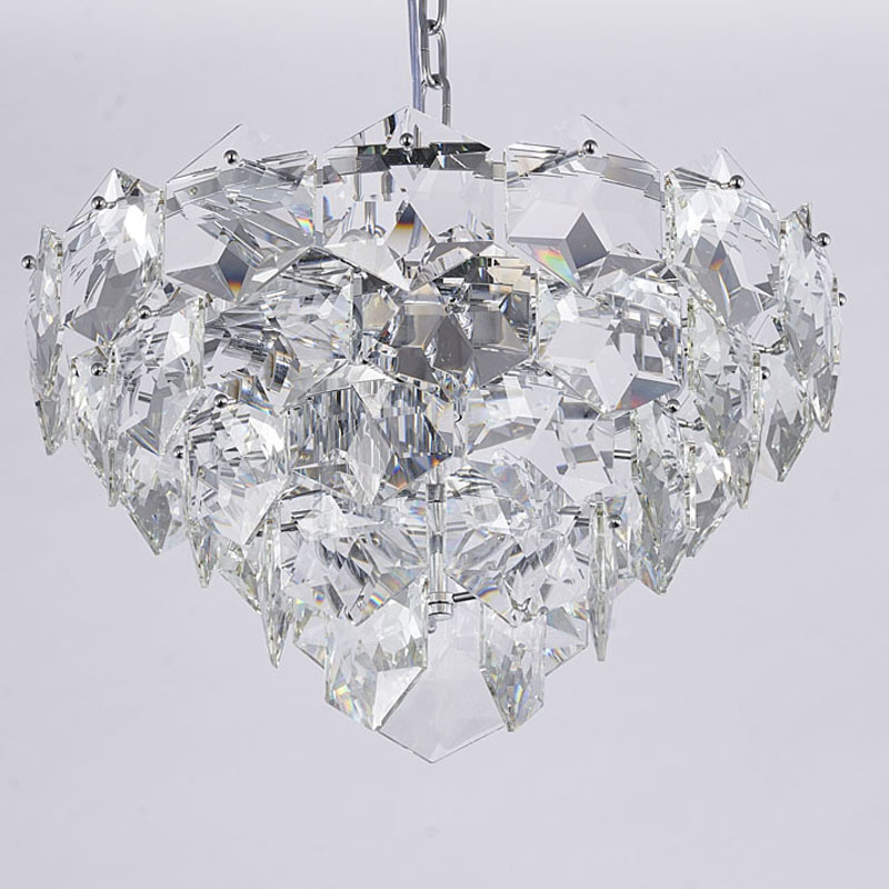 A CHROME FRAME CHANDELIER WITH CLEAR HANGING CRYSTALS
