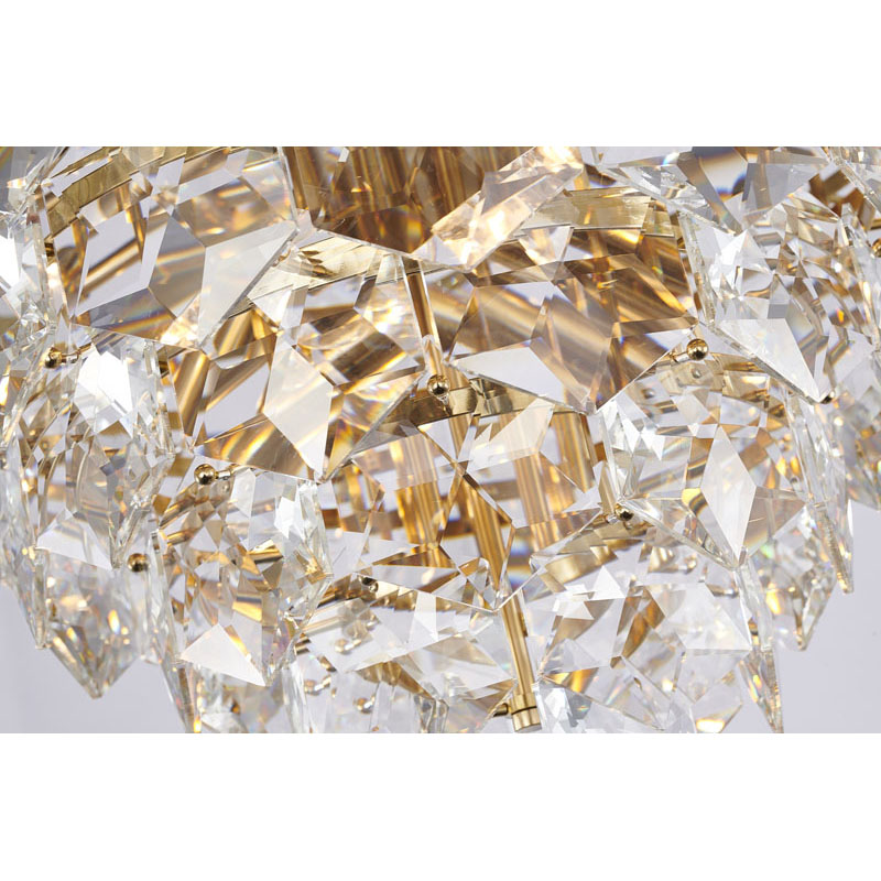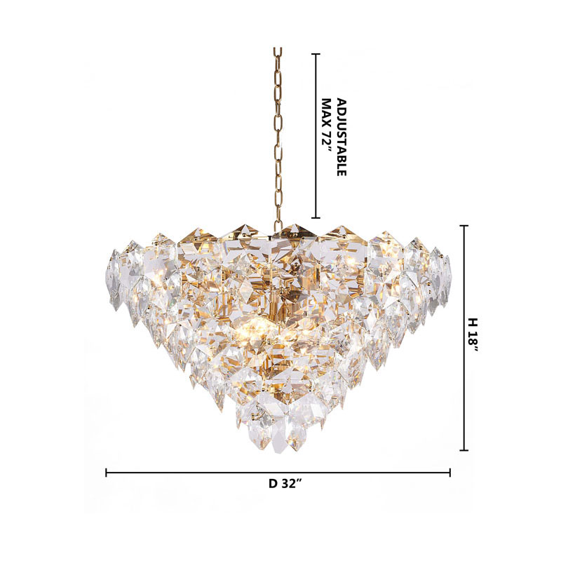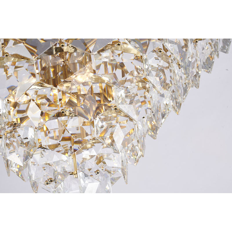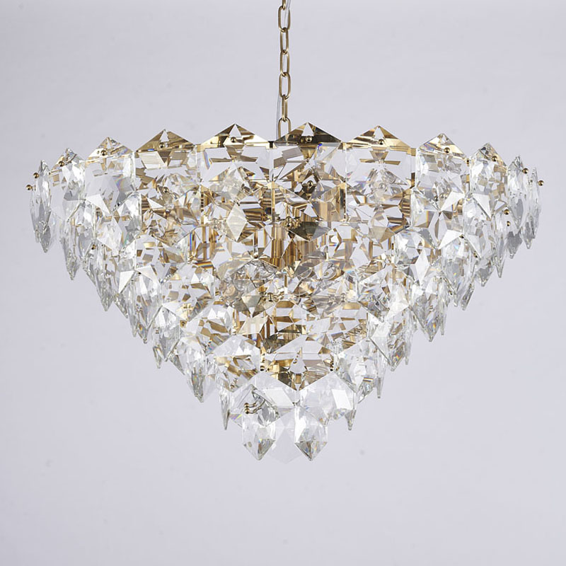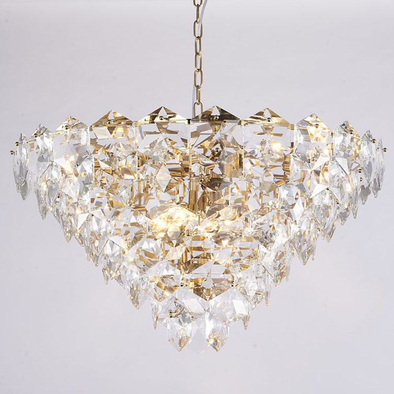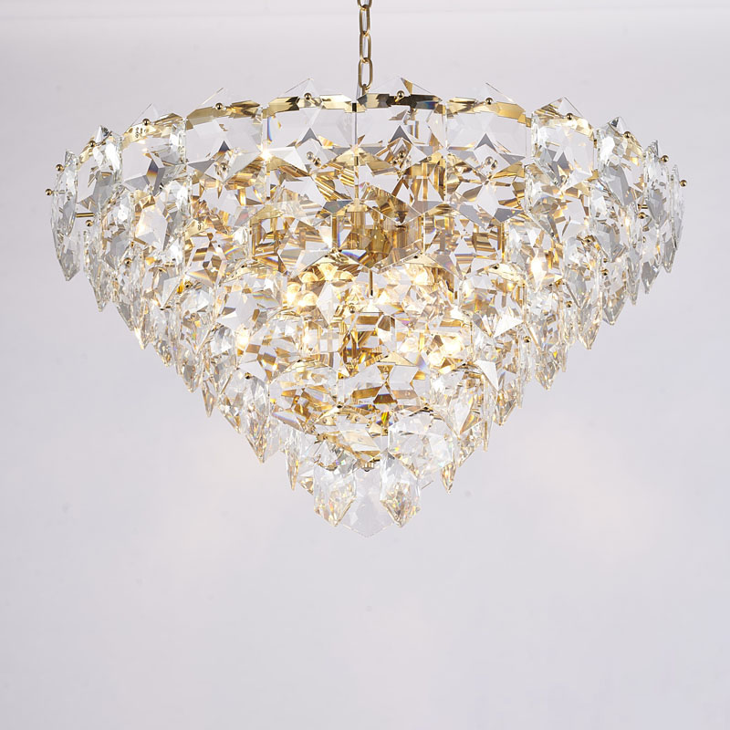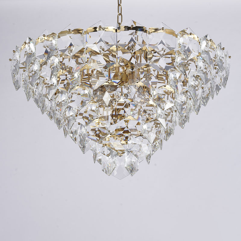 A GOLD FRAME CHANDELIER WITH CLEAR HANGING CRYSTALS