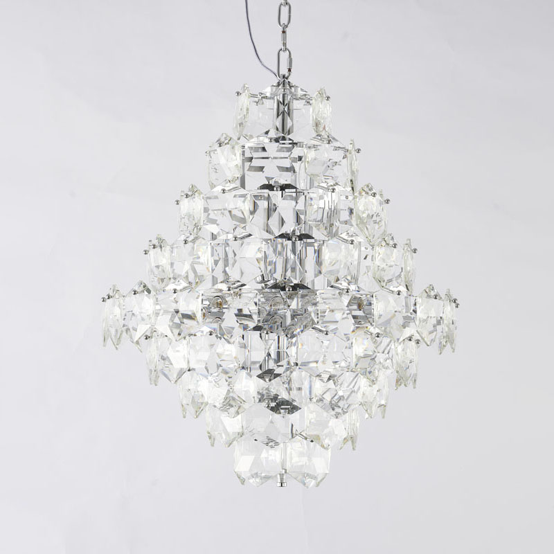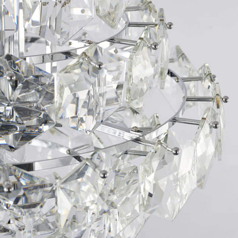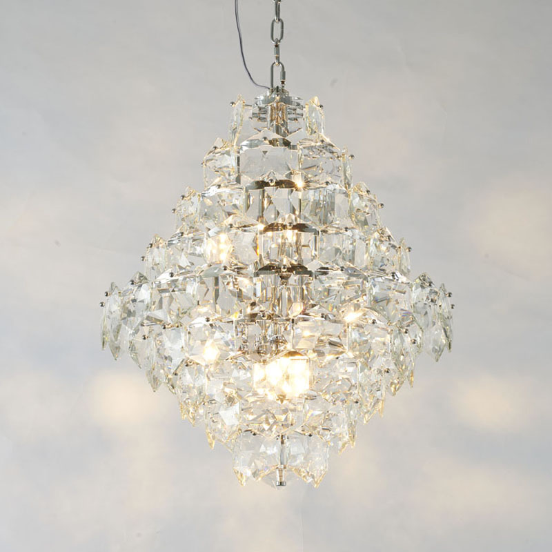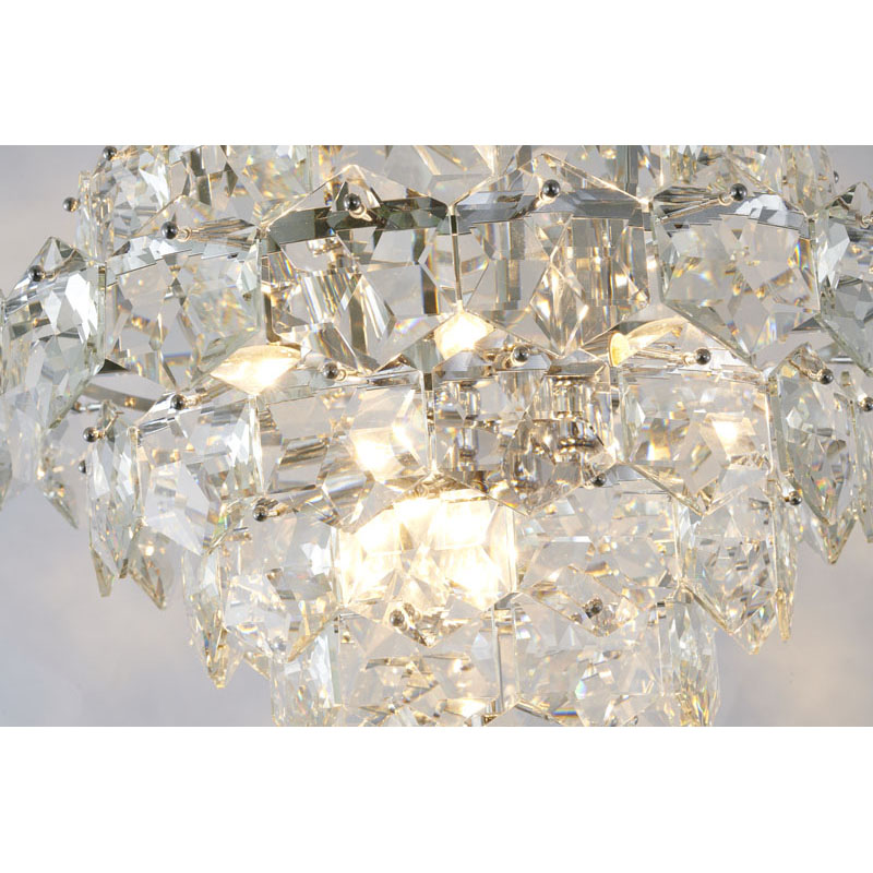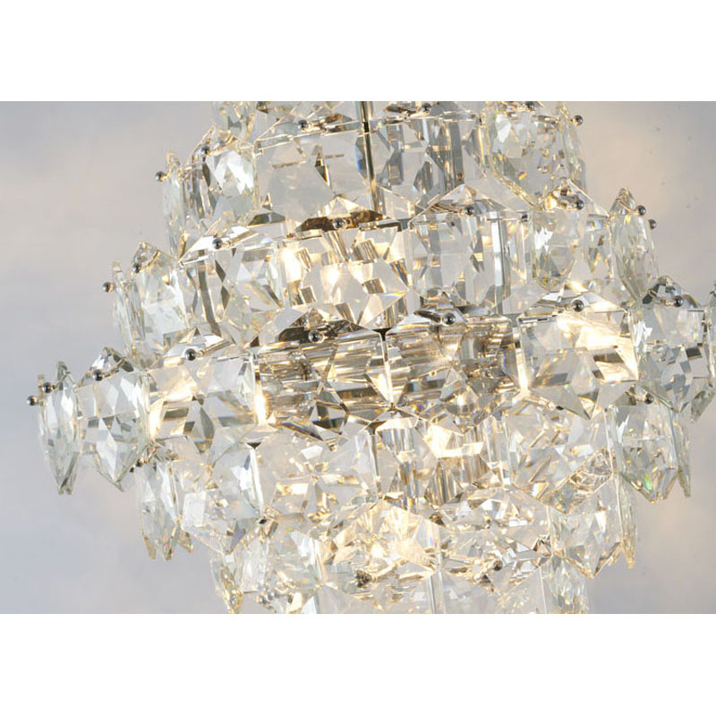 A CLEAR CRYSTAL CHANDELIER WITH CHROME HARDWARE