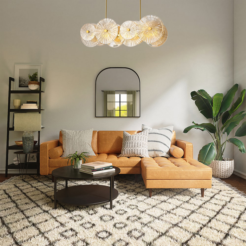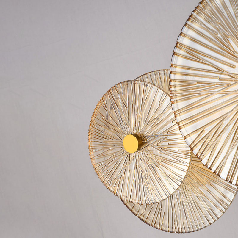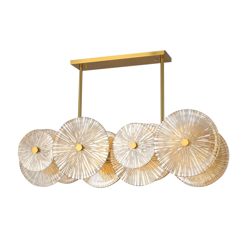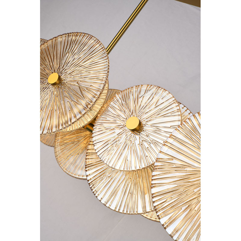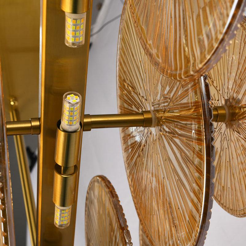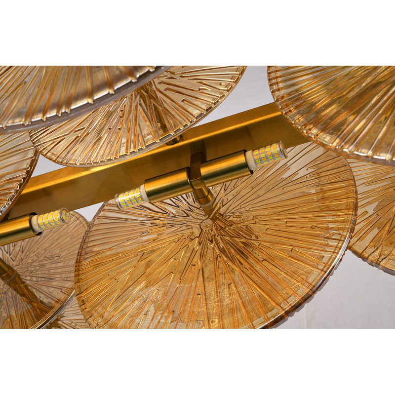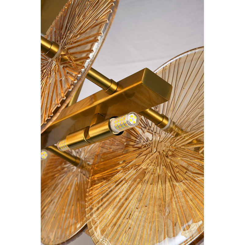A BRASS FRAME CHANDELIER WITH CLEAR & AMBER PETAL GLASS SHADES