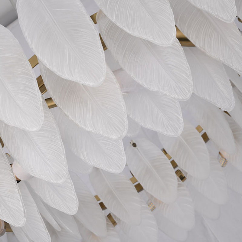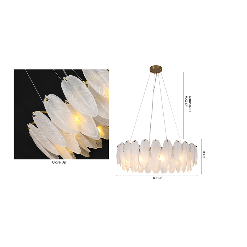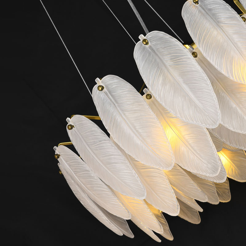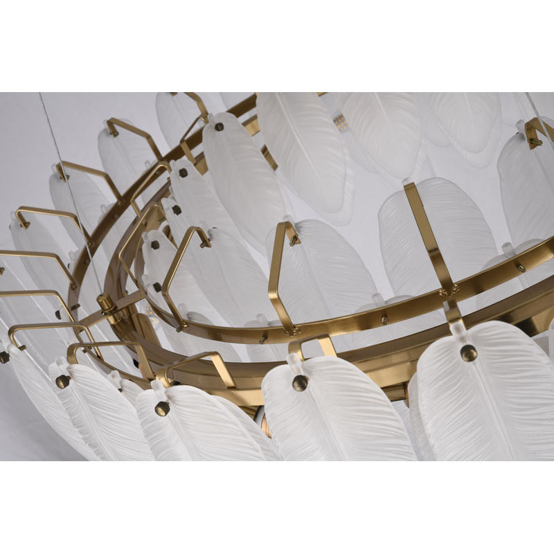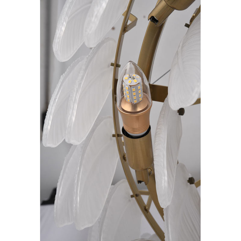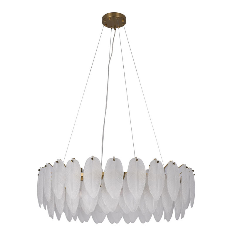 A ROUND BRASS FRAME CHANDELIER WITH HANGING FROSTED WHITE GLASS LEAFS