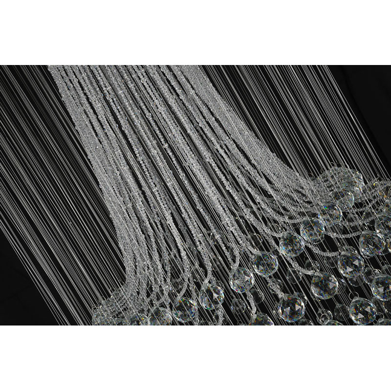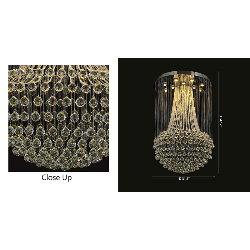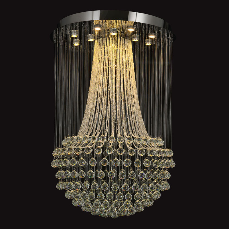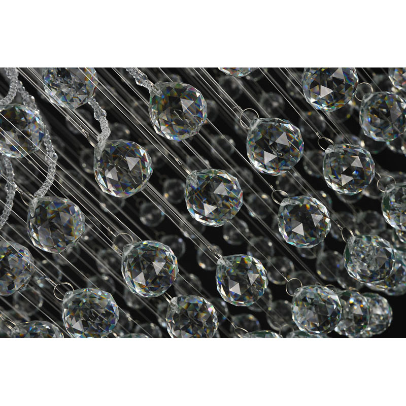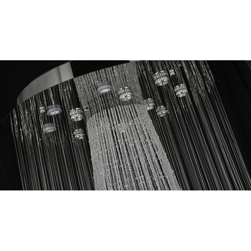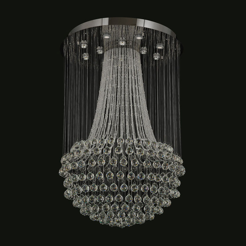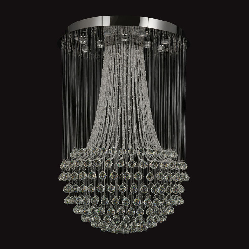 A CHROME FLUSHED CHANDELIER WITH CLEAR HANGING CRYSTALS AND BEADS
