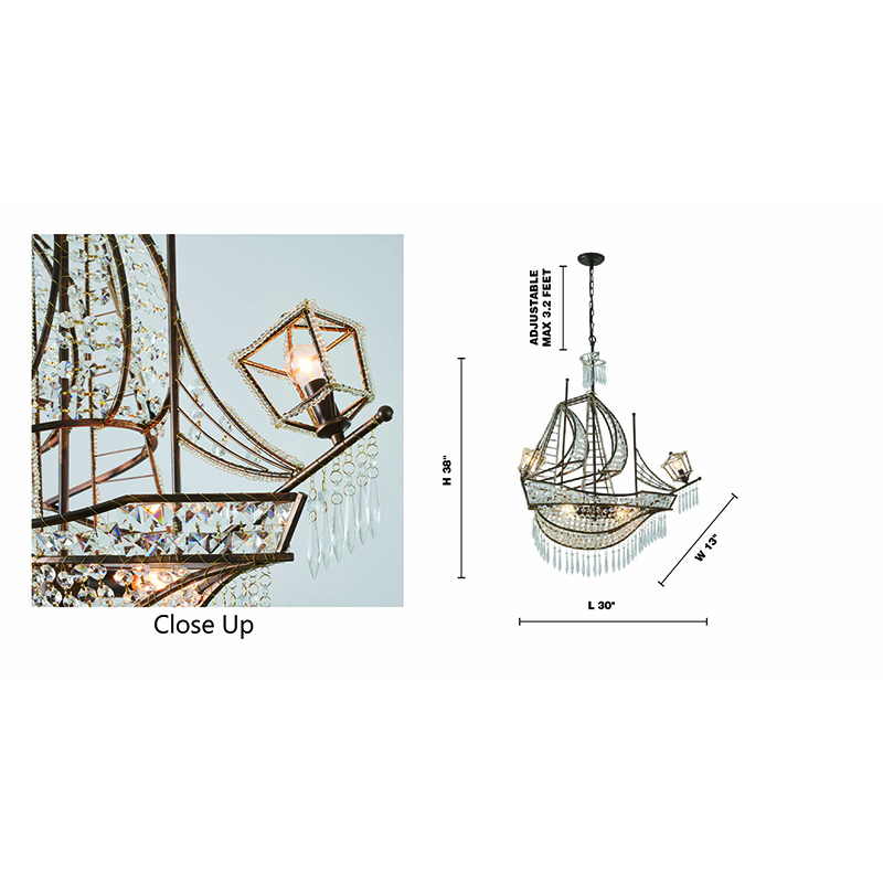 A GOLDEN BRONZE METAL FRAME SAIL BOAT CHANDELIER WITH CLEAR CRYSTALS