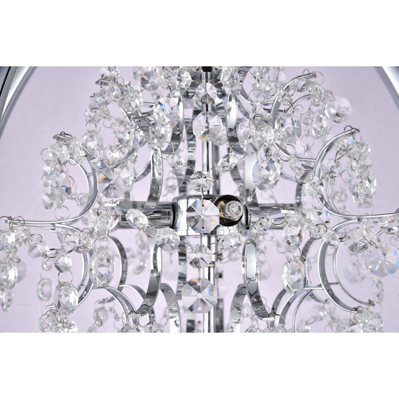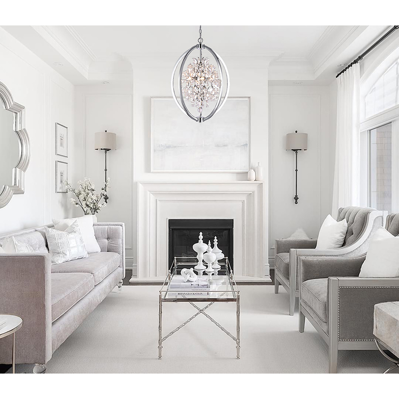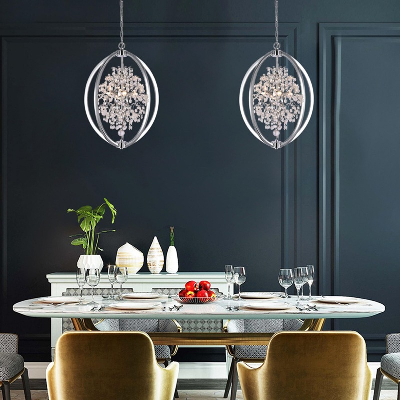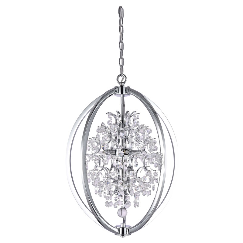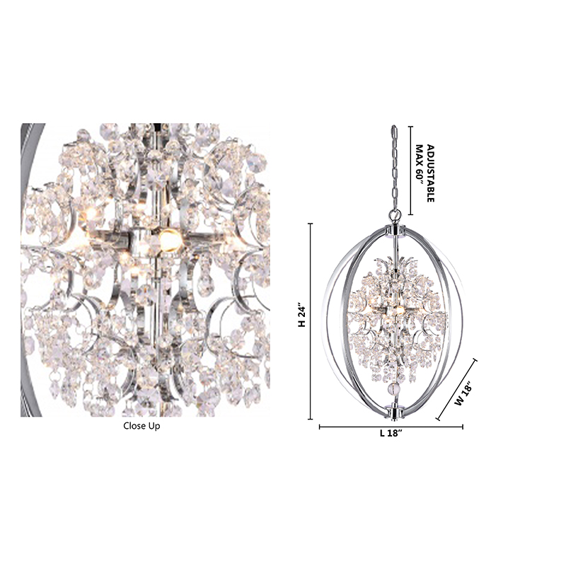 A CHROME SPHERE CAGE CHANDELIER WITH CLEAR HANGING BEADED CRYSTALS