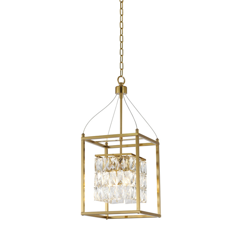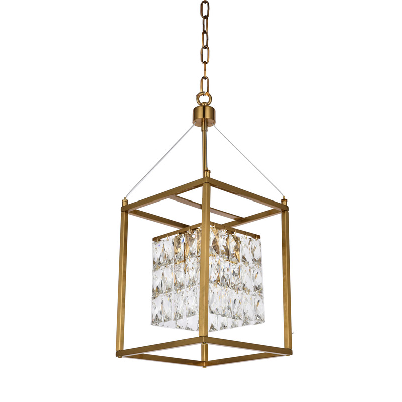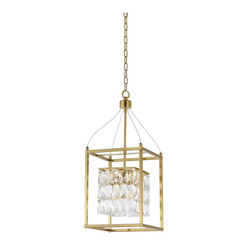 AN ANTIQUE BRASS METAL FRAME CHANDELIER WITH CLEAR HANGING CRYSTALS
