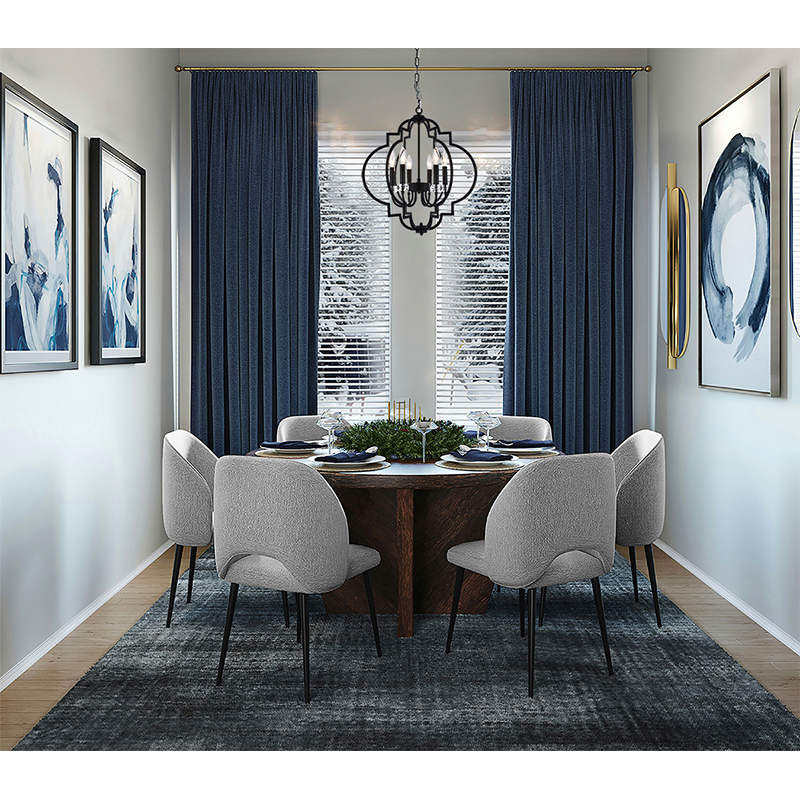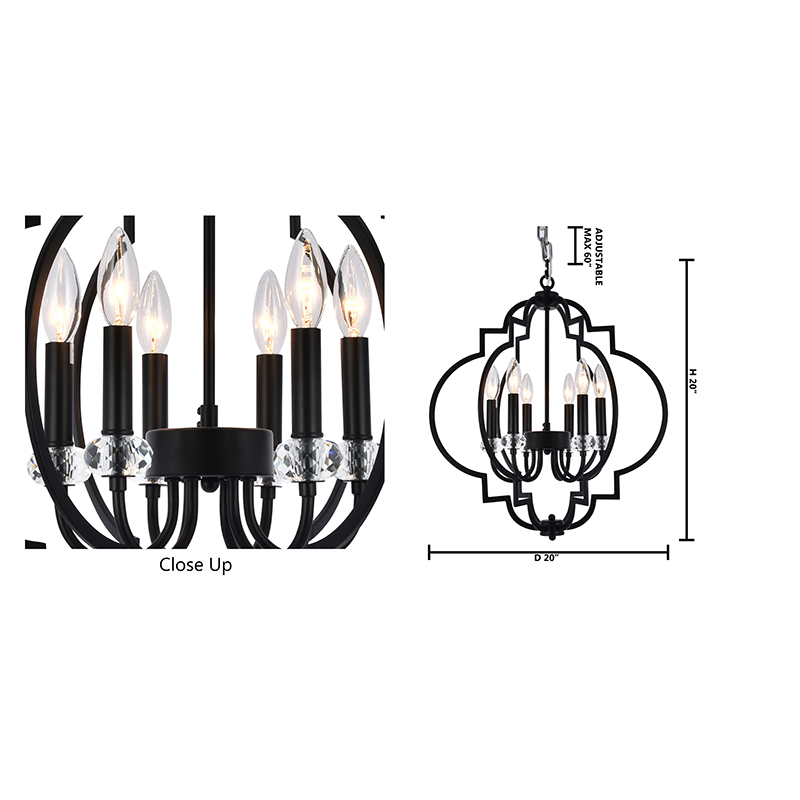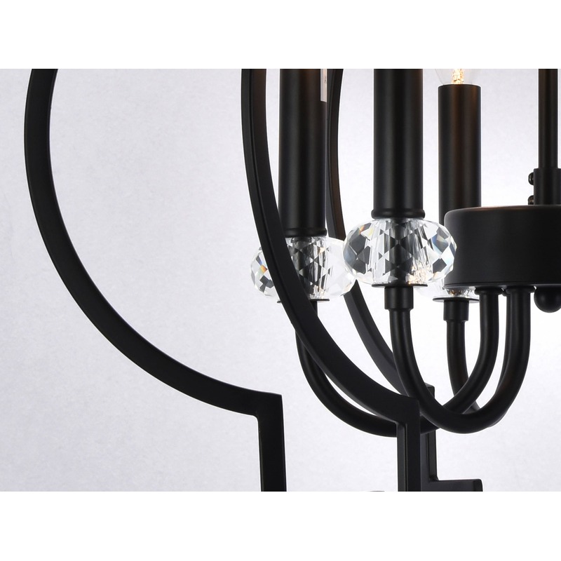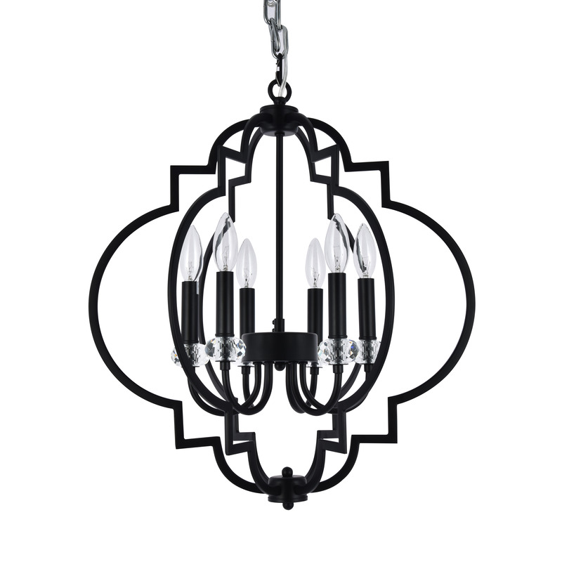 A BLACK CAGED CEILING FIXTURE WITH CLEAR CRYSTAL BOBECHES AND A CANDLE LIGHT INTERIOR