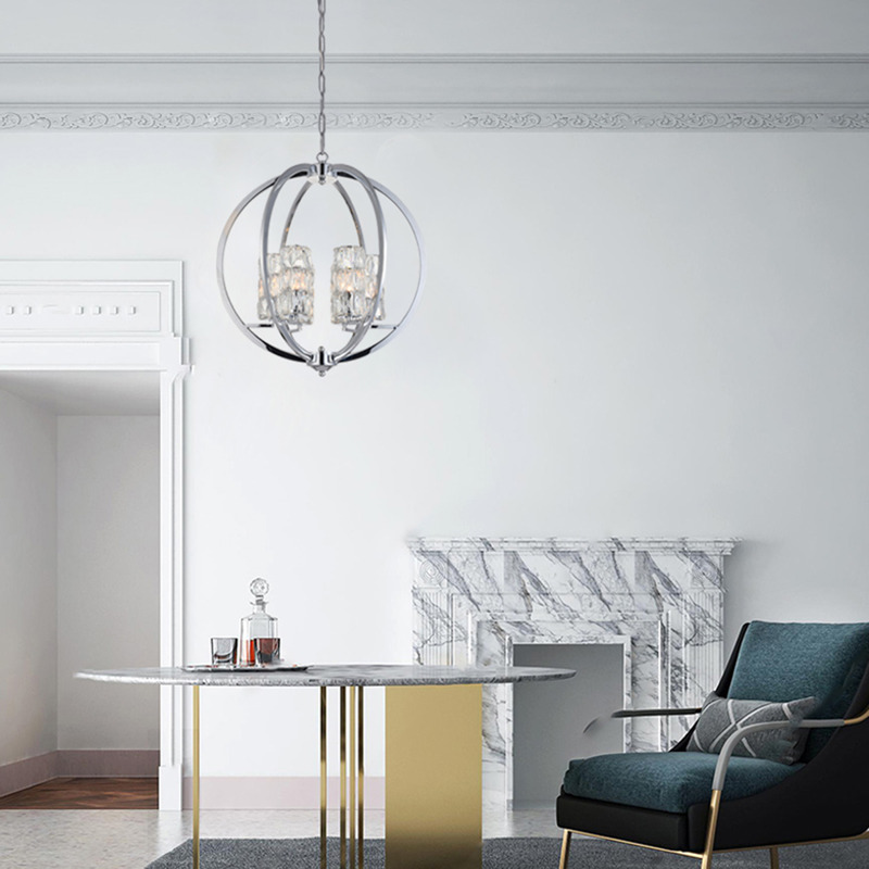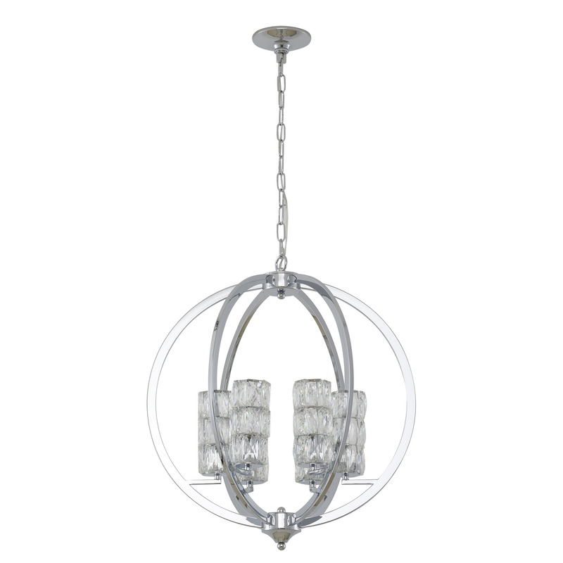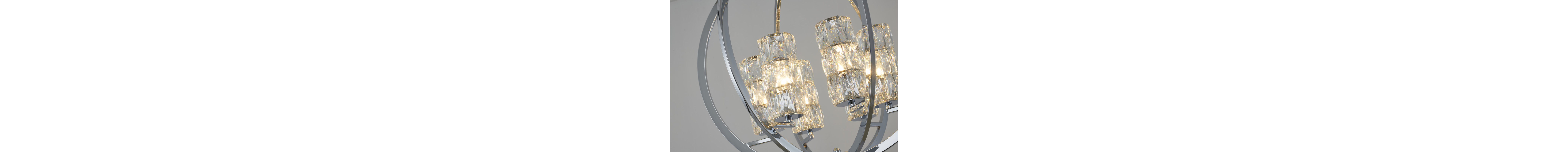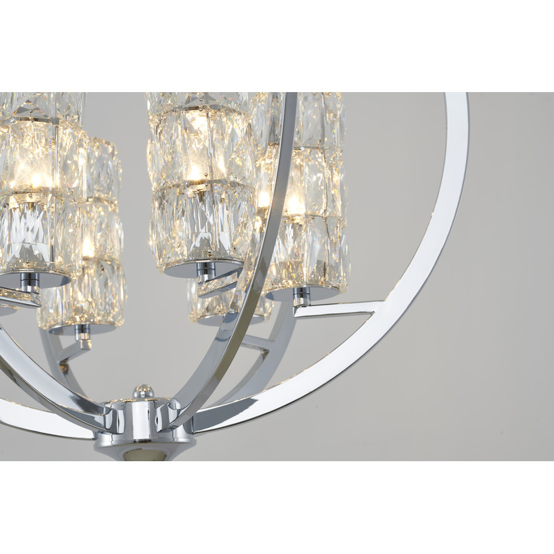 A CHROME ORB FRAME CHANDELIER WITH CLEAR CRYSTAL SHADES