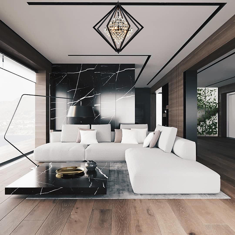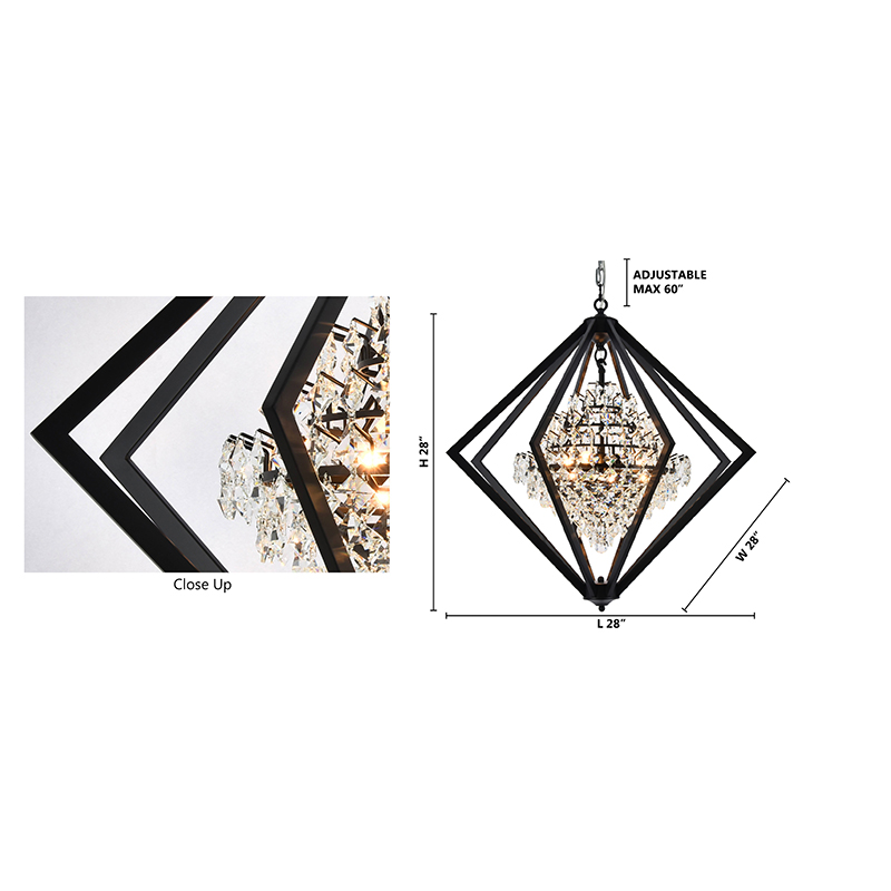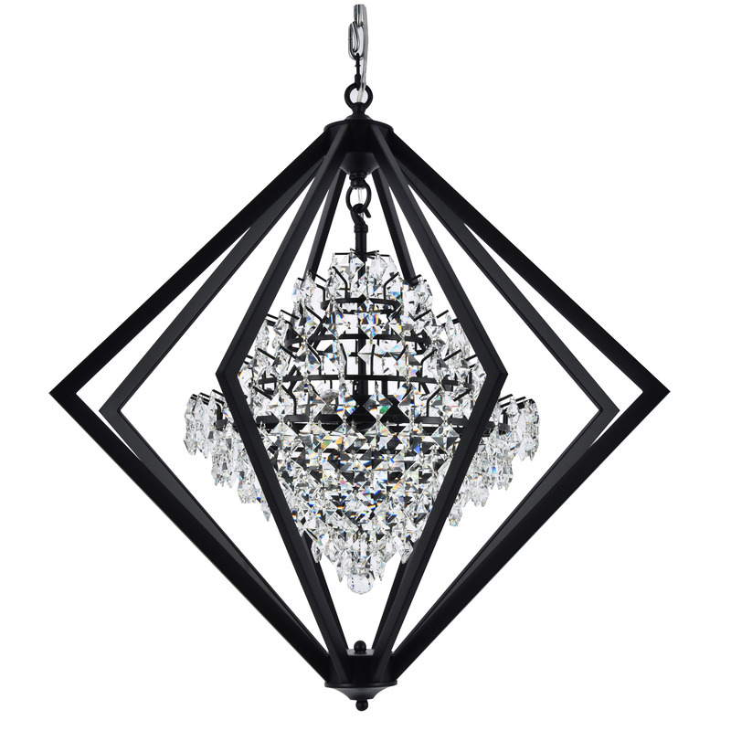 A BLACK METAL DIAMOND CAGE CHANDELIER WITH CLEAR HANGING CRYSTALS