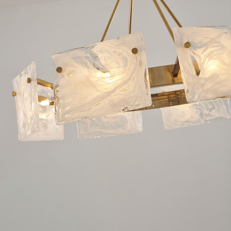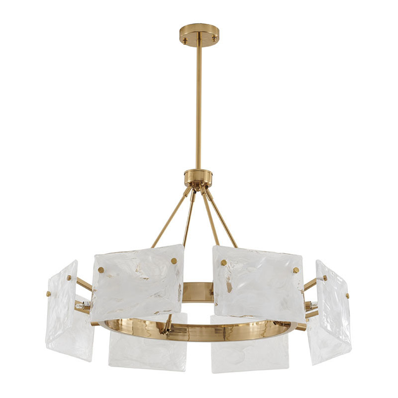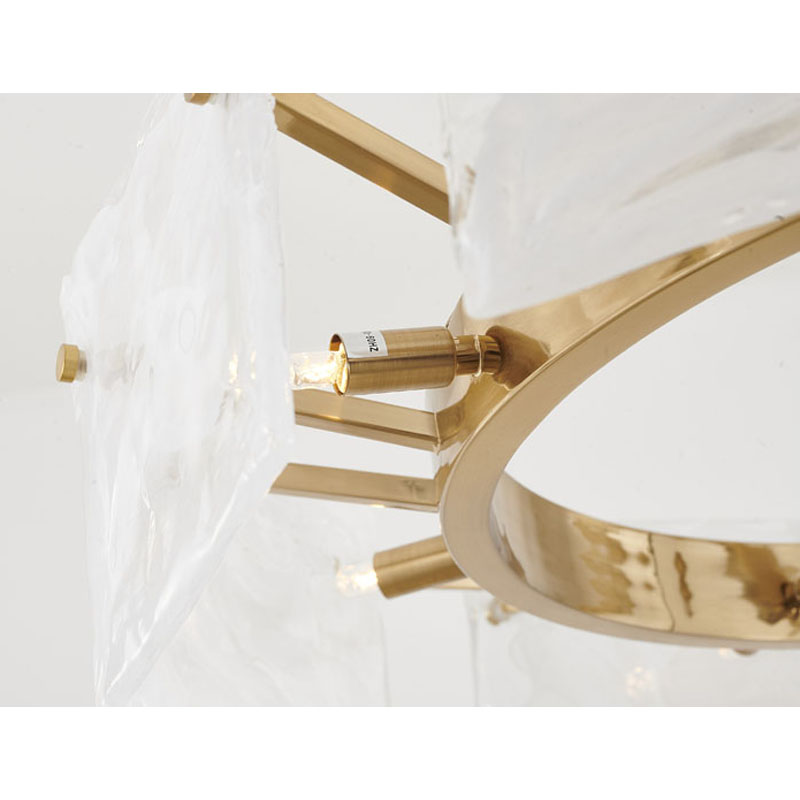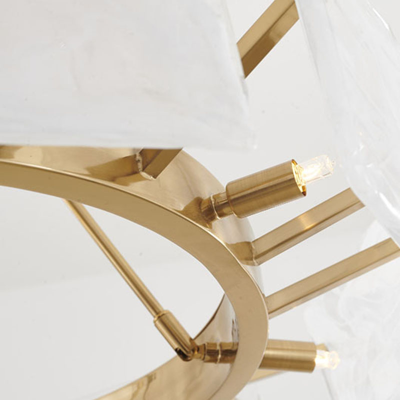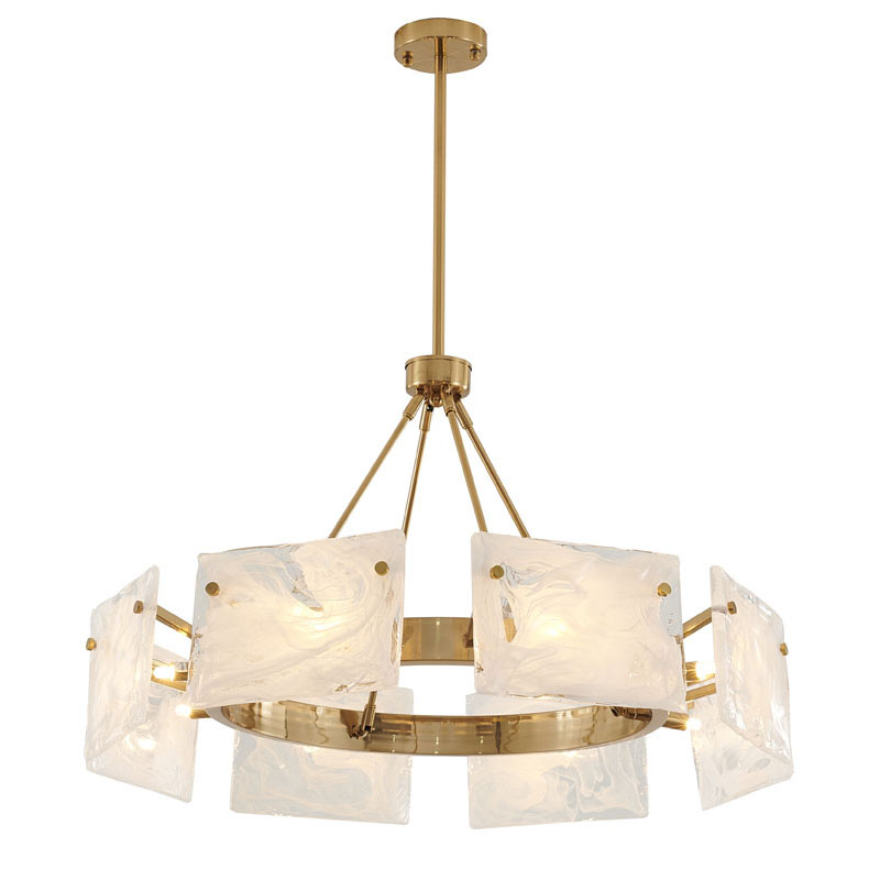A GOLD PLATED CHANDELIER WITH WHITE STAINED GLASS SHADES