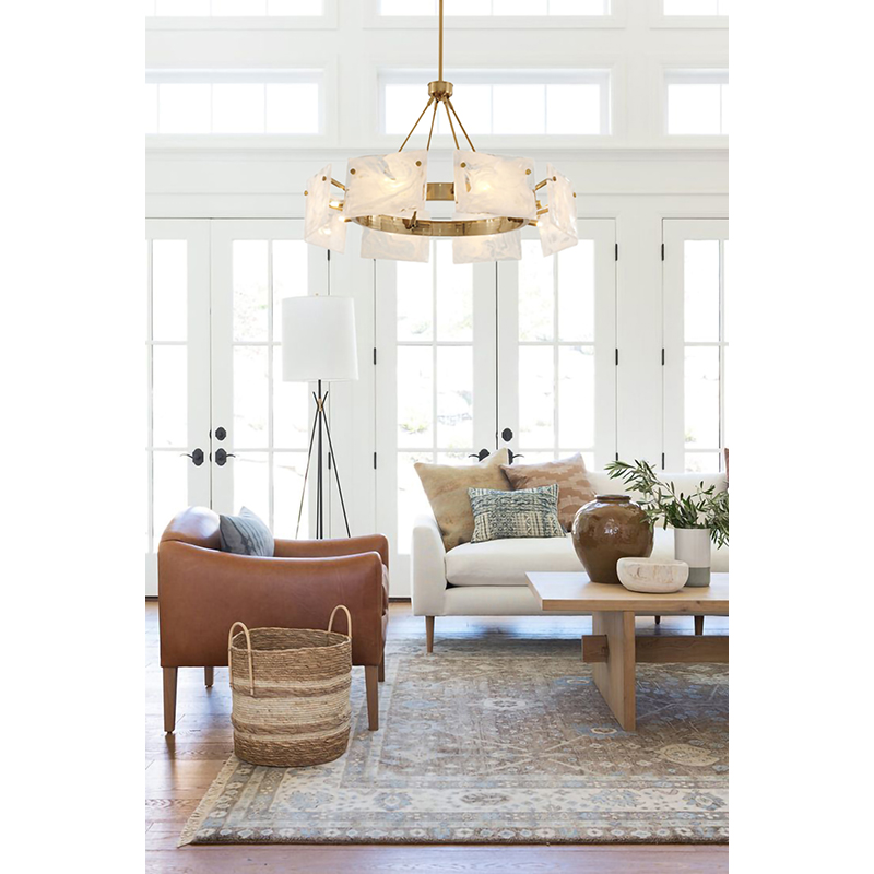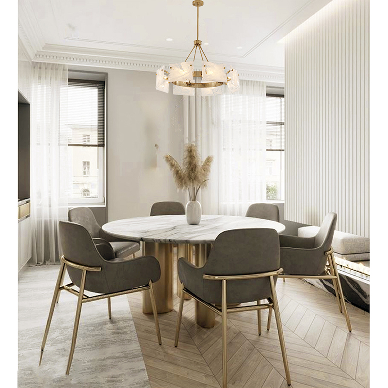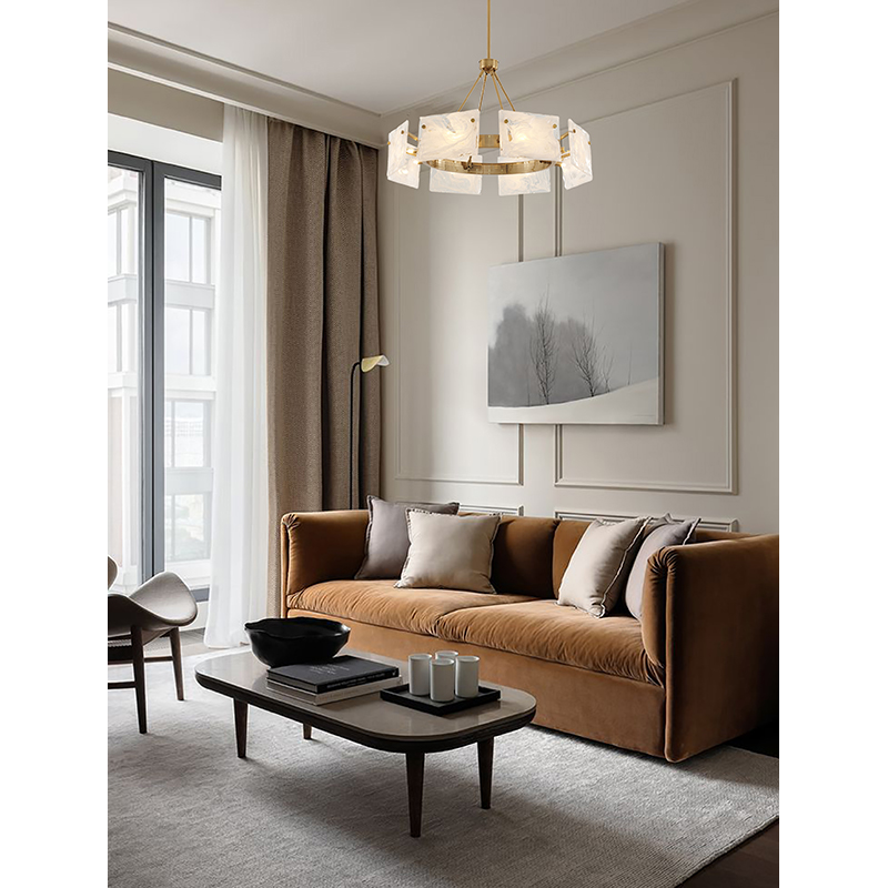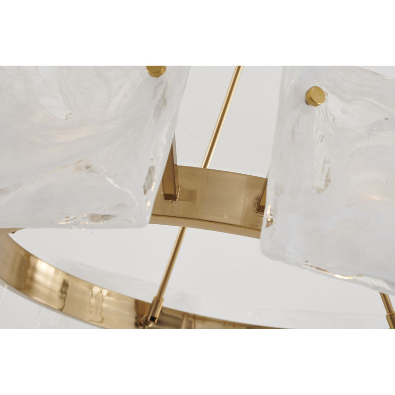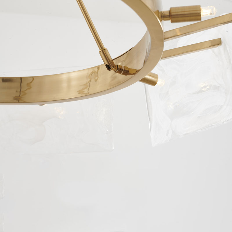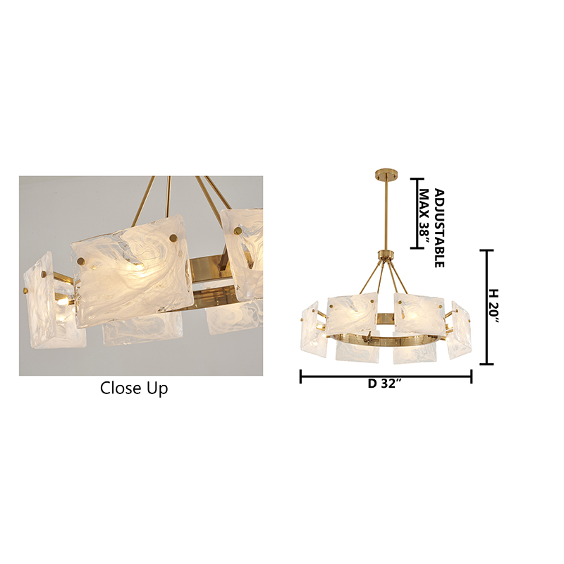 A GOLD PLATED CHANDELIER WITH WHITE STAINED GLASS SHADES