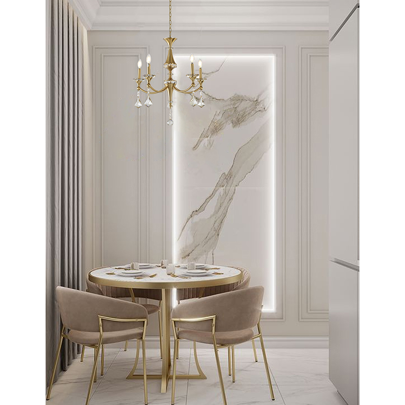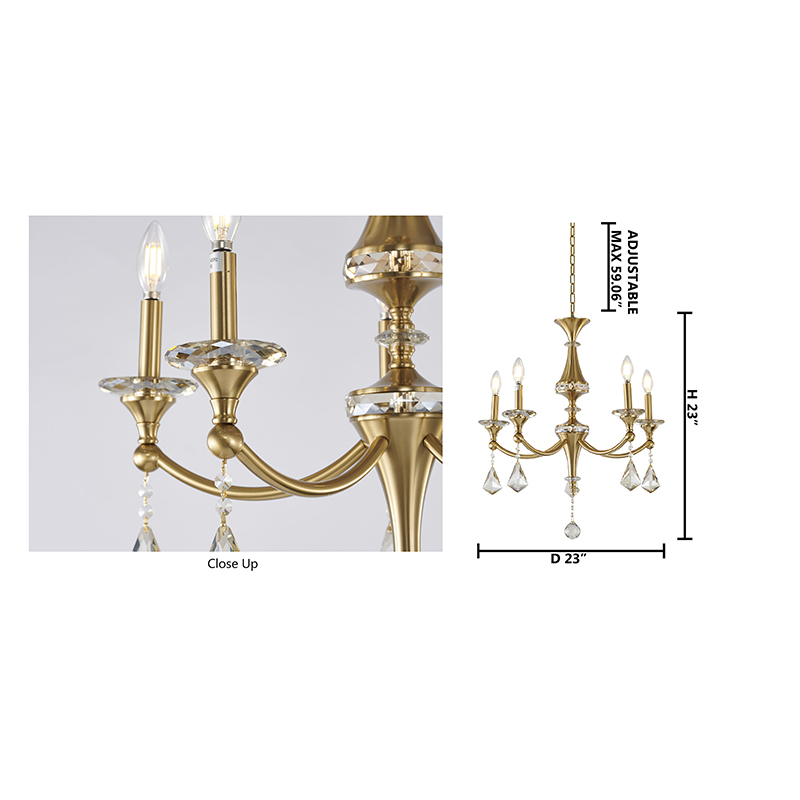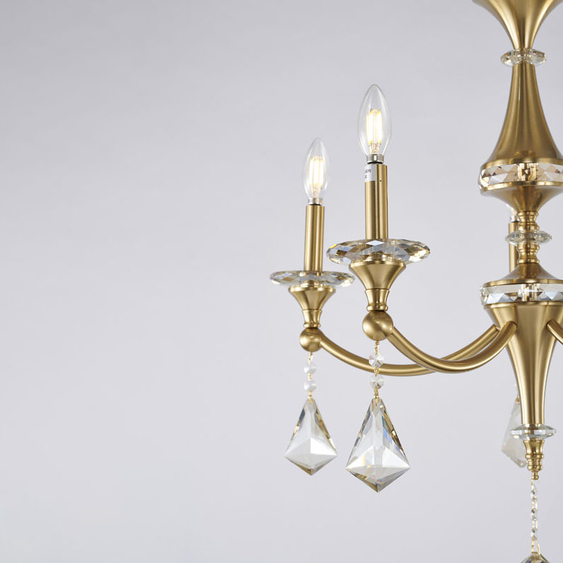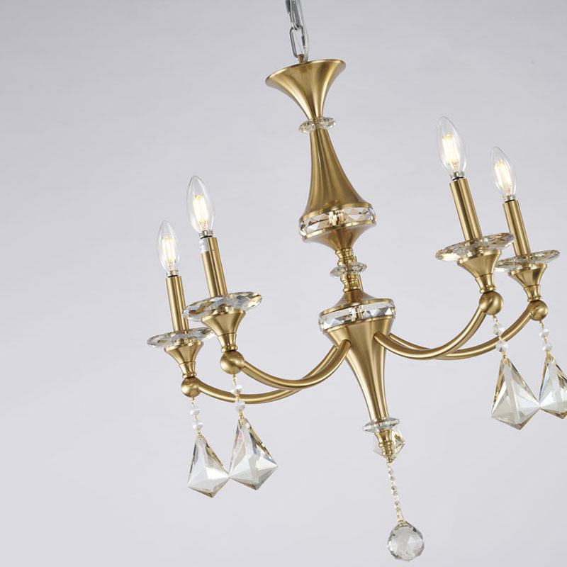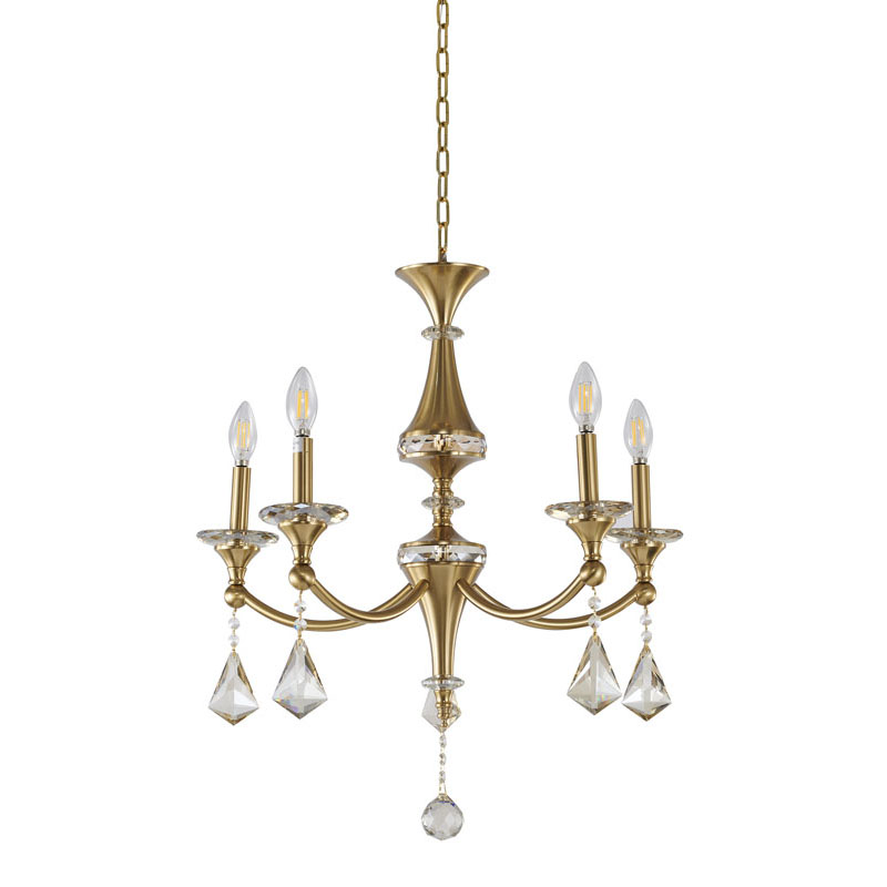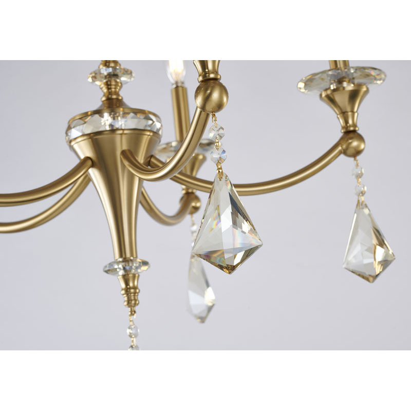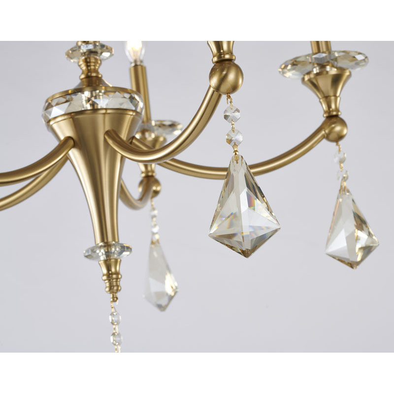 A SATIN BRASS FRAME CHANDELIER WITH CHAMPAGNE HANGING CRYSTALS & ACCENTS