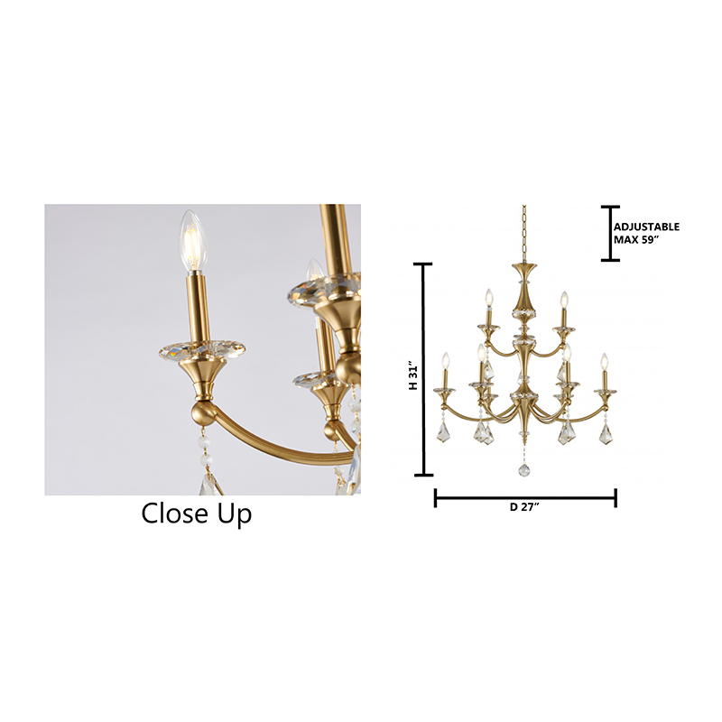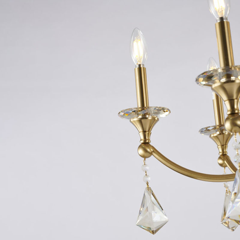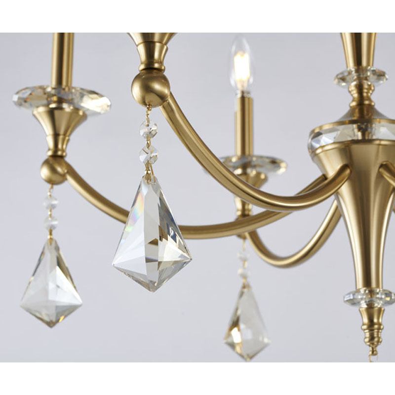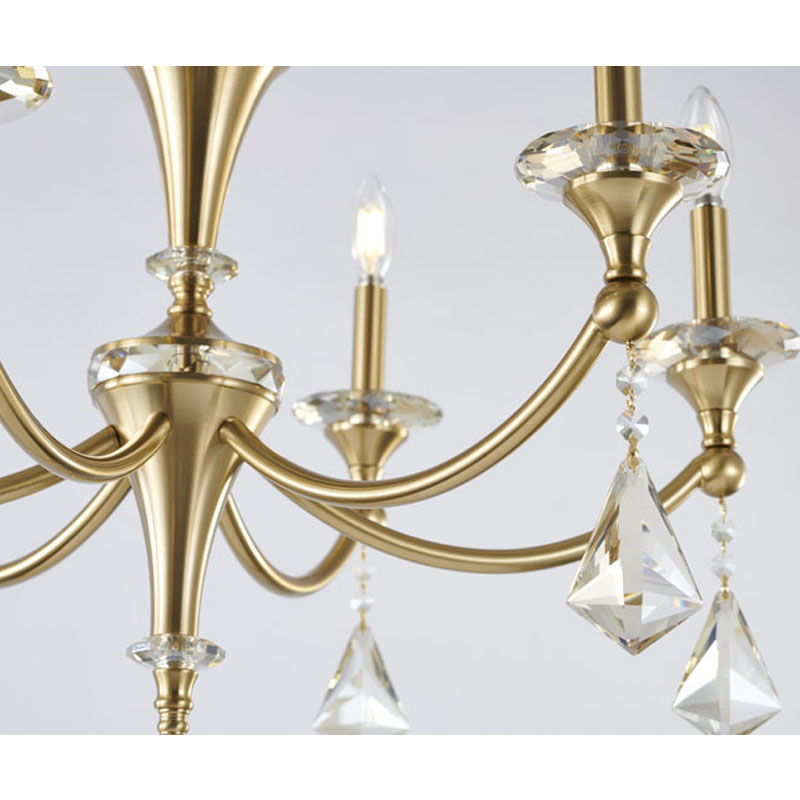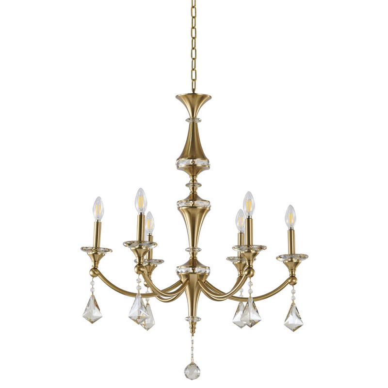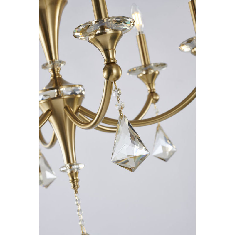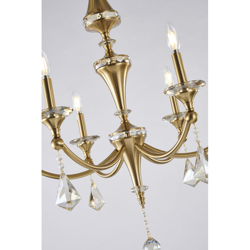 A SATIN BRASS FRAME CHANDELIER WITH CHAMPAGNE HANGING CRYSTALS & ACCENTS