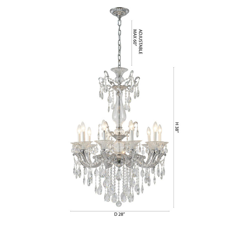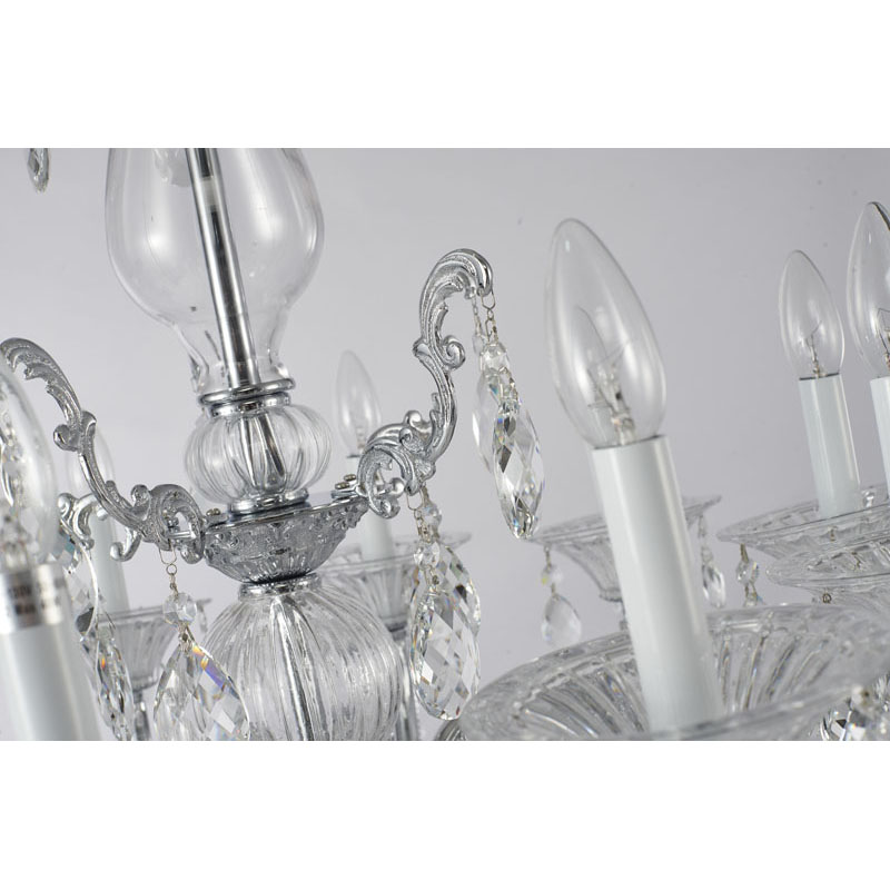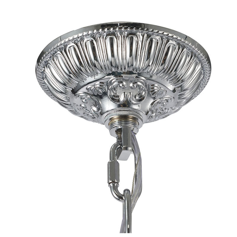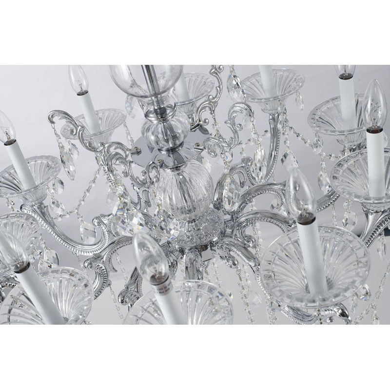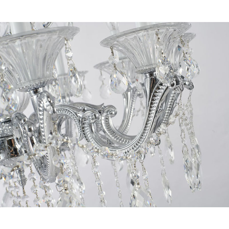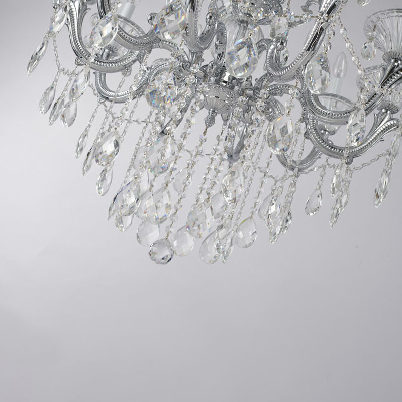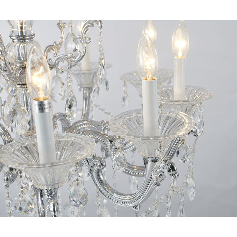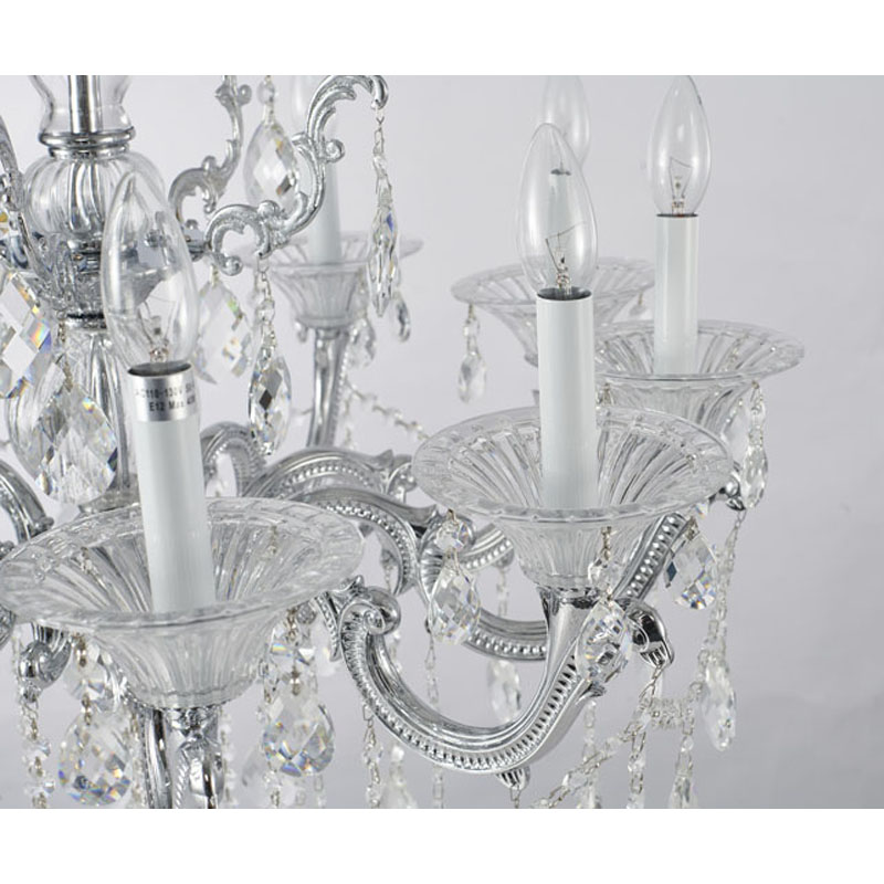 A CHROME METAL FRAME CHANDELIER WITH CLEAR HANGING CRYSTALS