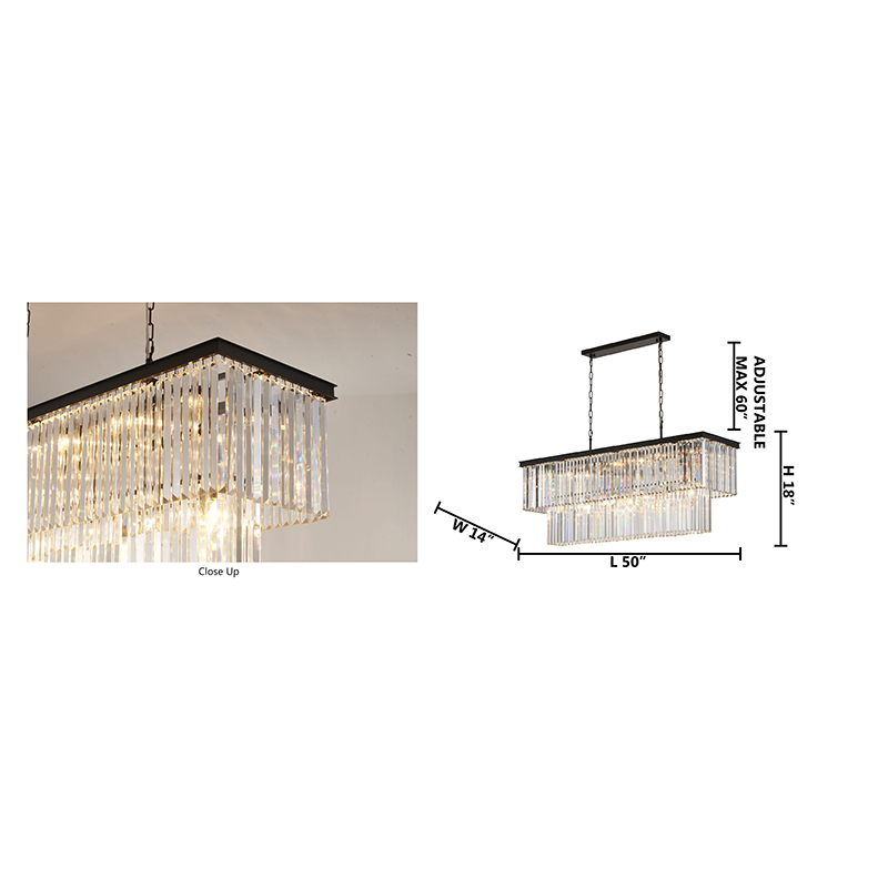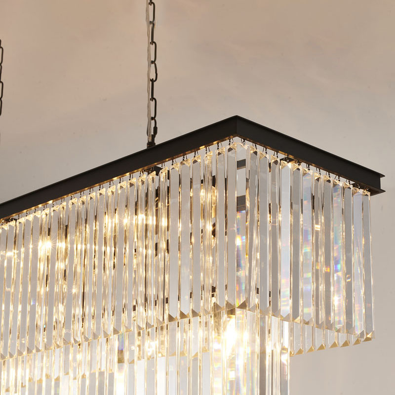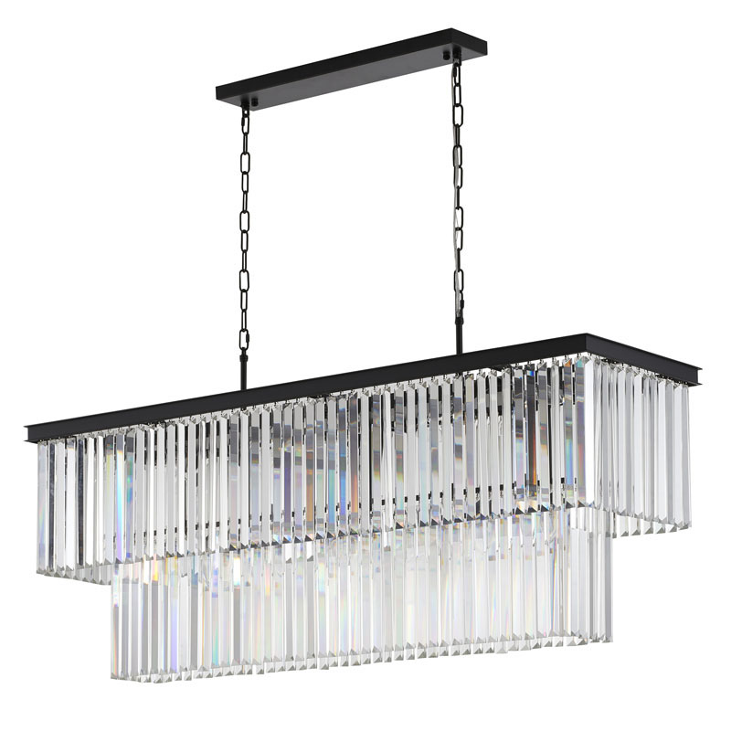 A TWO TIER BLACK FRAME CHANDELIER WITH CLEAR HANGING CRYSTALS