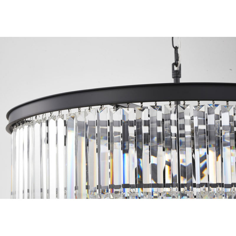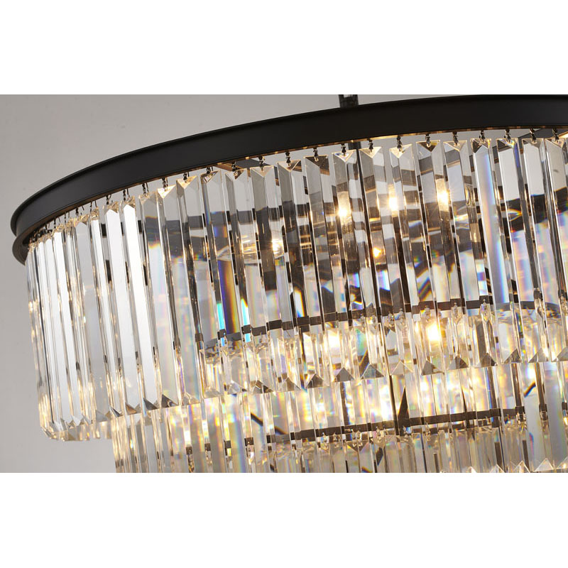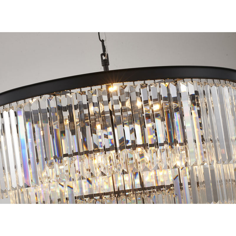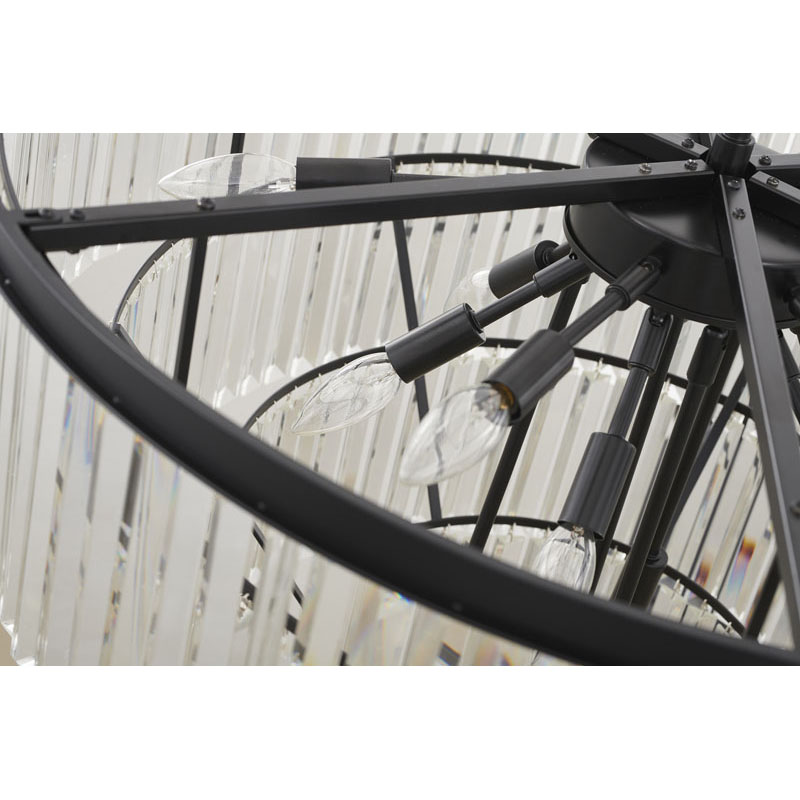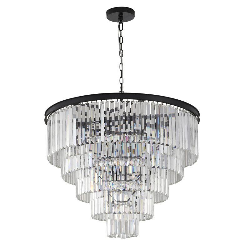 A FIVE TIER BLACK FRAME CHANDELIER WITH CLEAR HANGING CRYSTALS