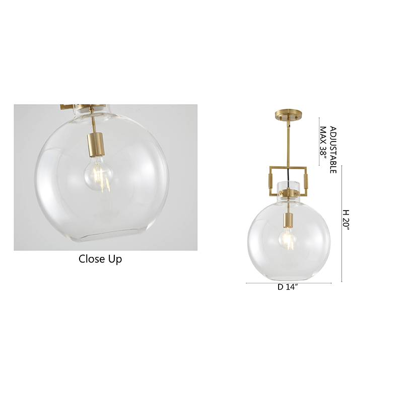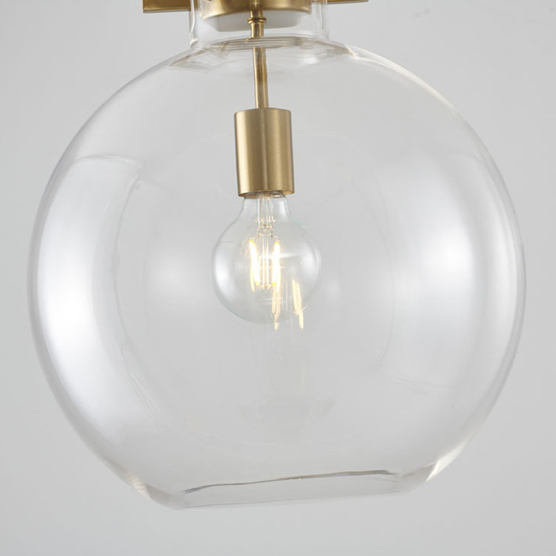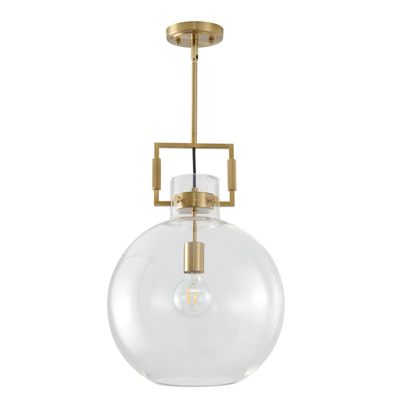 A BRASS METAL FRAME PENDANT LIGHT WITH A CLEAR GLASS SHADE