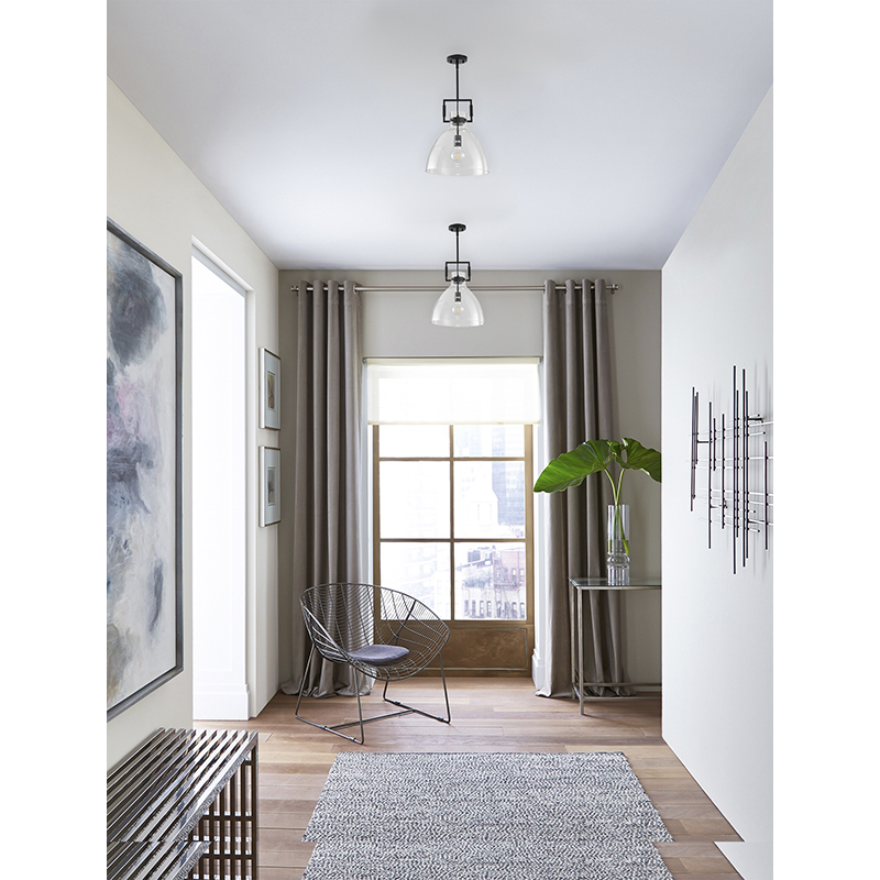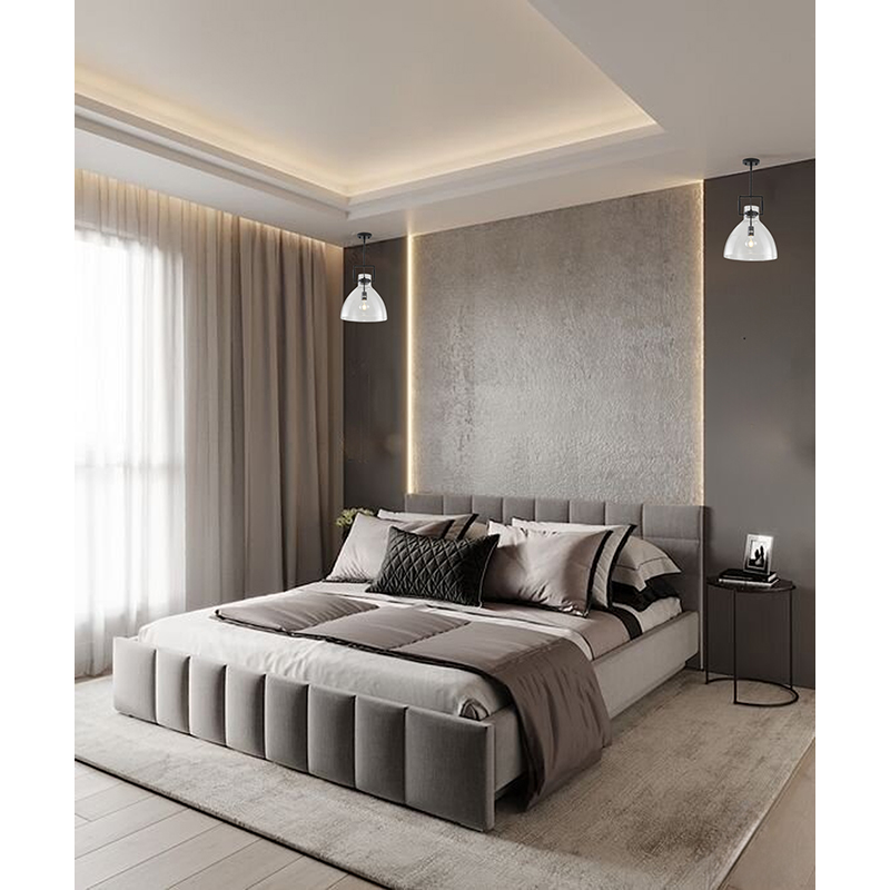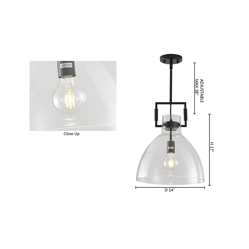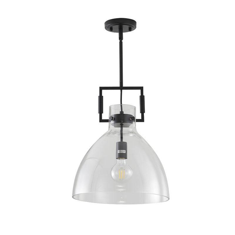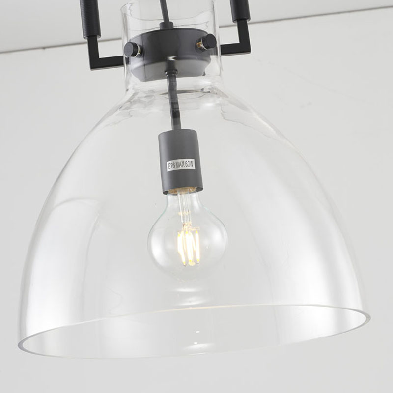 A BLACK METAL FRAME PENDANT LIGHT WITH A CLEAR GLASS SHADE