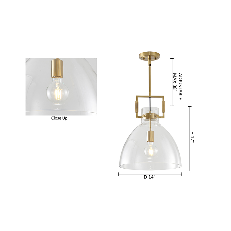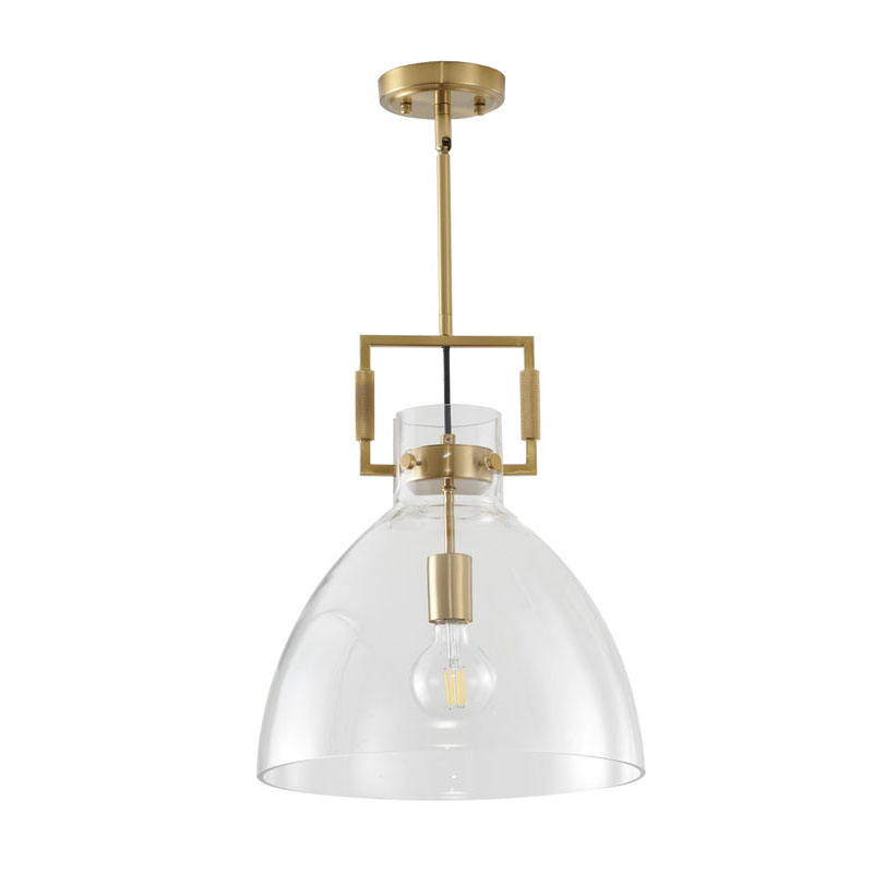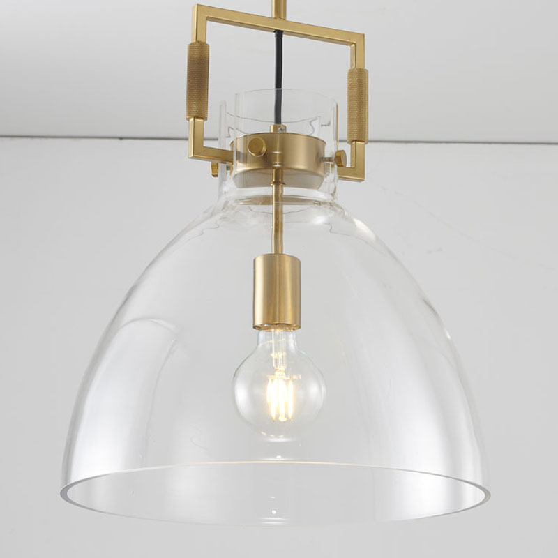 A GOLD METAL FRAME PENDANT LIGHT WITH A CLEAR GLASS SHADE