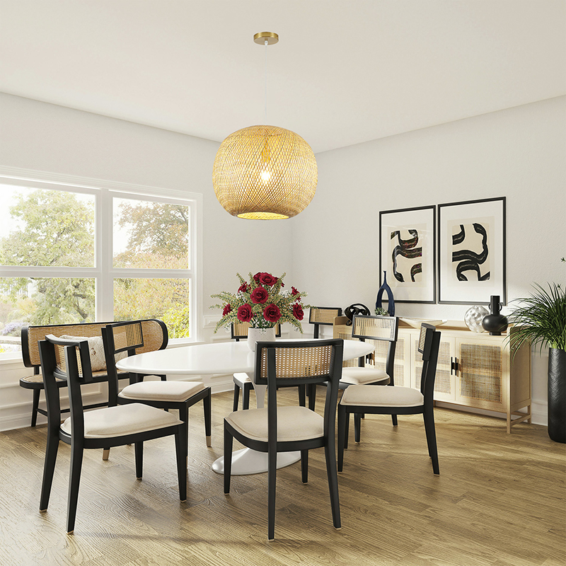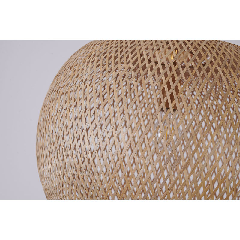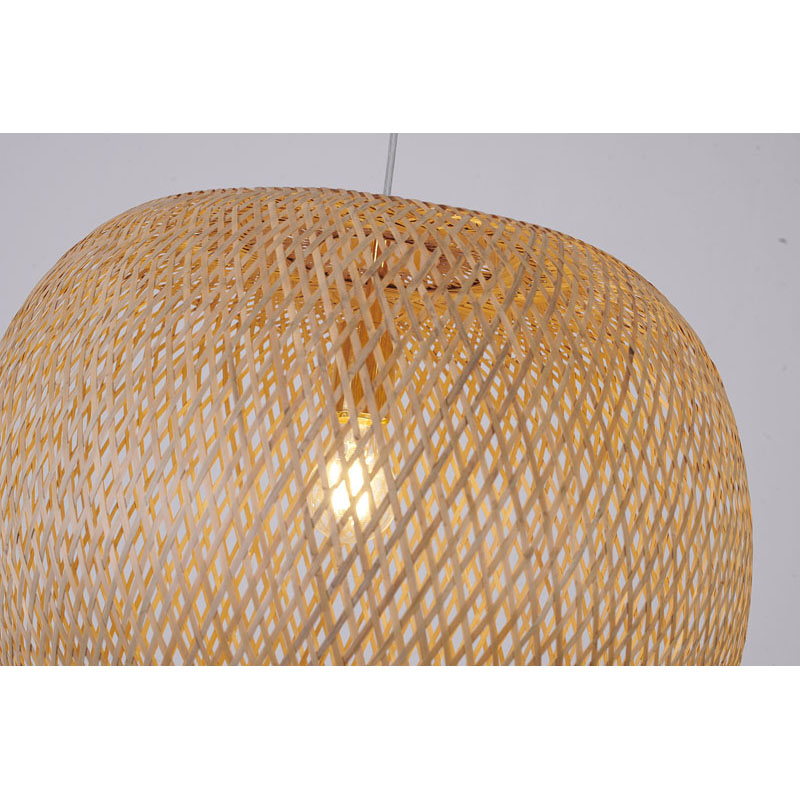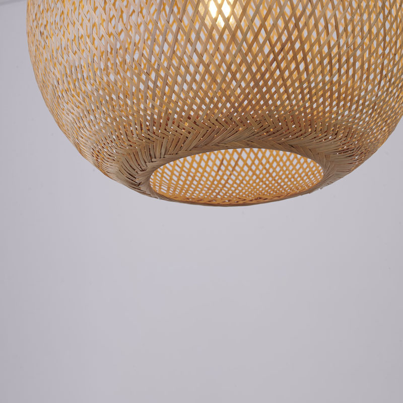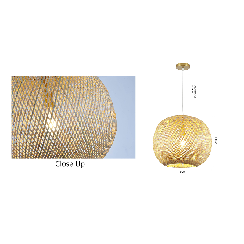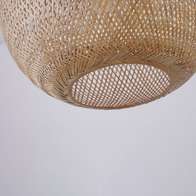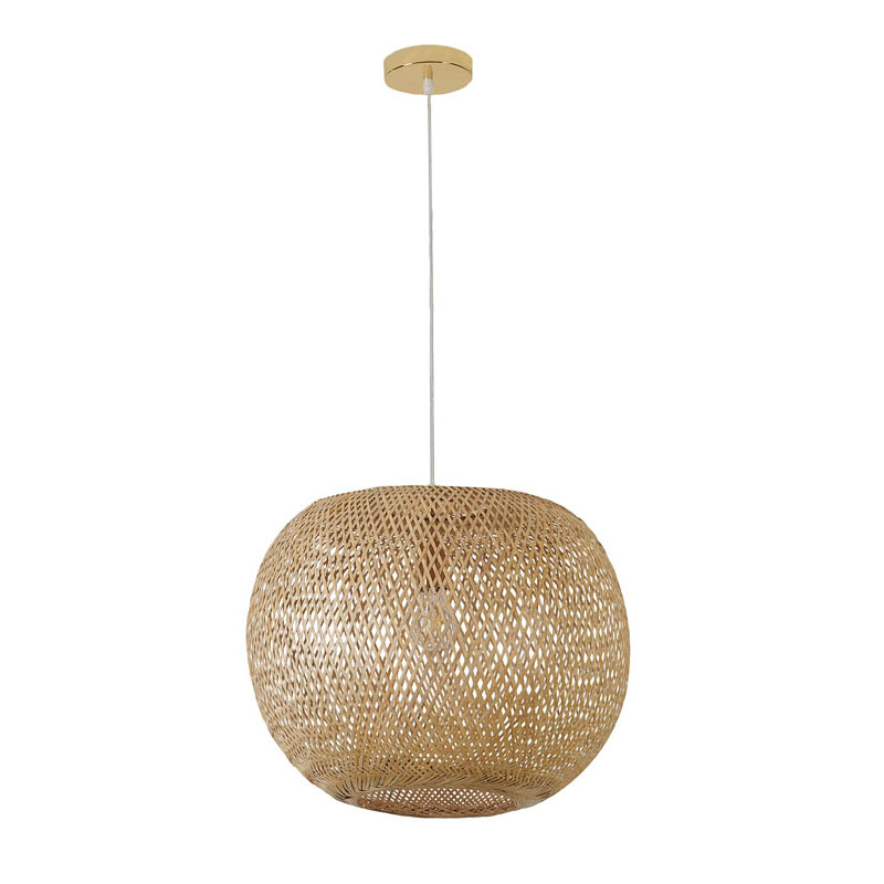 A BAMBOO WOOD WEAVED BASKET PENDANT LIGHT WITH BRASS HARDWARE