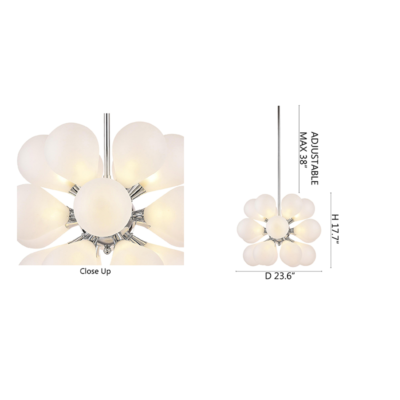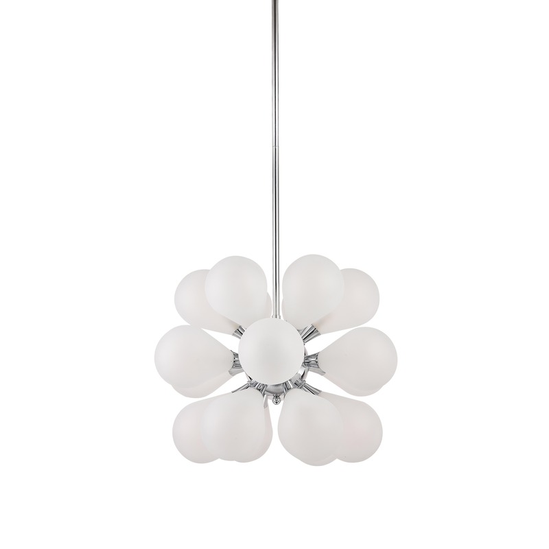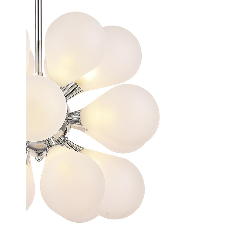 A CHROME FRAME SPUTNIK CEILING FIXTURE WITH WHITE GLASS TEAR DROP SHADES