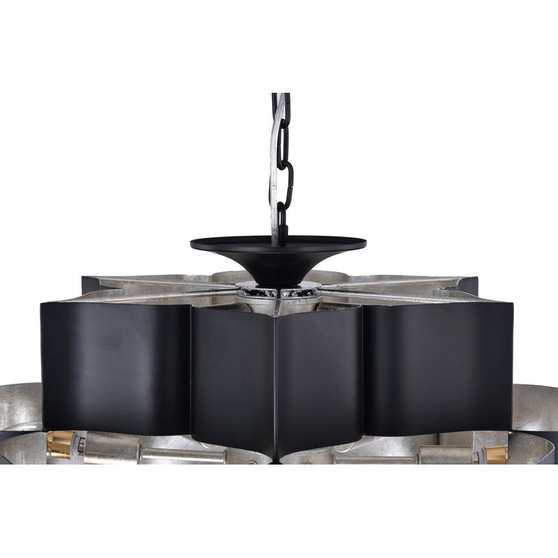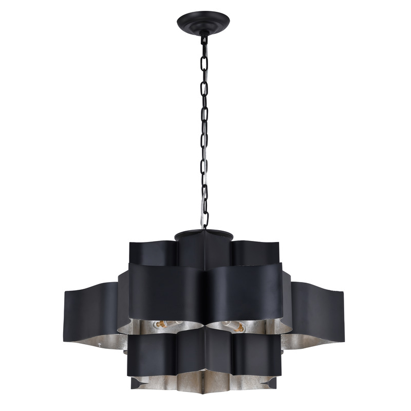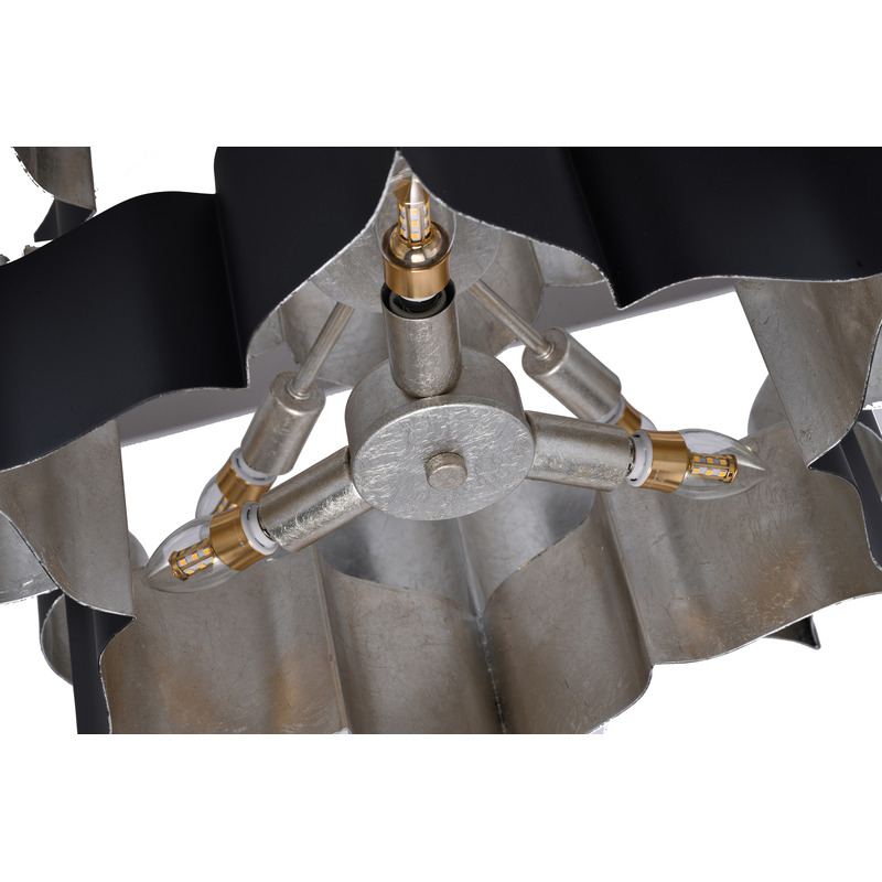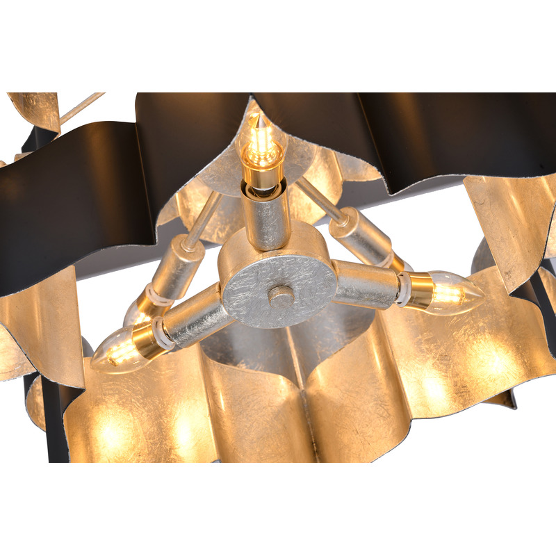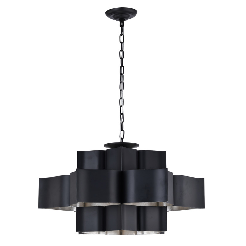 A THREE TIER MATTE BLACK CHANDELIER WITH A SILVER LEAF INTERIOR