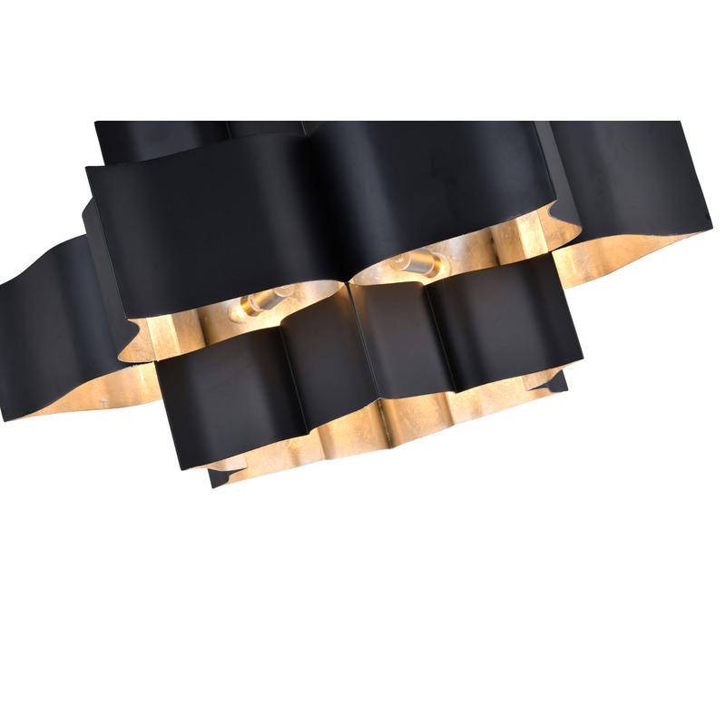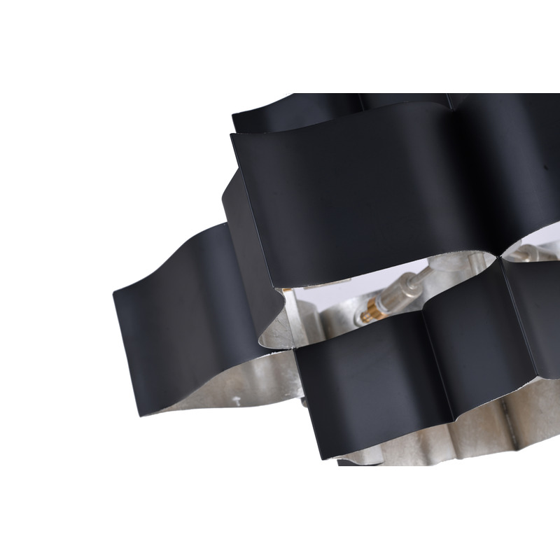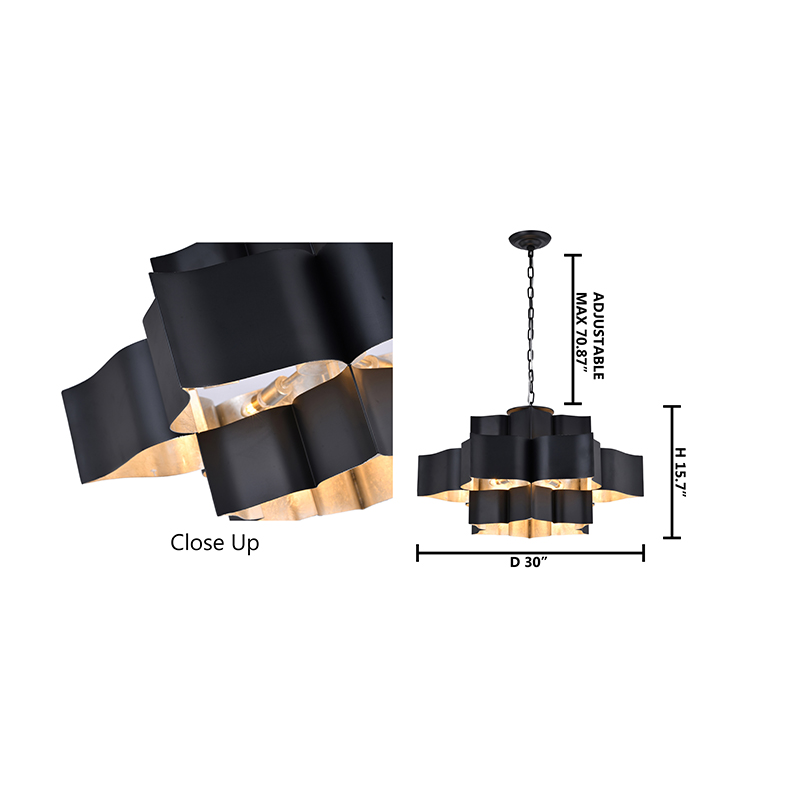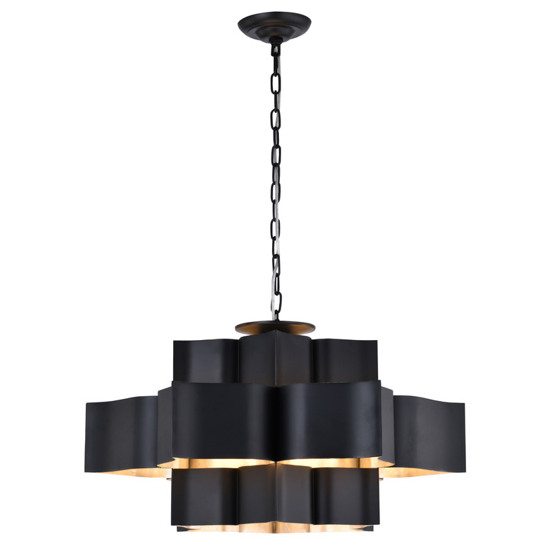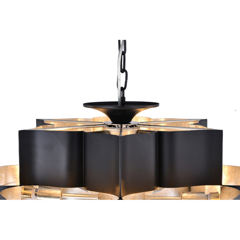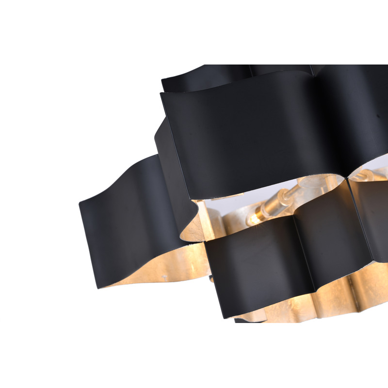 A THREE TIER MATTE BLACK CHANDELIER WITH A SILVER LEAF INTERIOR