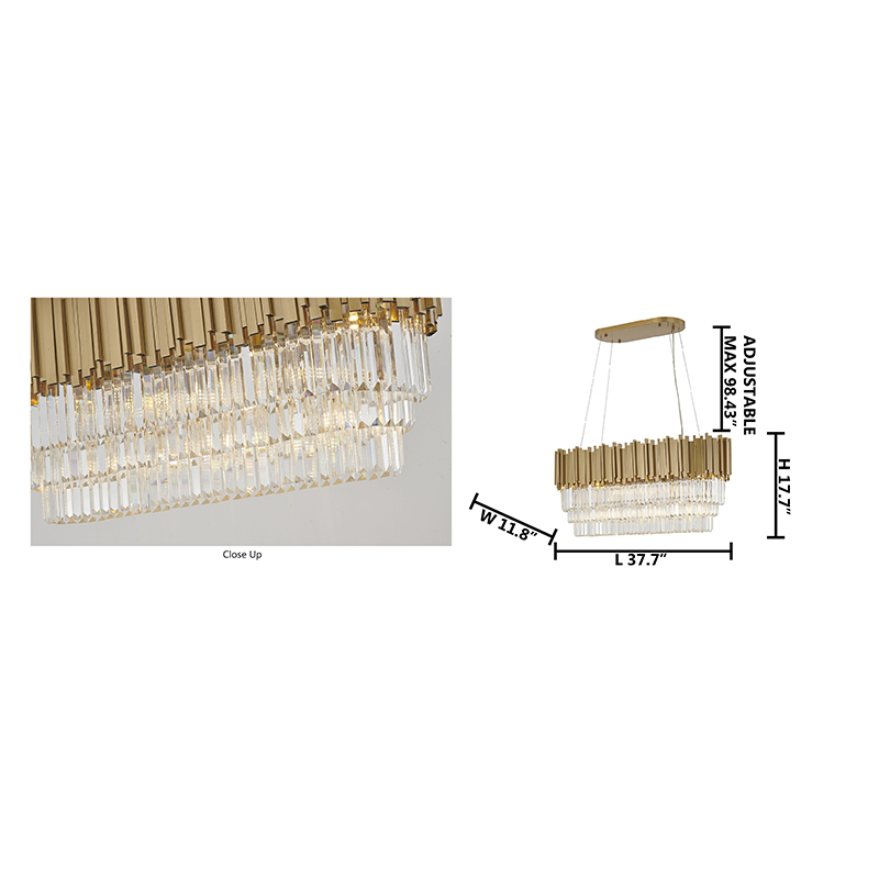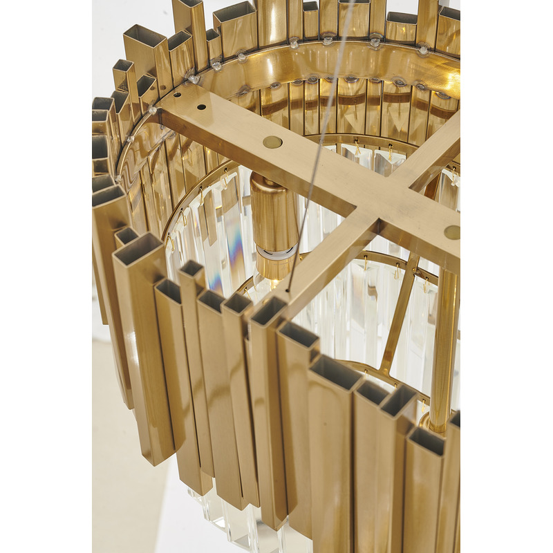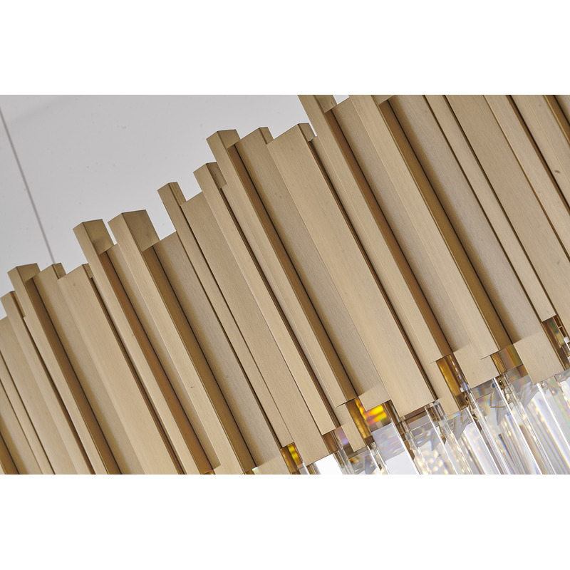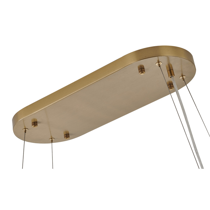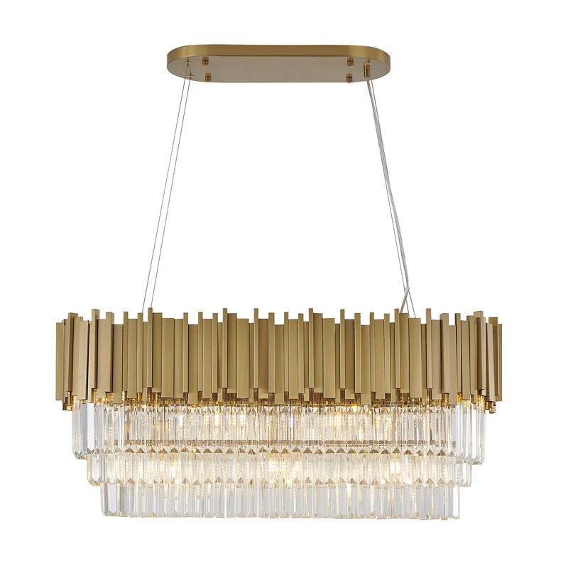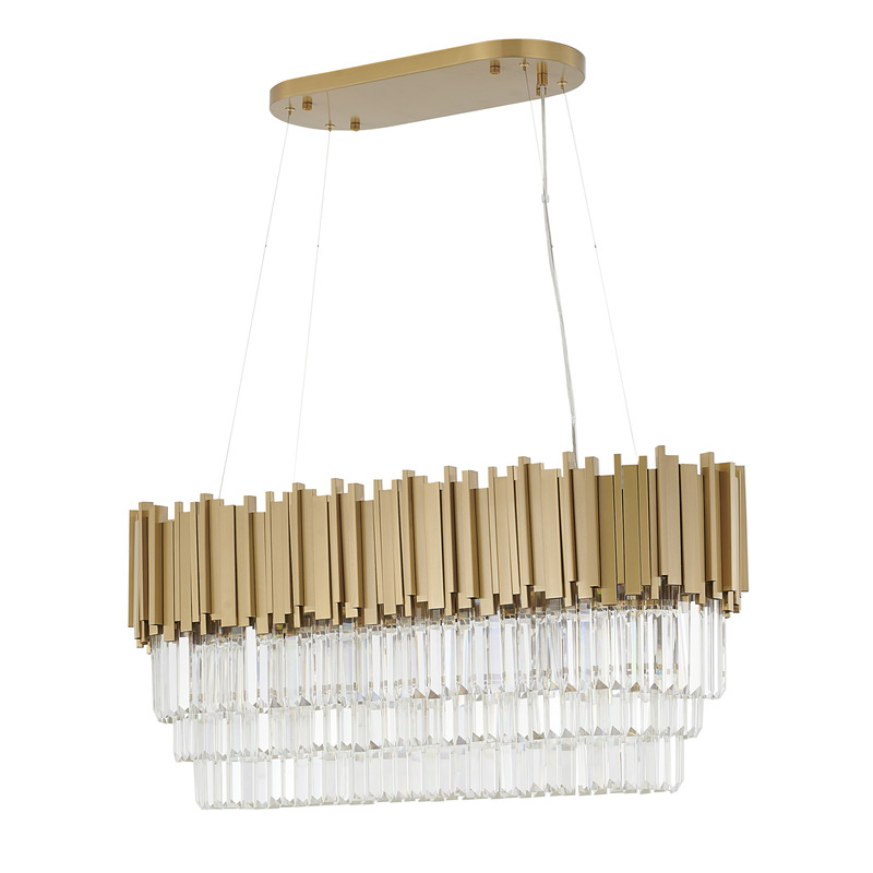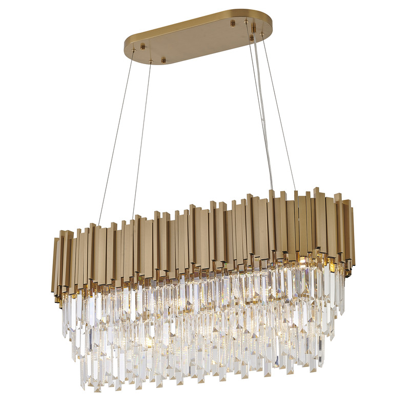 A GOLD HAIRLINE OVAL CHANDELIER WITH THREE TIERS OF HANGING CLEAR CRYSTALS