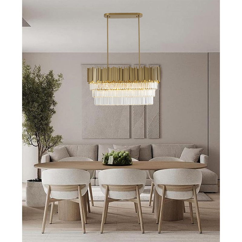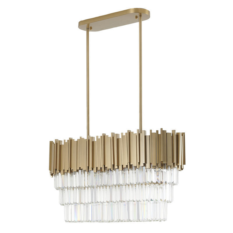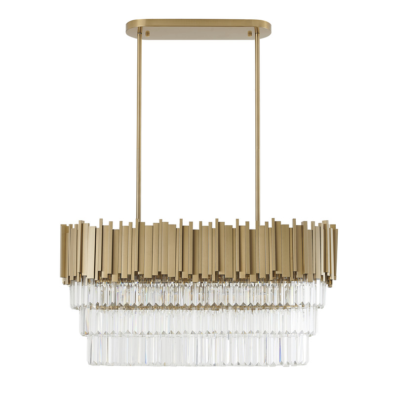 A GOLD HAIR LINE OVAL CHANDELIER WITH THREE TIERS OF CLEAR HANGING CRYSTALS