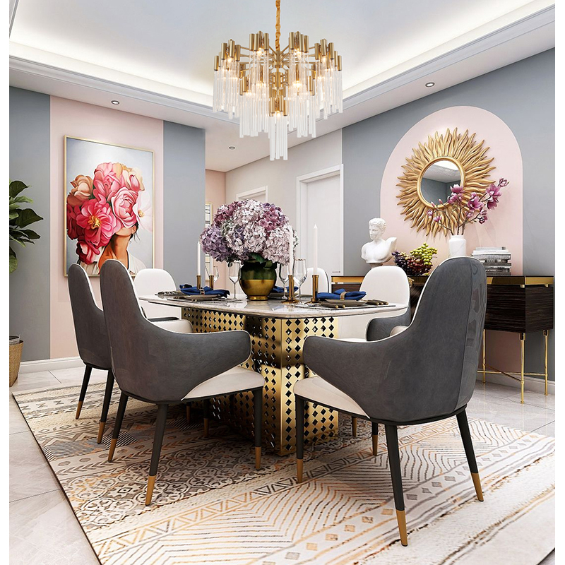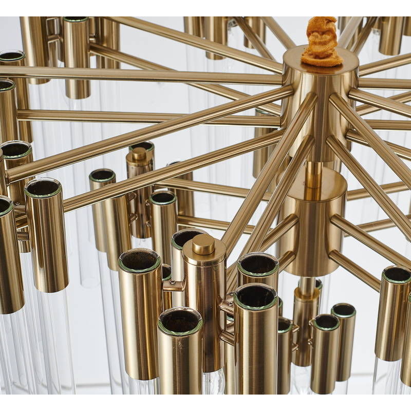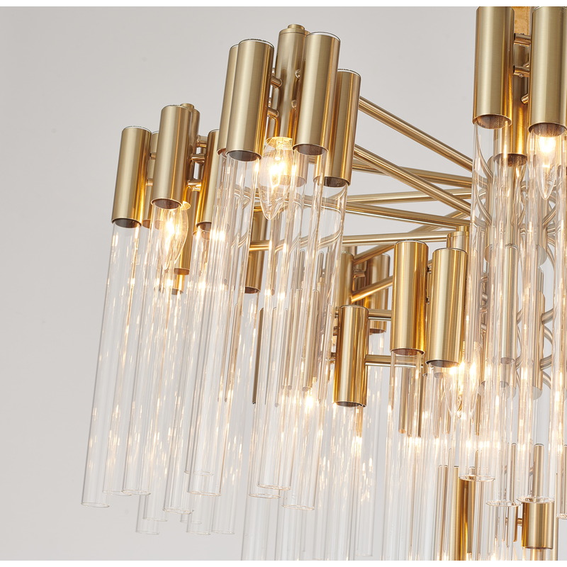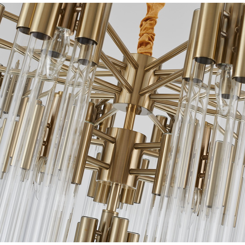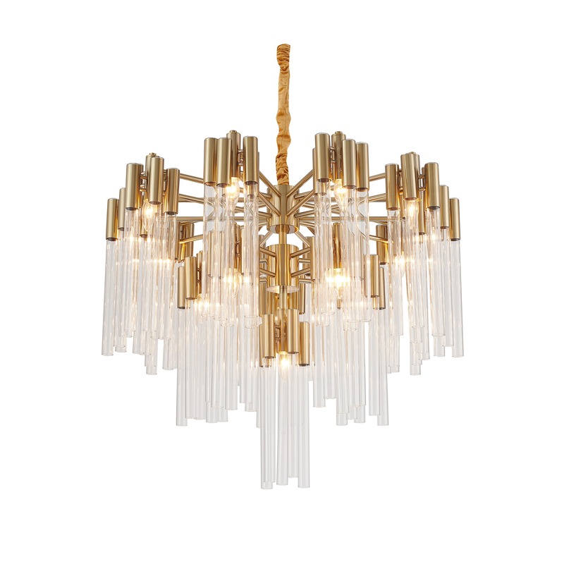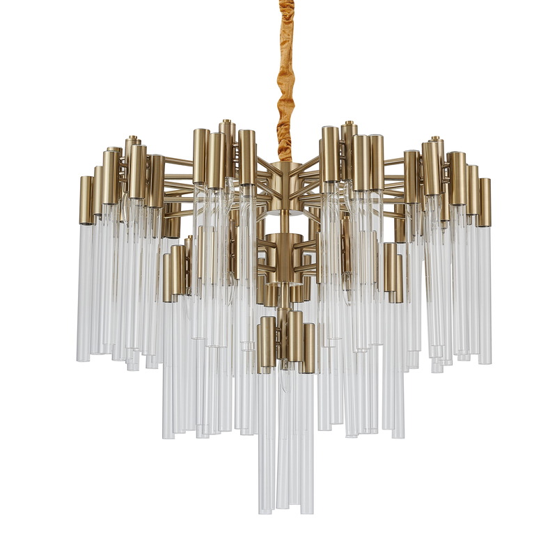 A THREE TIER GOLD FRAME CHANDELIER WITH CLEAR GLASS TUBES