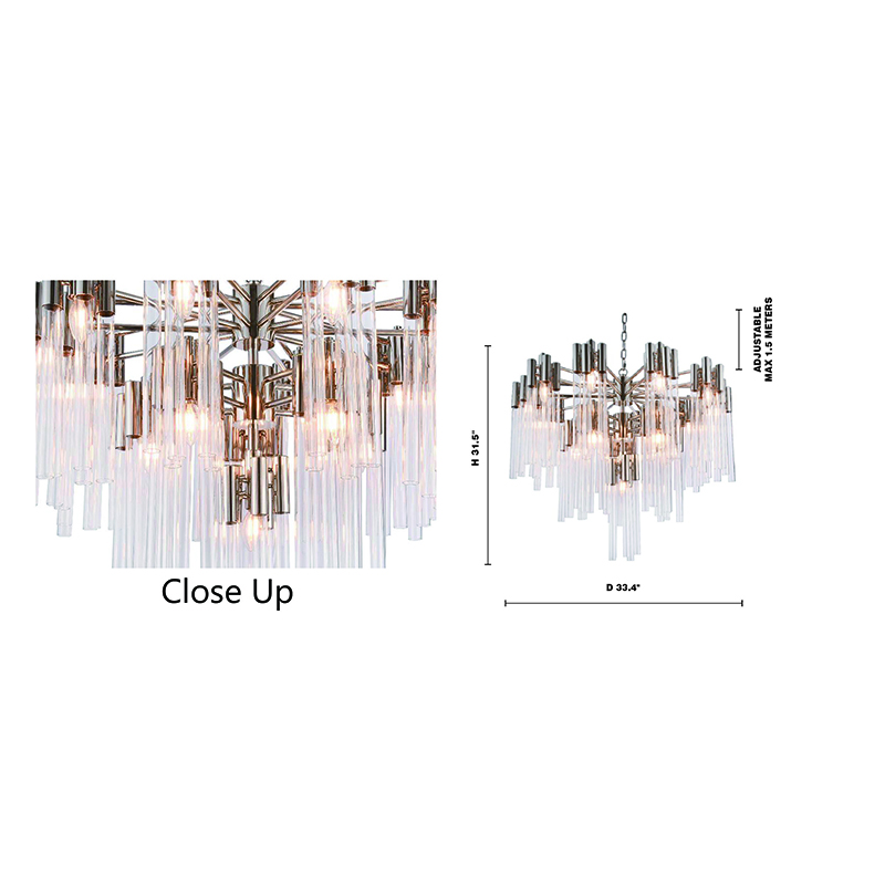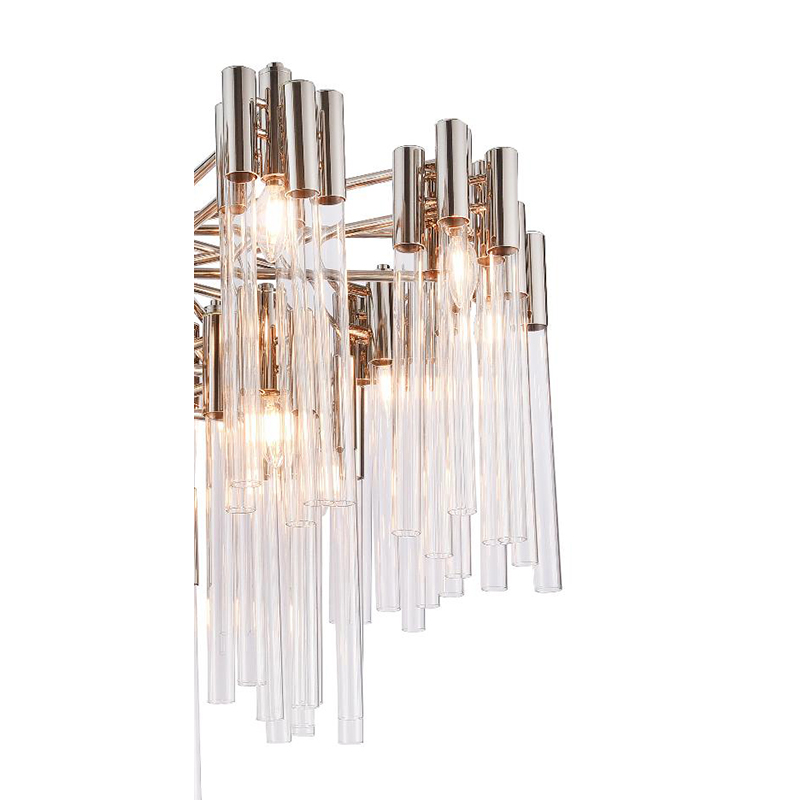 A THREE TIER SHINY NICKEL FRAME CHANDELIER WITH CLEAR GLASS TUBES
